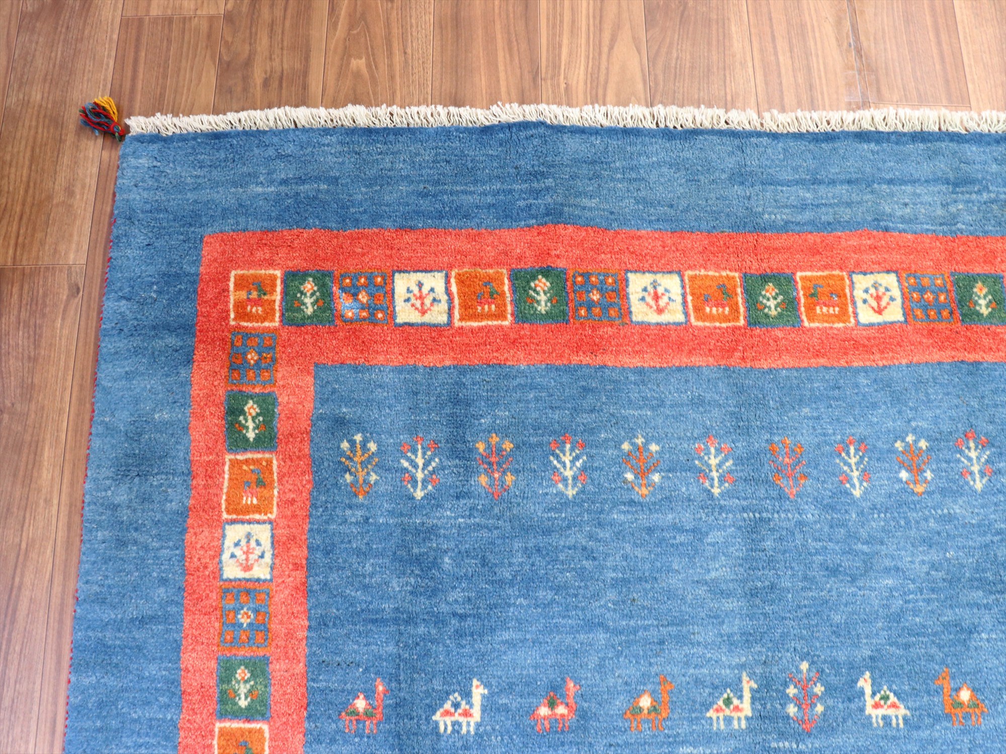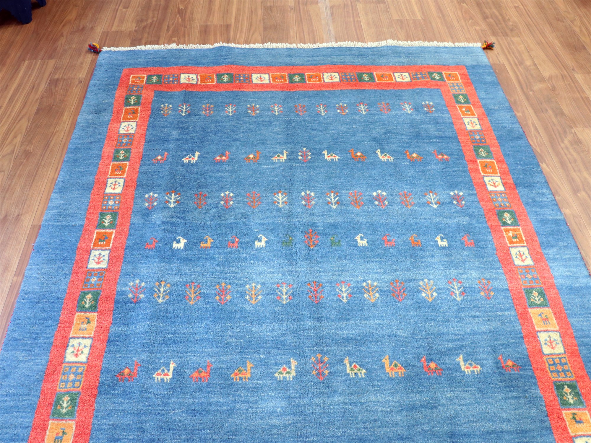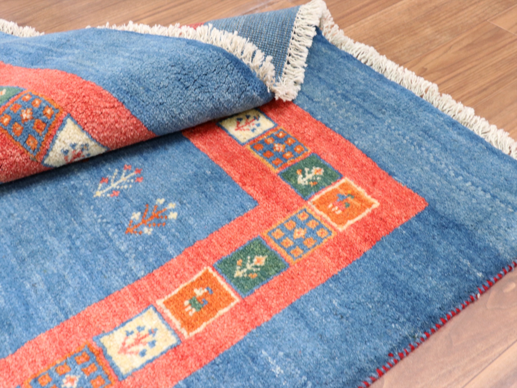| 明るいブルーとレッドのコンビネーションでやさしい印象のギャッベ。同じく明るめのフローリングに合わせると、カジュアルな雰囲気で楽しめそうです。デザインは、動物やラクダなどのモチーフが全面に織り込まれた定番の人気デザイン。昔ながらの素朴な織りです。 |