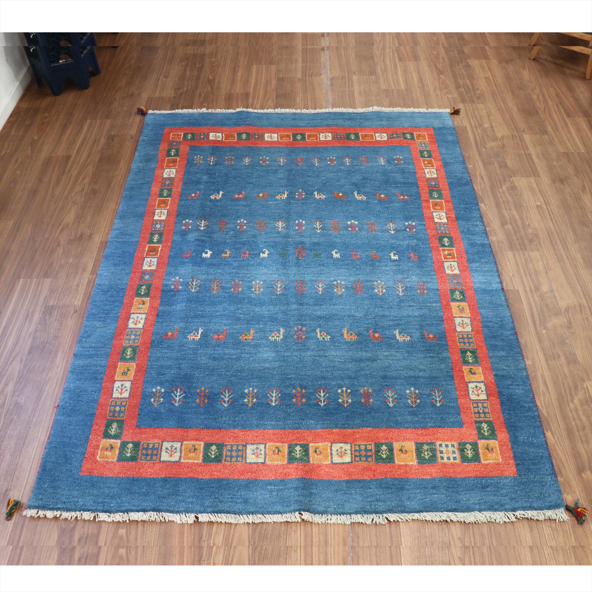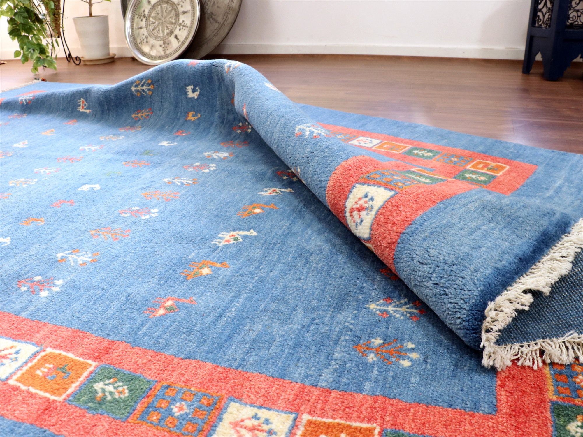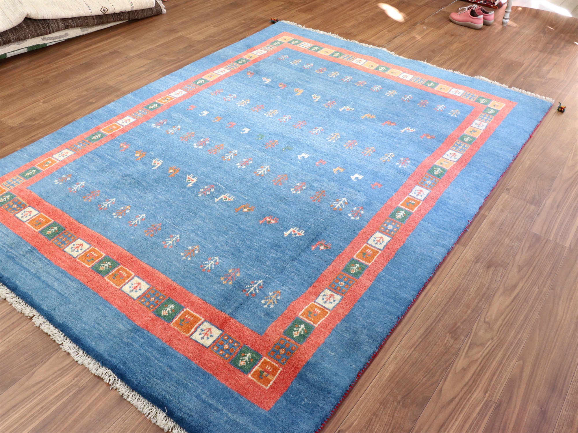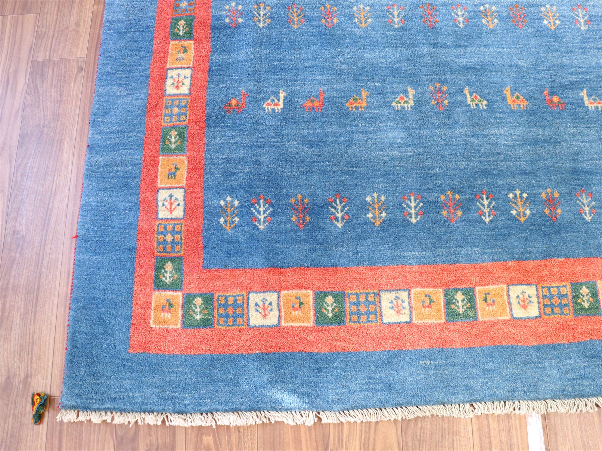 | 明るいブルーとレッドのコンビネーションでやさしい印象のギャッベ。同じく明るめのフローリングに合わせると、カジュアルな雰囲気で楽しめそうです。デザインは、動物やラクダなどのモチーフが全面に織り込まれた定番の人気デザイン。昔ながらの素朴な織りです。 |