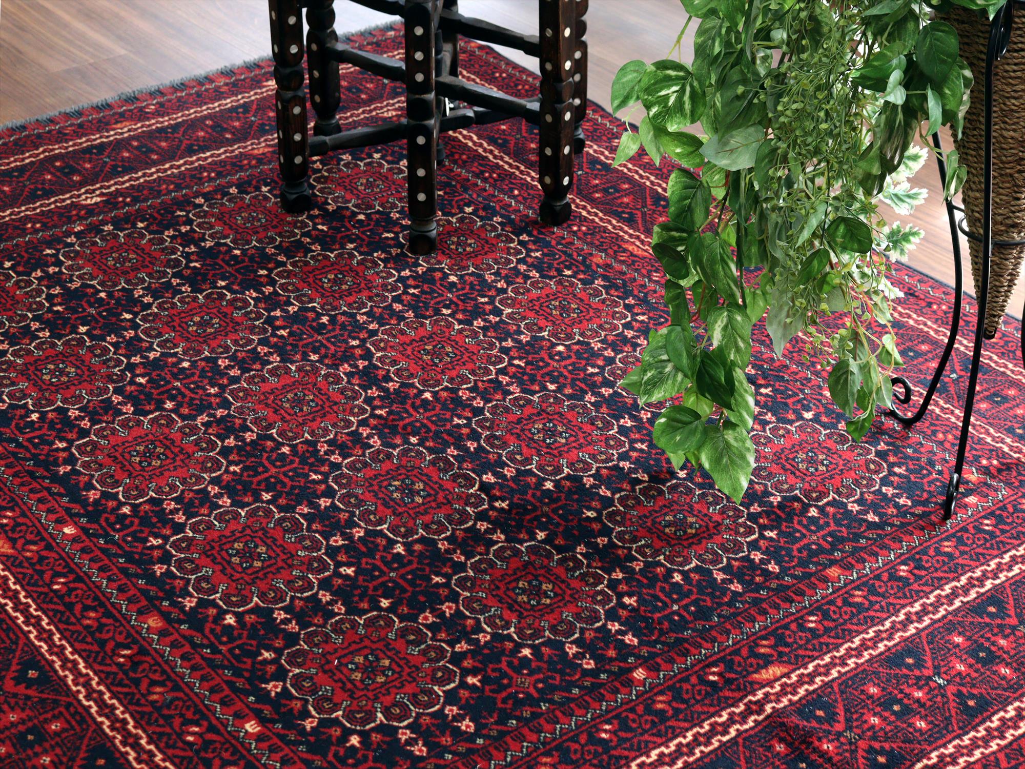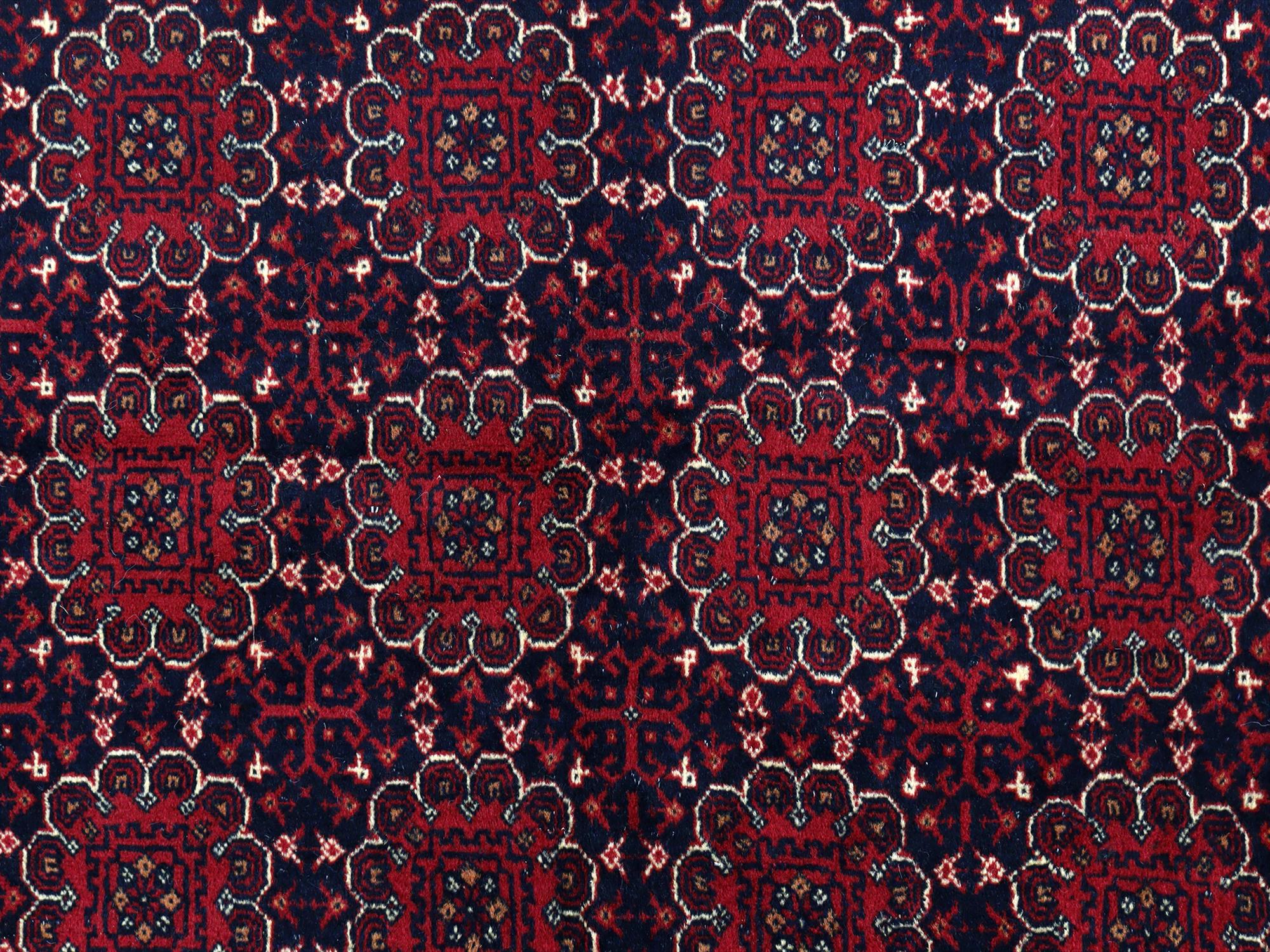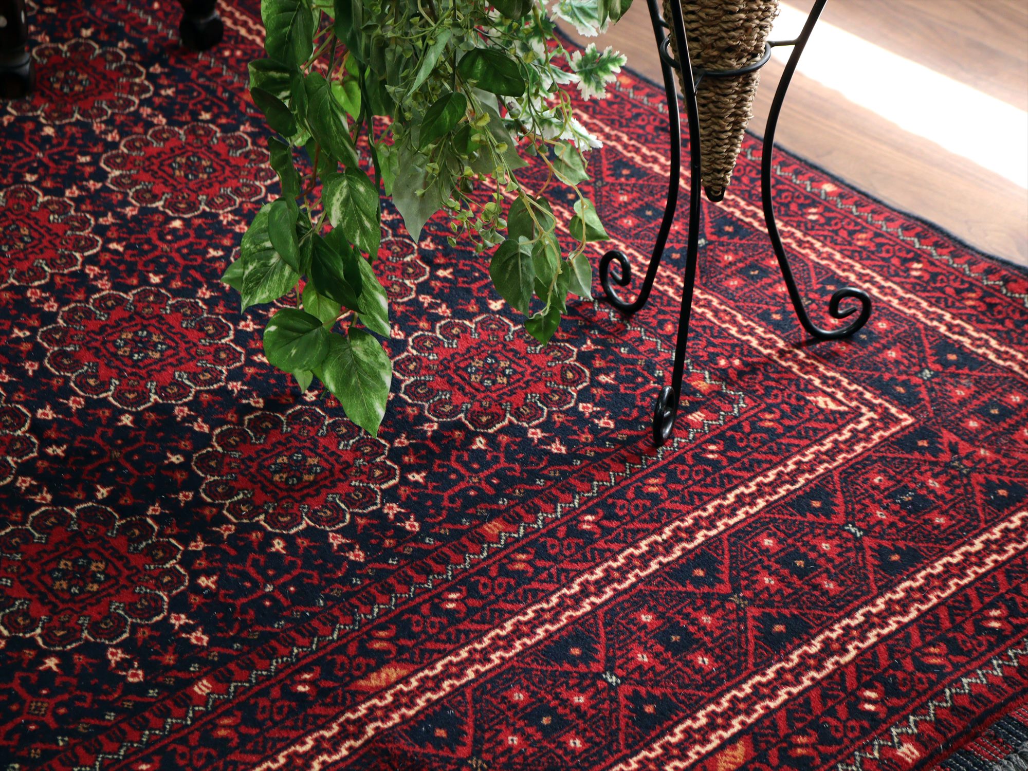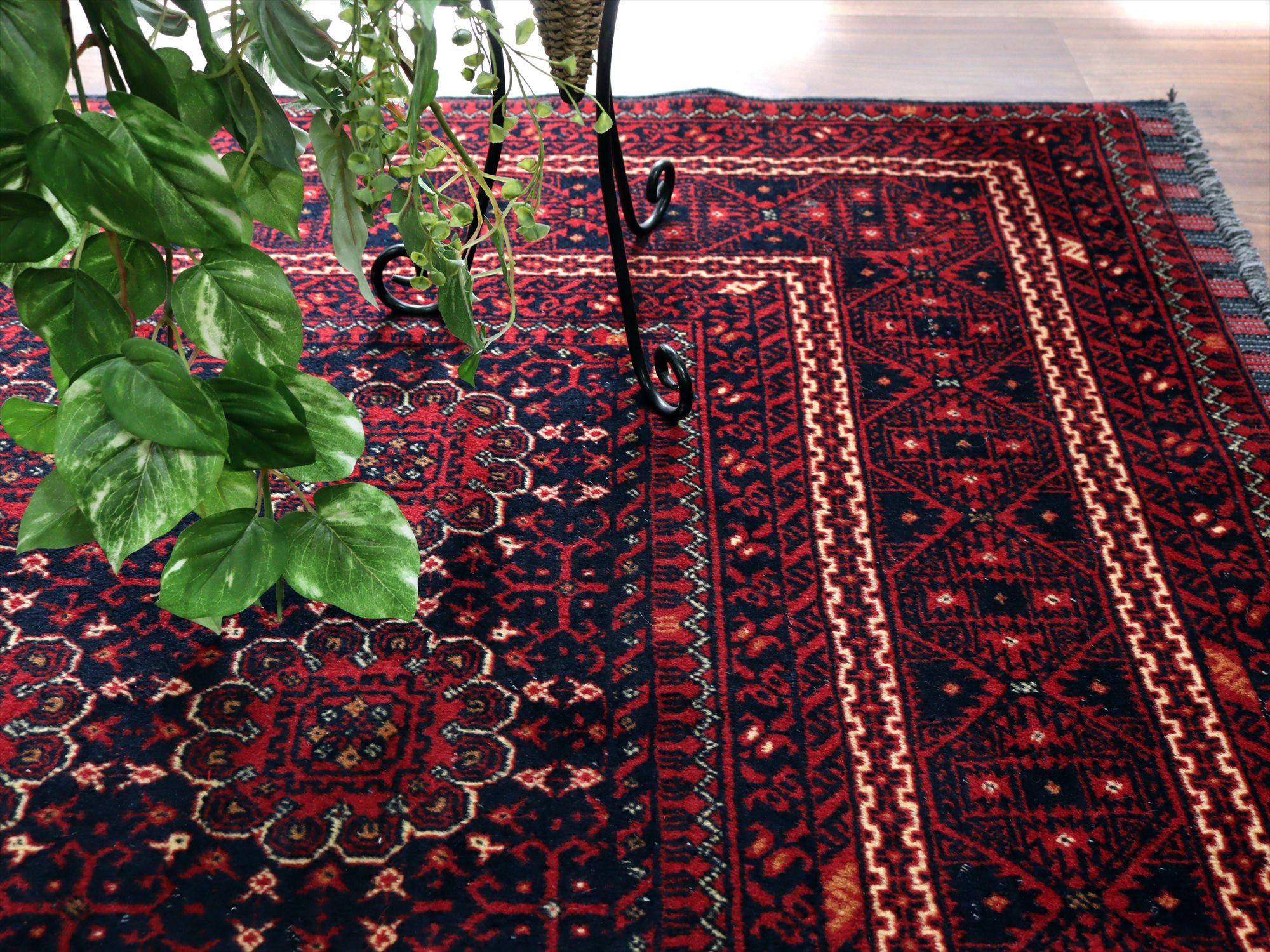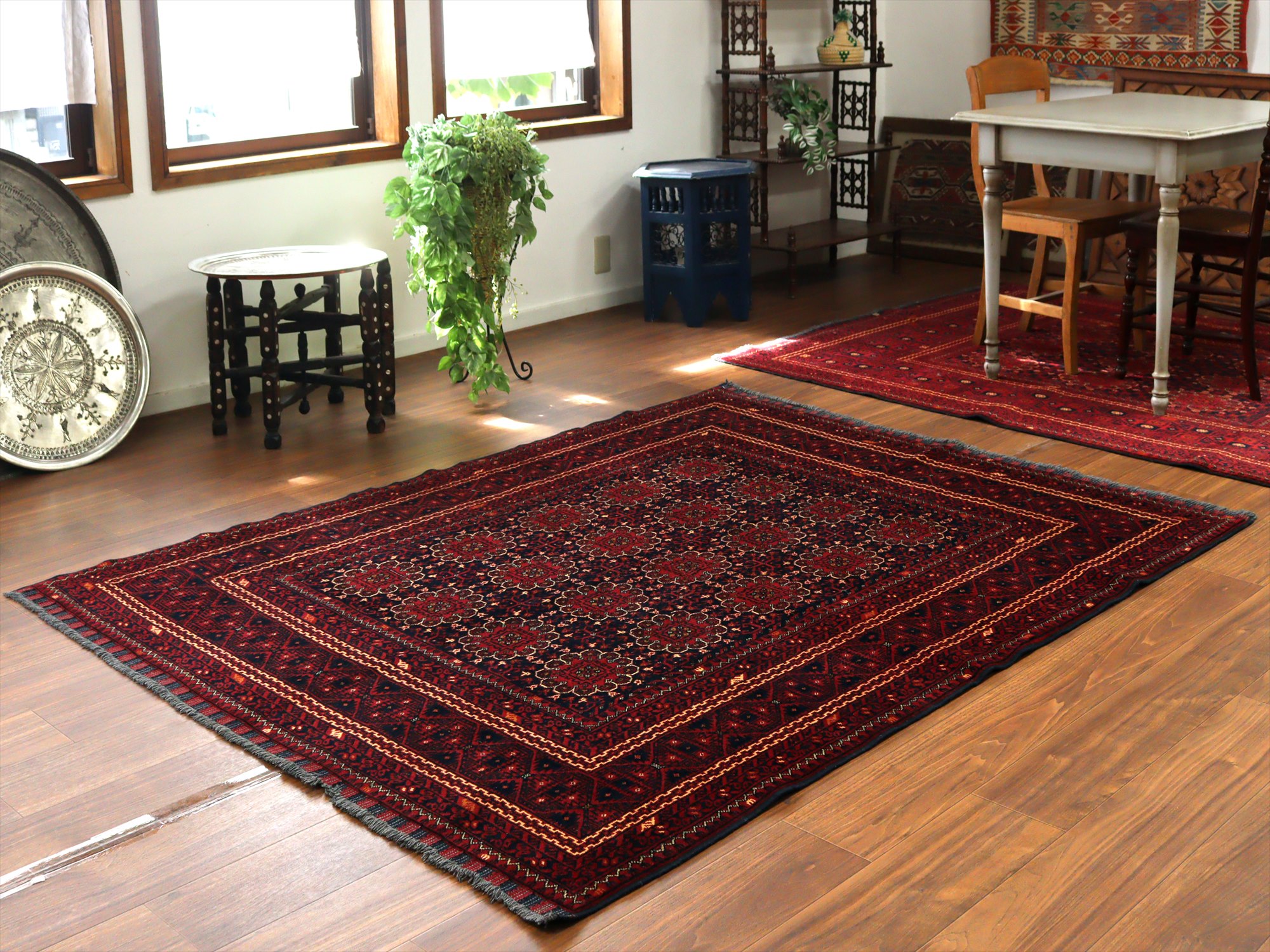 | 光沢のあるビロードのような、滑らかでツヤのある細かな織りの、アフガニスタン北部・クンドゥズ地方で織られた高級絨毯です。トルコのイスタンブールにおいても、ツーリストに大変人気があります。色はとても深い赤で、黒色に見える濃紺との相性は抜群です。 |