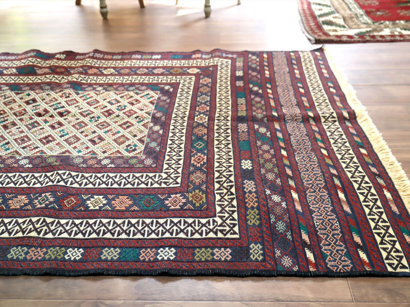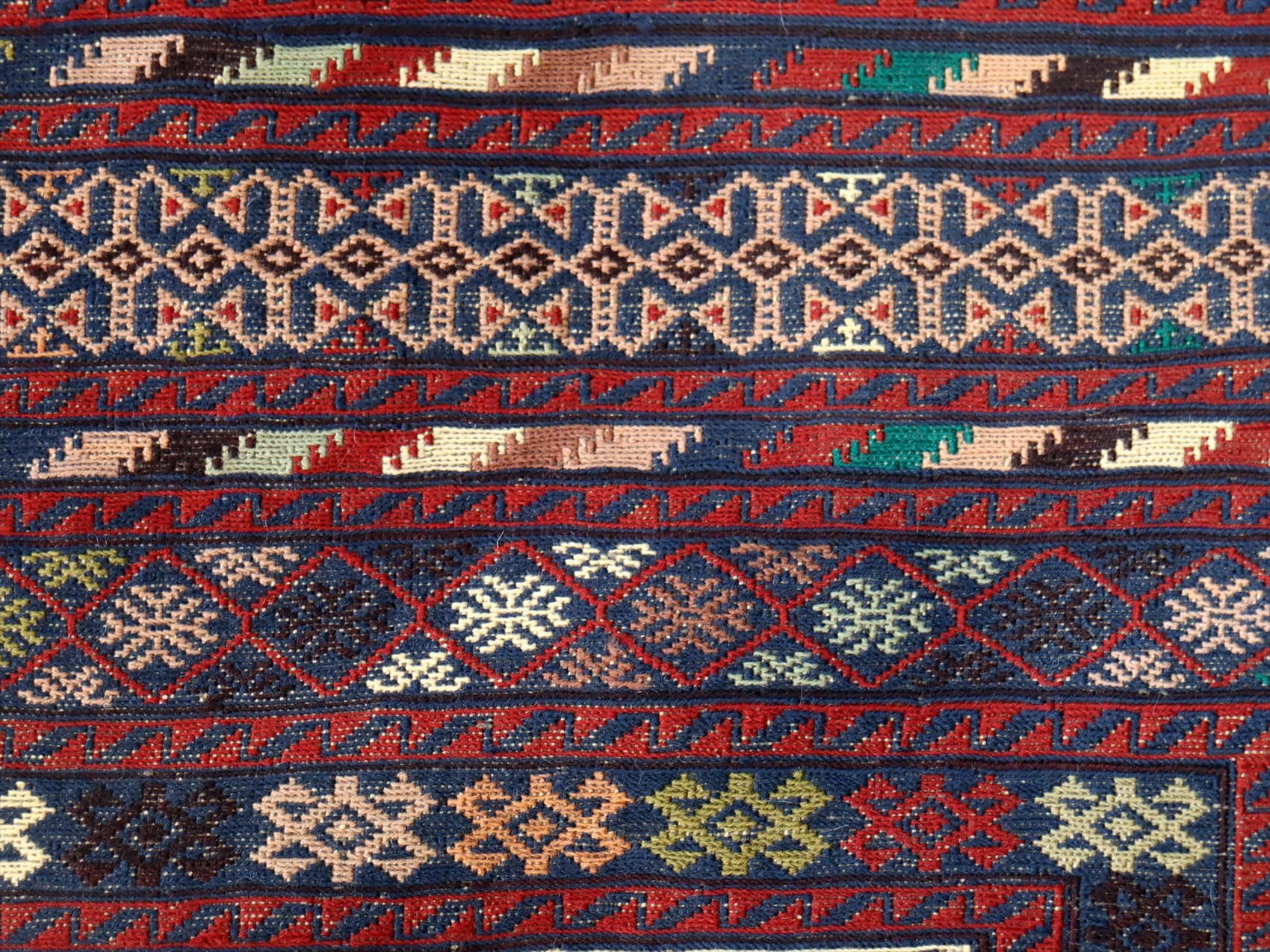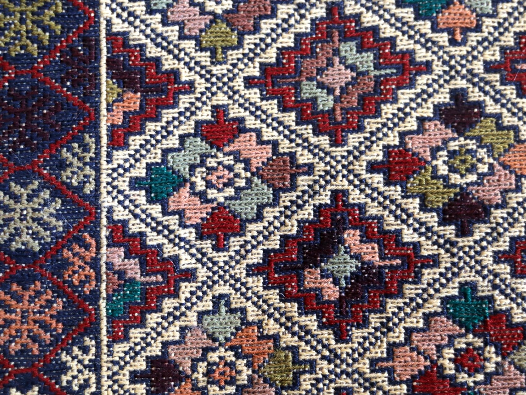 | アフガニスタン東部、イランと国境を接するエリアのスマックキリムです。 表面は刺繍のように見えますが、これは後から刺したものではなく、キリムを織るときに、縦糸と横糸のほかにもう一本飾り糸を前後しながら絡めて織ってゆくスマックという技法です。もちろん、通常のキリムよりも織る手間がかかりますから、それだけ高価なものということになりますが、実物をごらんになれば、お値段以上に価値あるものと満足していただけることと思います。 |