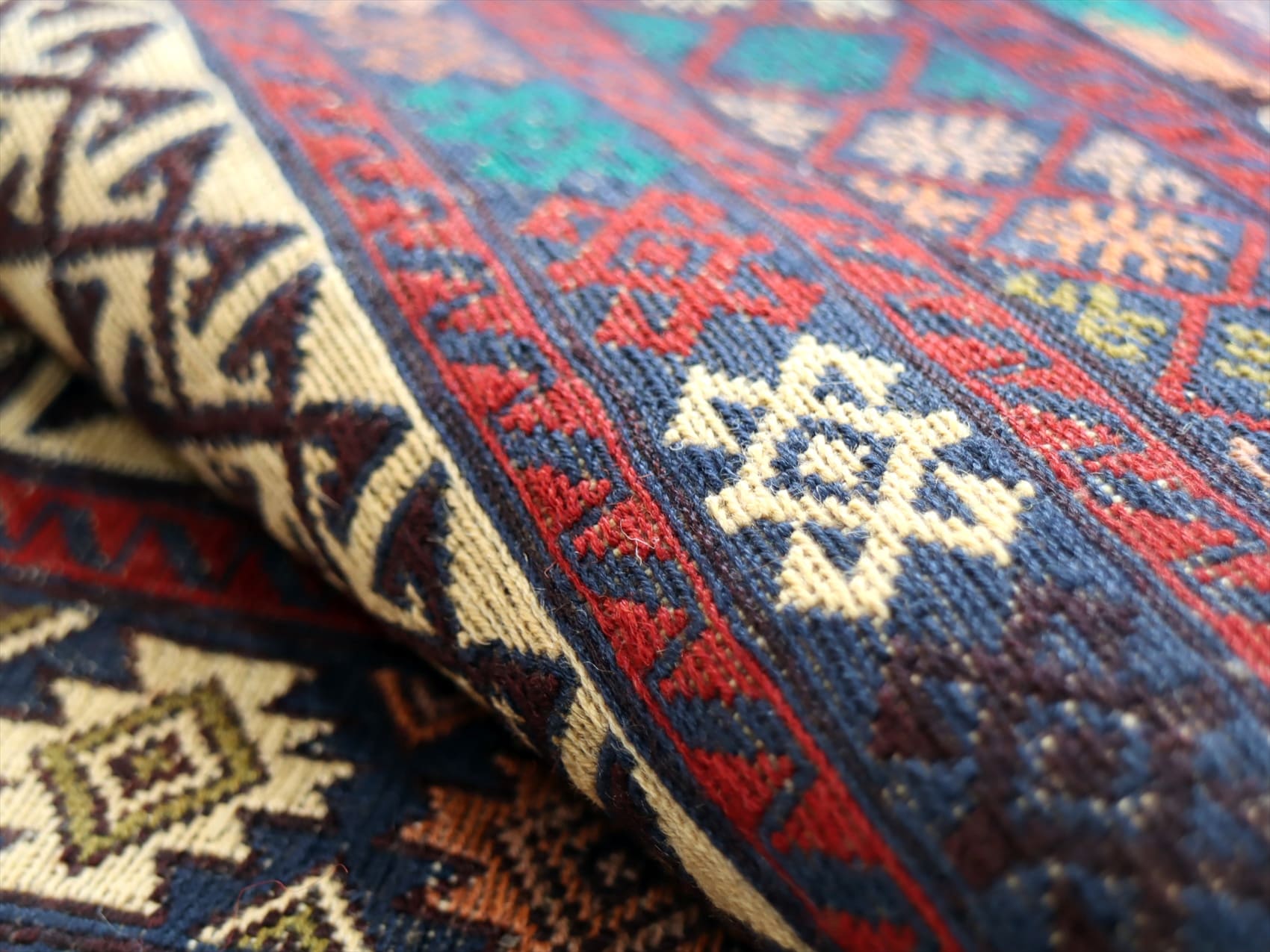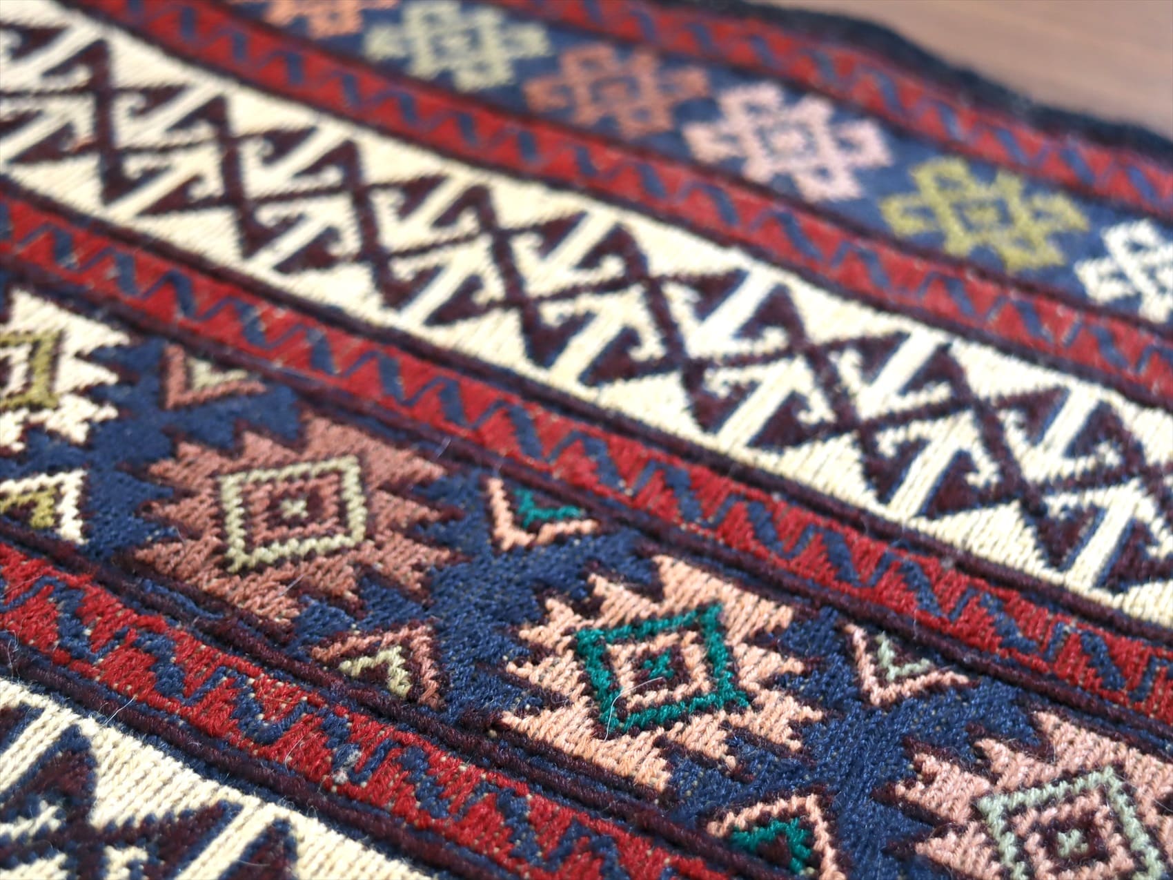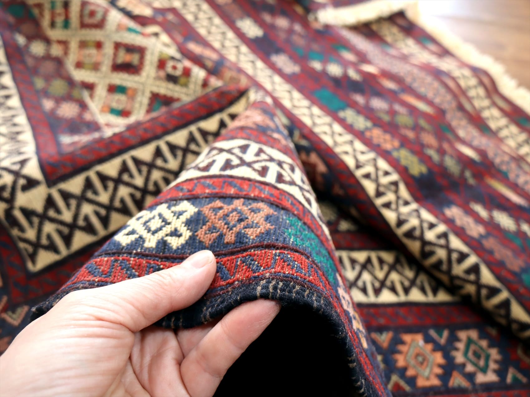 | アフガニスタン東部、イランと国境を接するエリアのスマックキリムです。 表面は刺繍のように見えますが、これは後から刺したものではなく、キリムを織るときに、縦糸と横糸のほかにもう一本飾り糸を前後しながら絡めて織ってゆくスマックという技法です。もちろん、通常のキリムよりも織る手間がかかりますから、それだけ高価なものということになりますが、実物をごらんになれば、お値段以上に価値あるものと満足していただけることと思います。 |