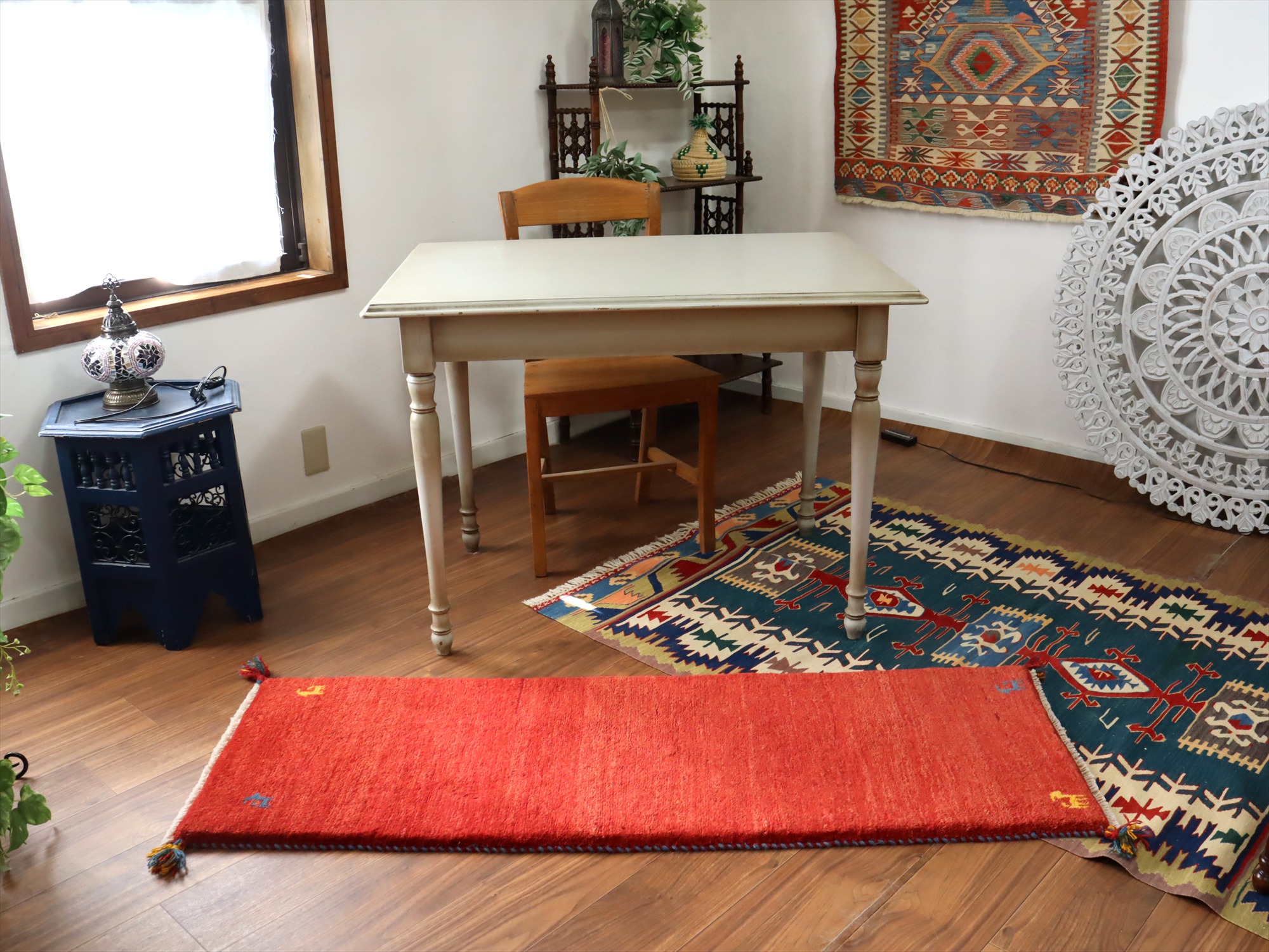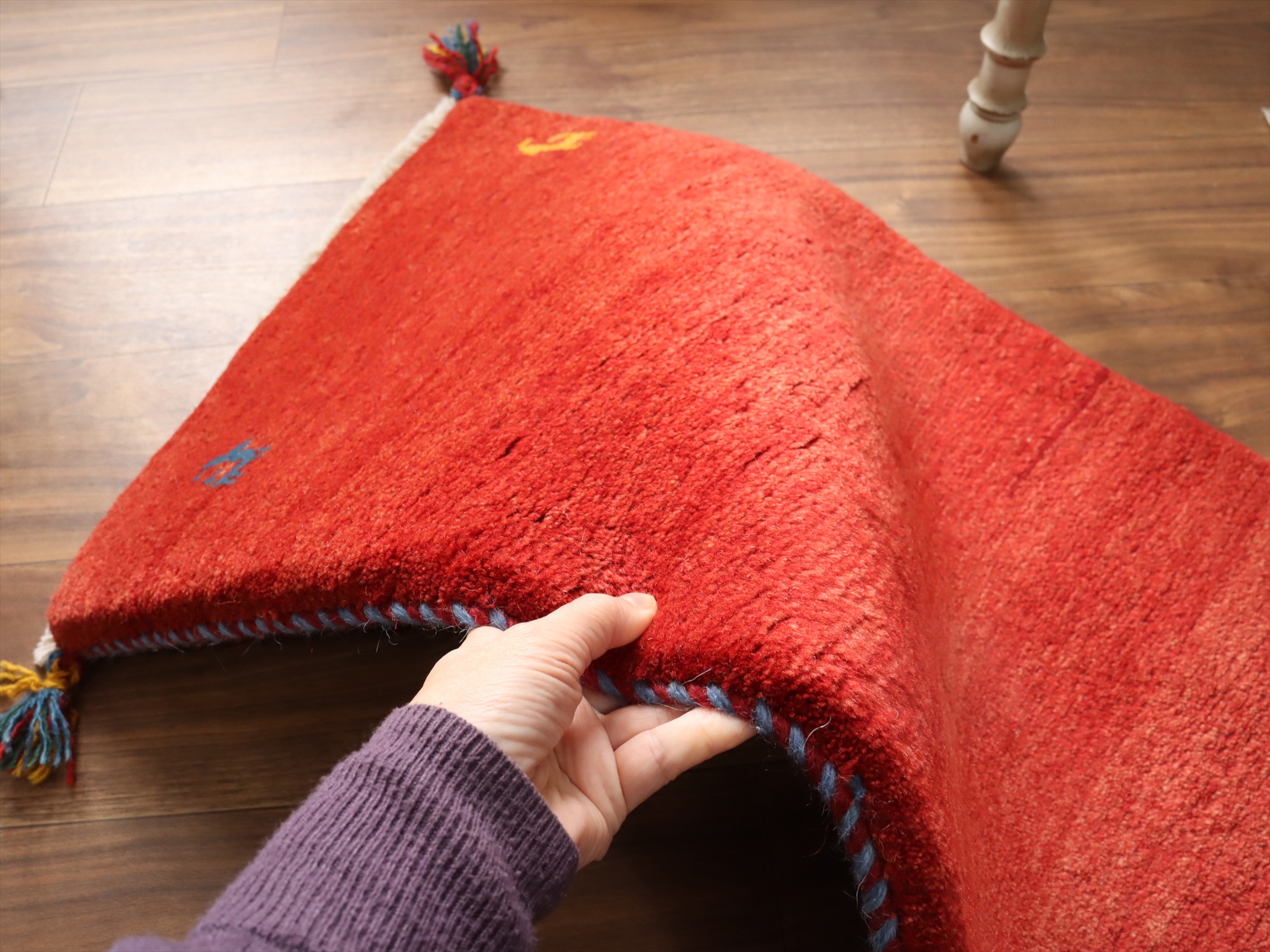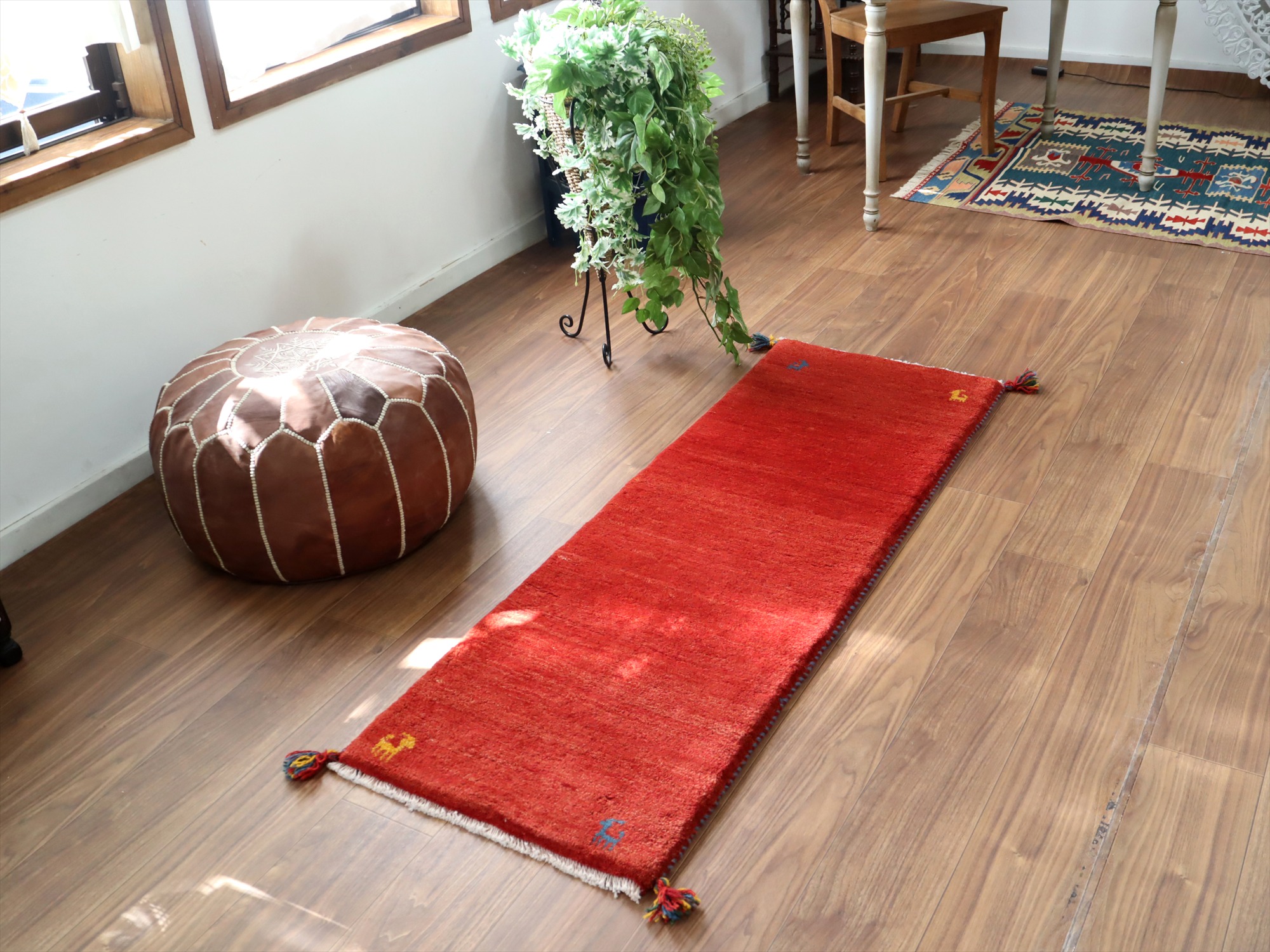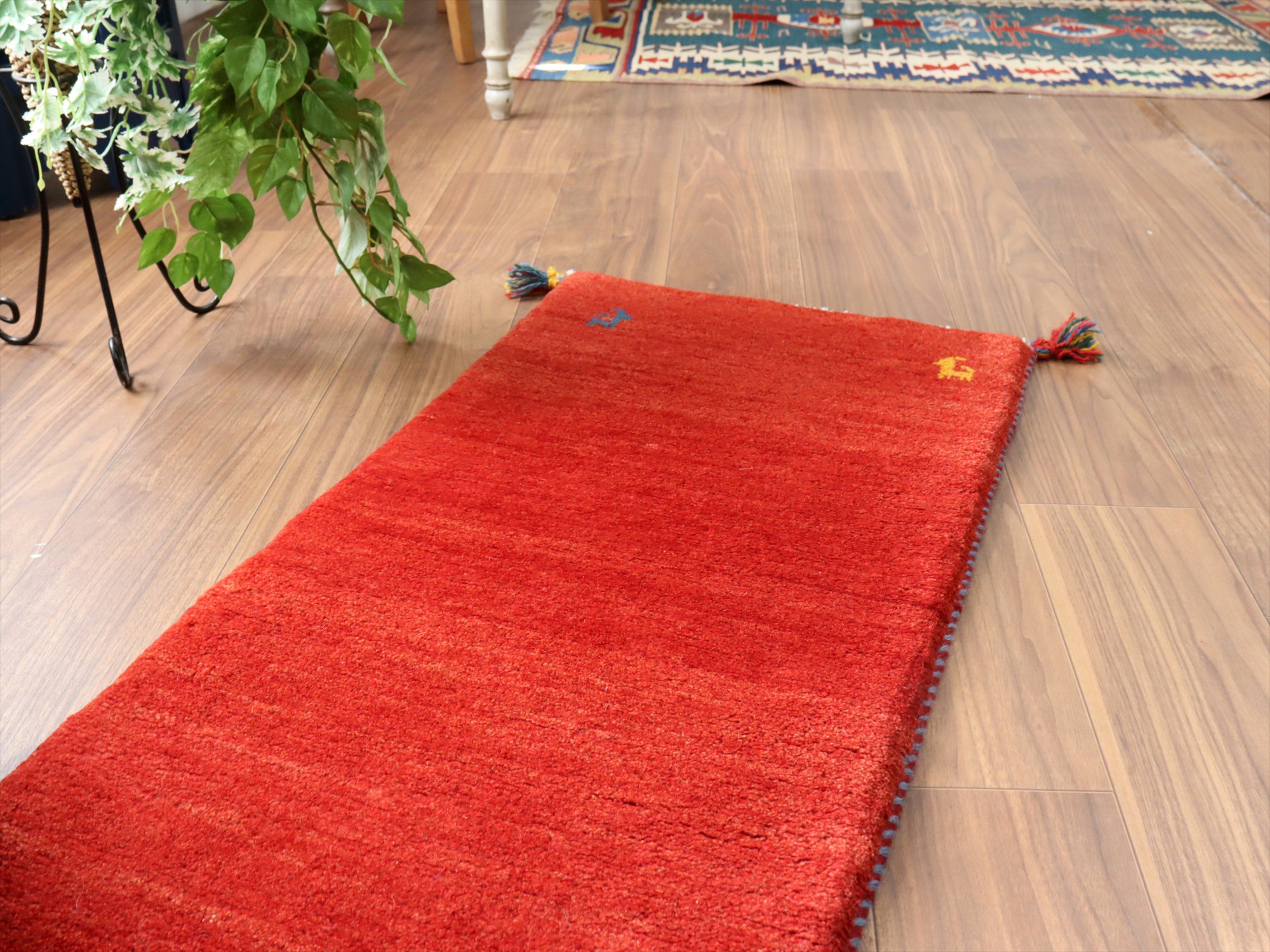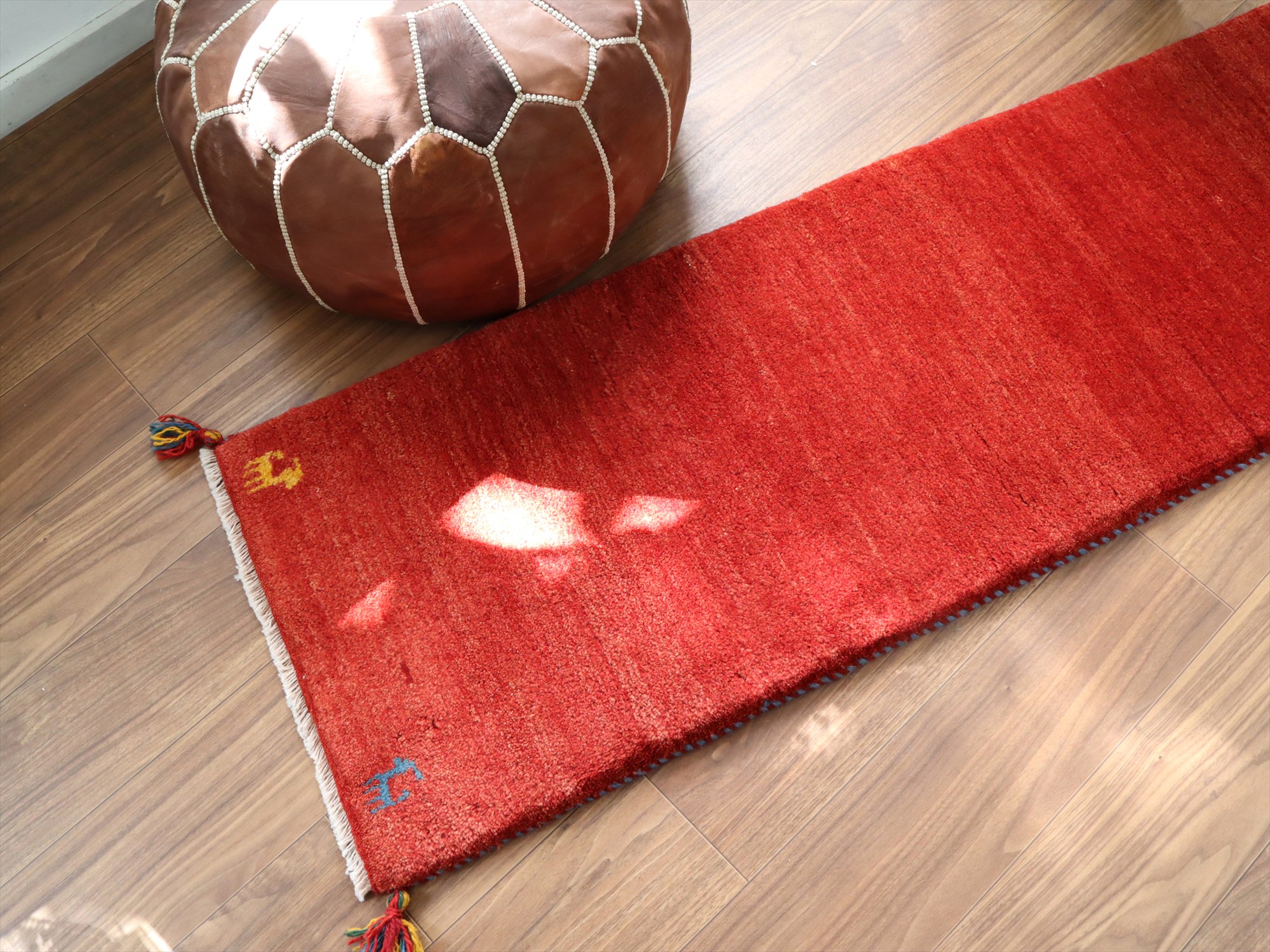 ギャッベ イラン 手織り 細長ランナー 146x50cm レッド シンプル 無地