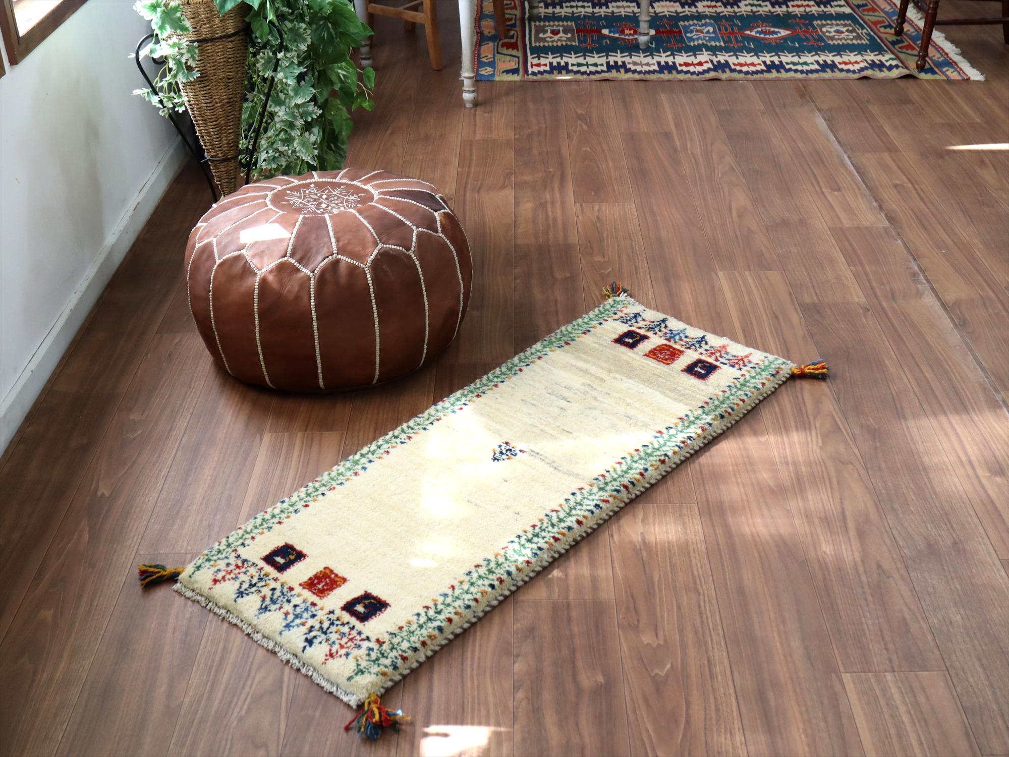 ギャッベ イラン 手織り ミニランナー 115x43cm ナチュラル羊毛アイボリー タイル柄