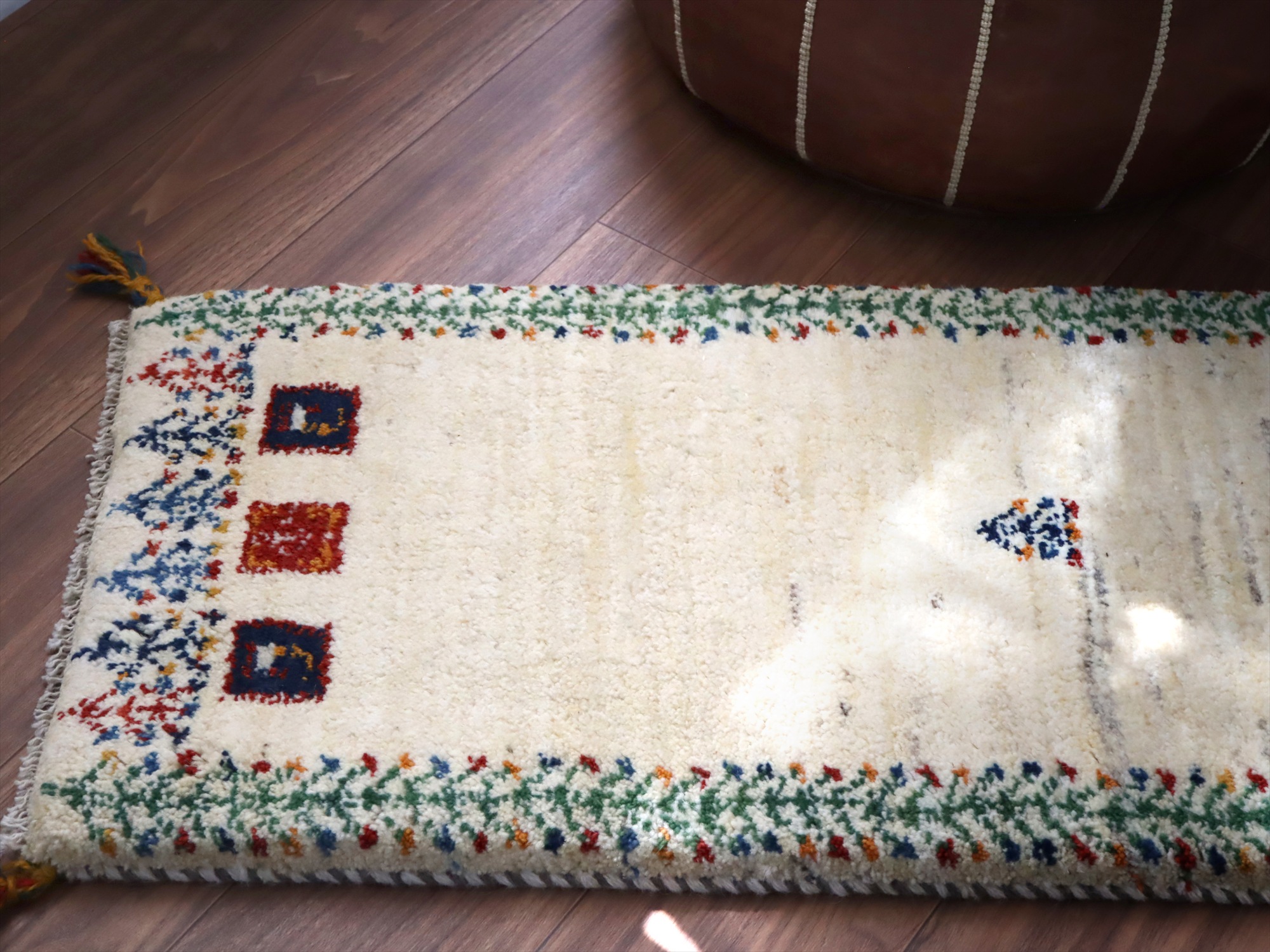 - ギャッベ イラン 手織り ミニランナー 115x43cm ナチュラル羊毛アイボリー タイル柄
