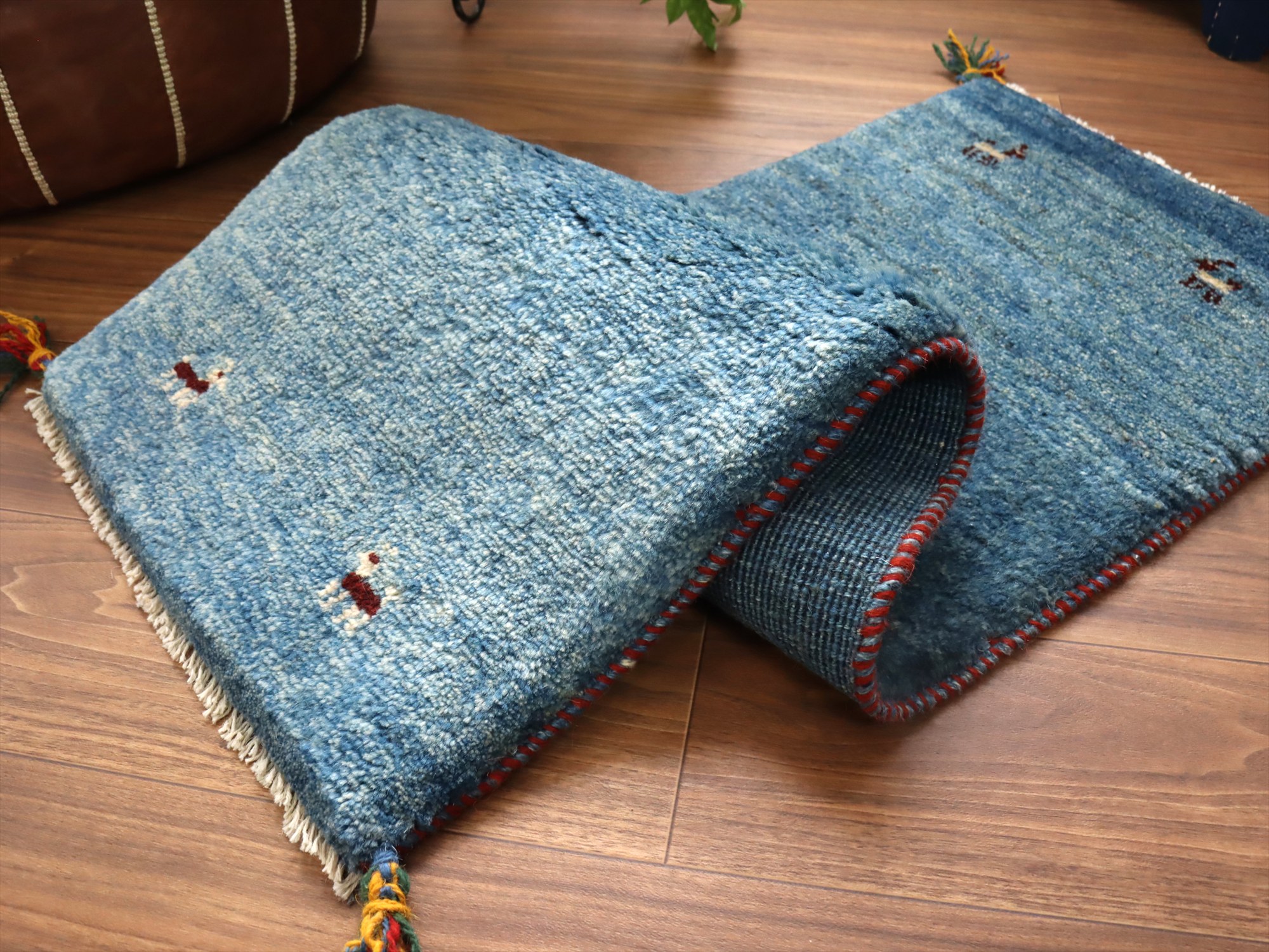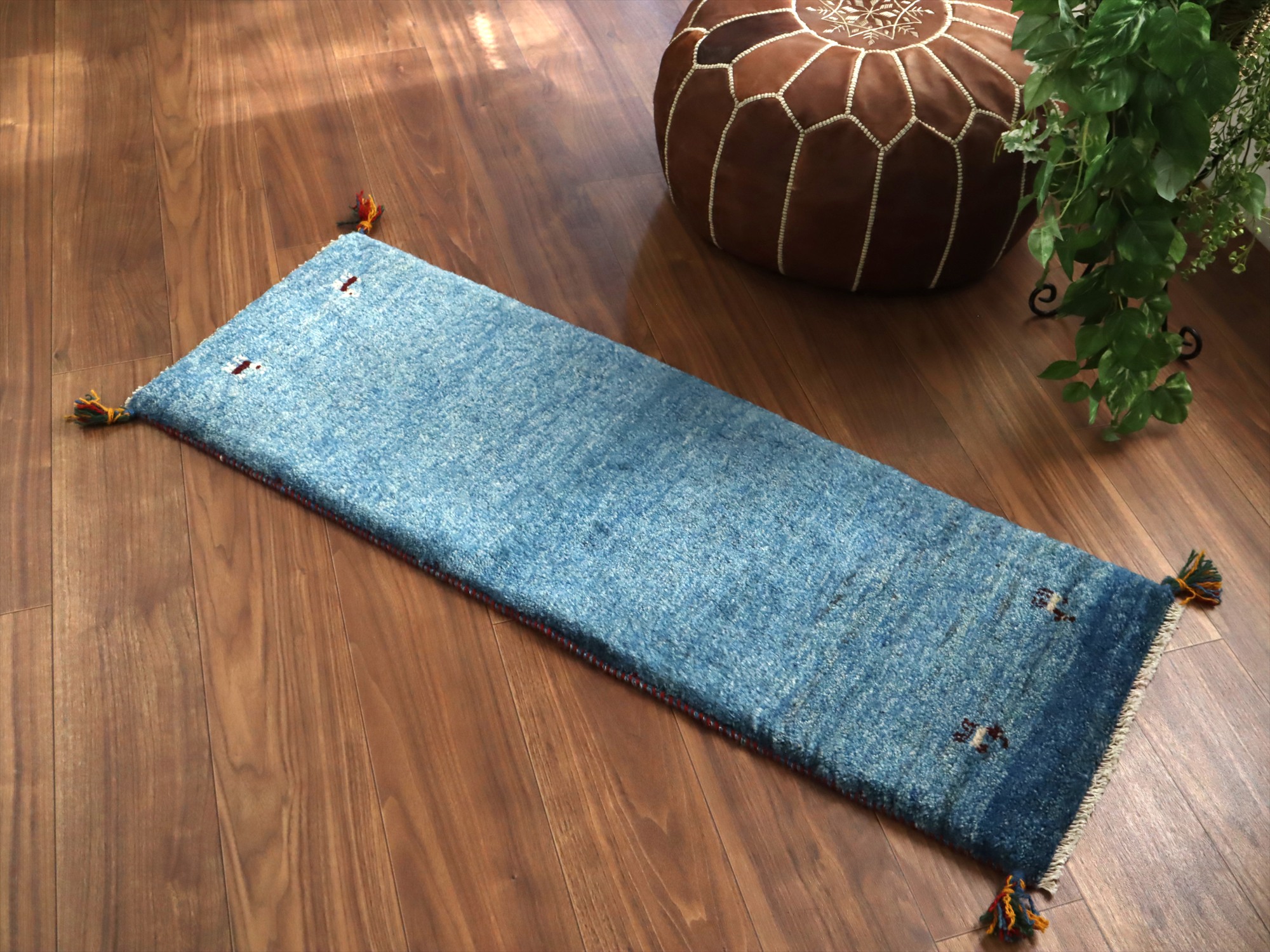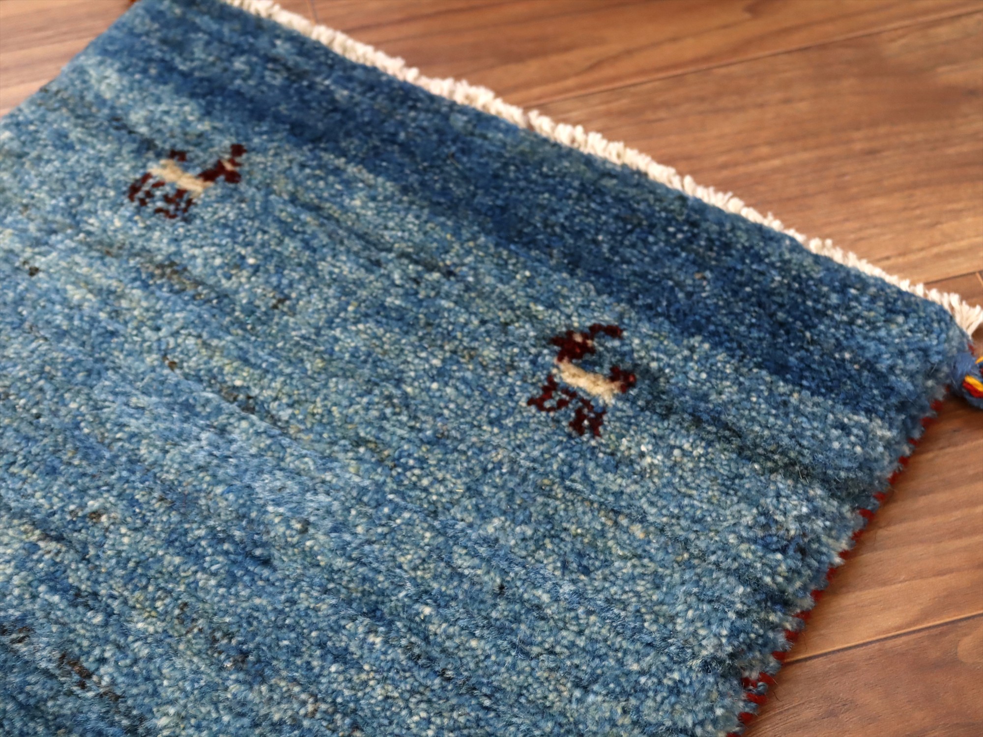 - ギャッベ イラン 手織り ミニランナー 120x42cm ブルー 自然な色ムラ シンプル 無地