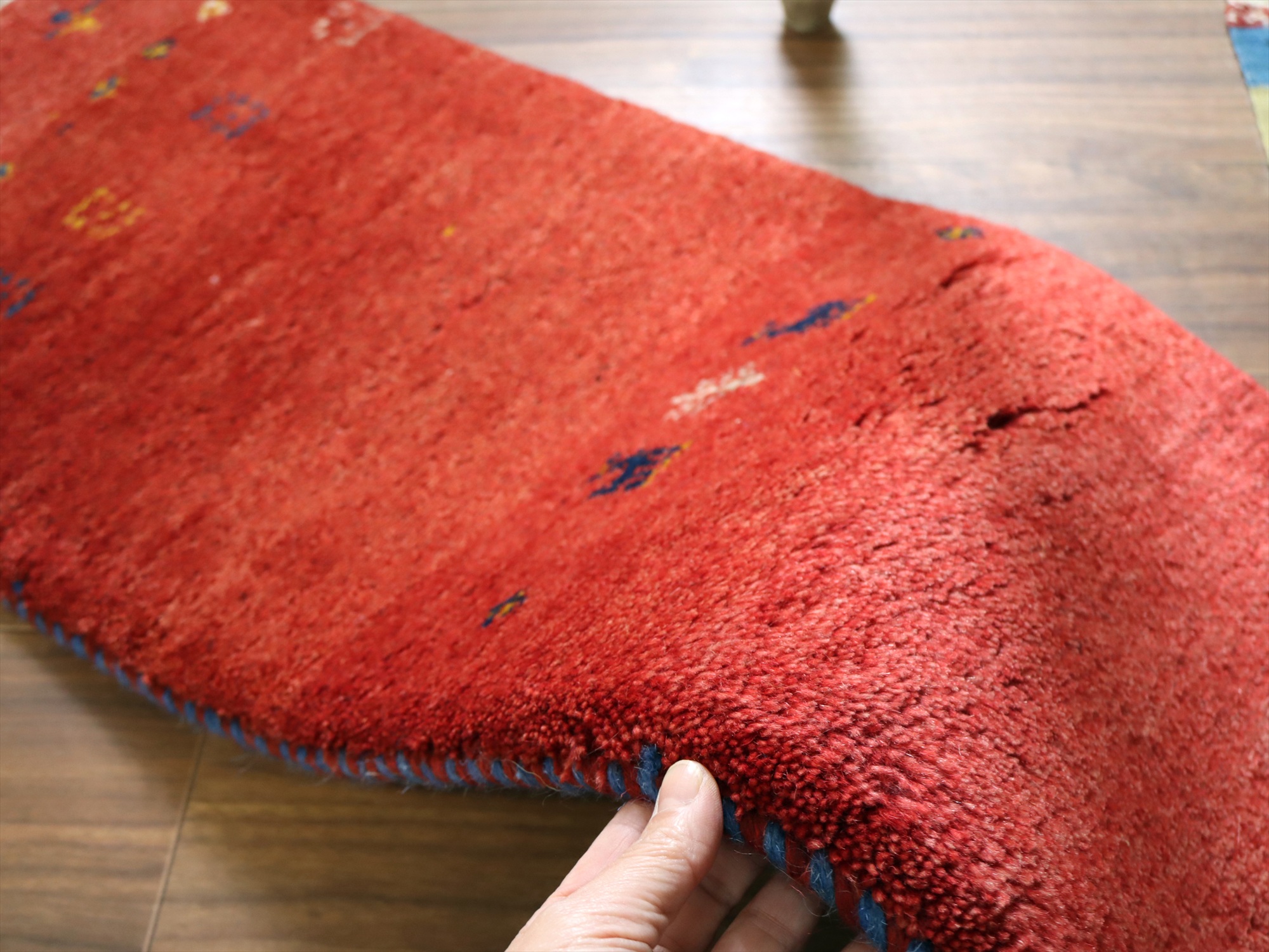 | 毛足が長くボリュームあるふっくらとした織り地のギャッベ。パイル(毛足)を含めた厚みは2.3-2.4cmほどで、分厚いという表現がぴったりの手織り絨毯です。 |