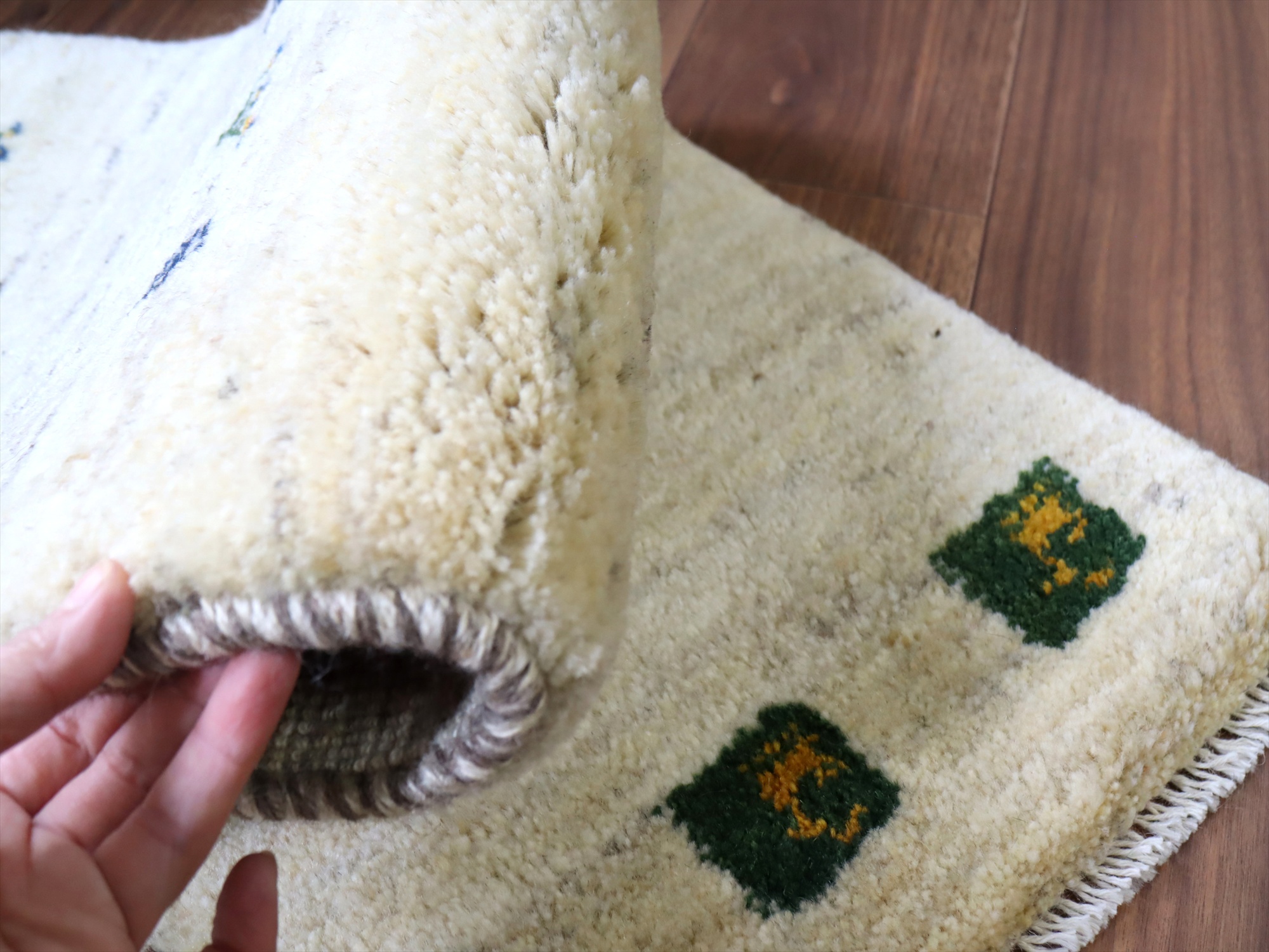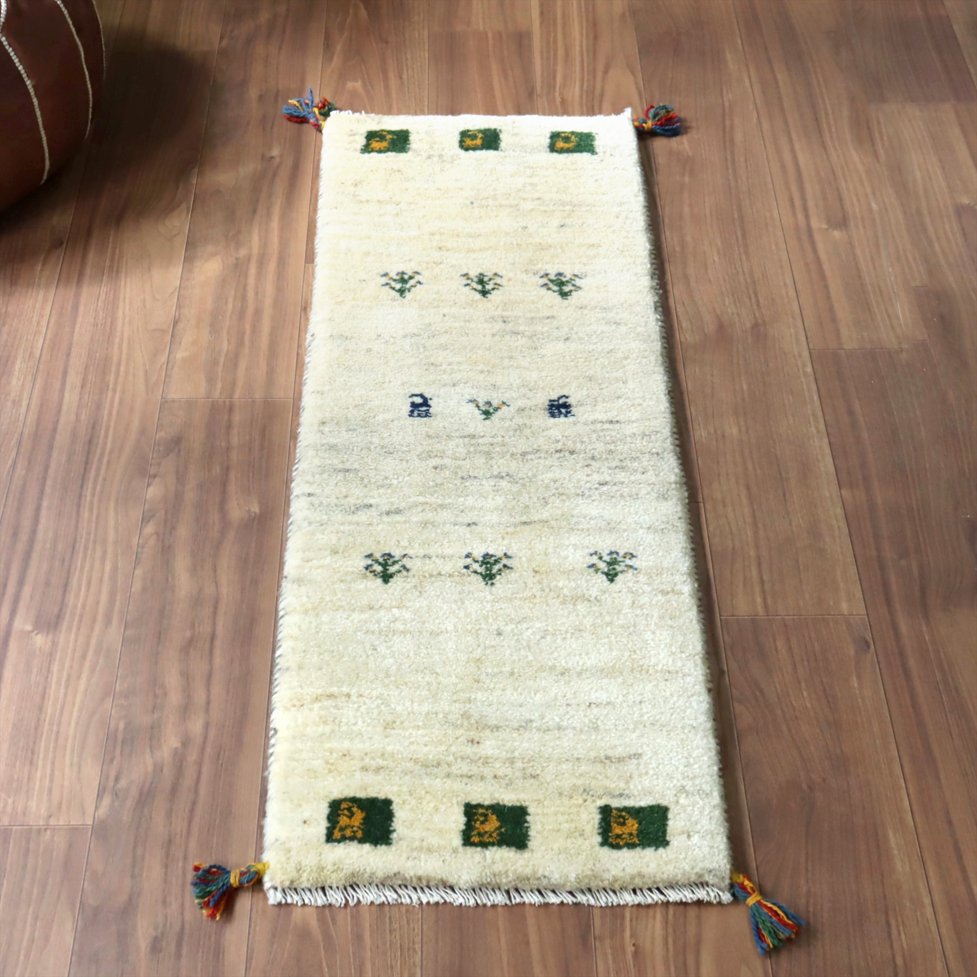 - ギャッベ イラン 手織り ミニランナー 115x43cm ナチュラル羊毛 アイボリー 生命の木と動物