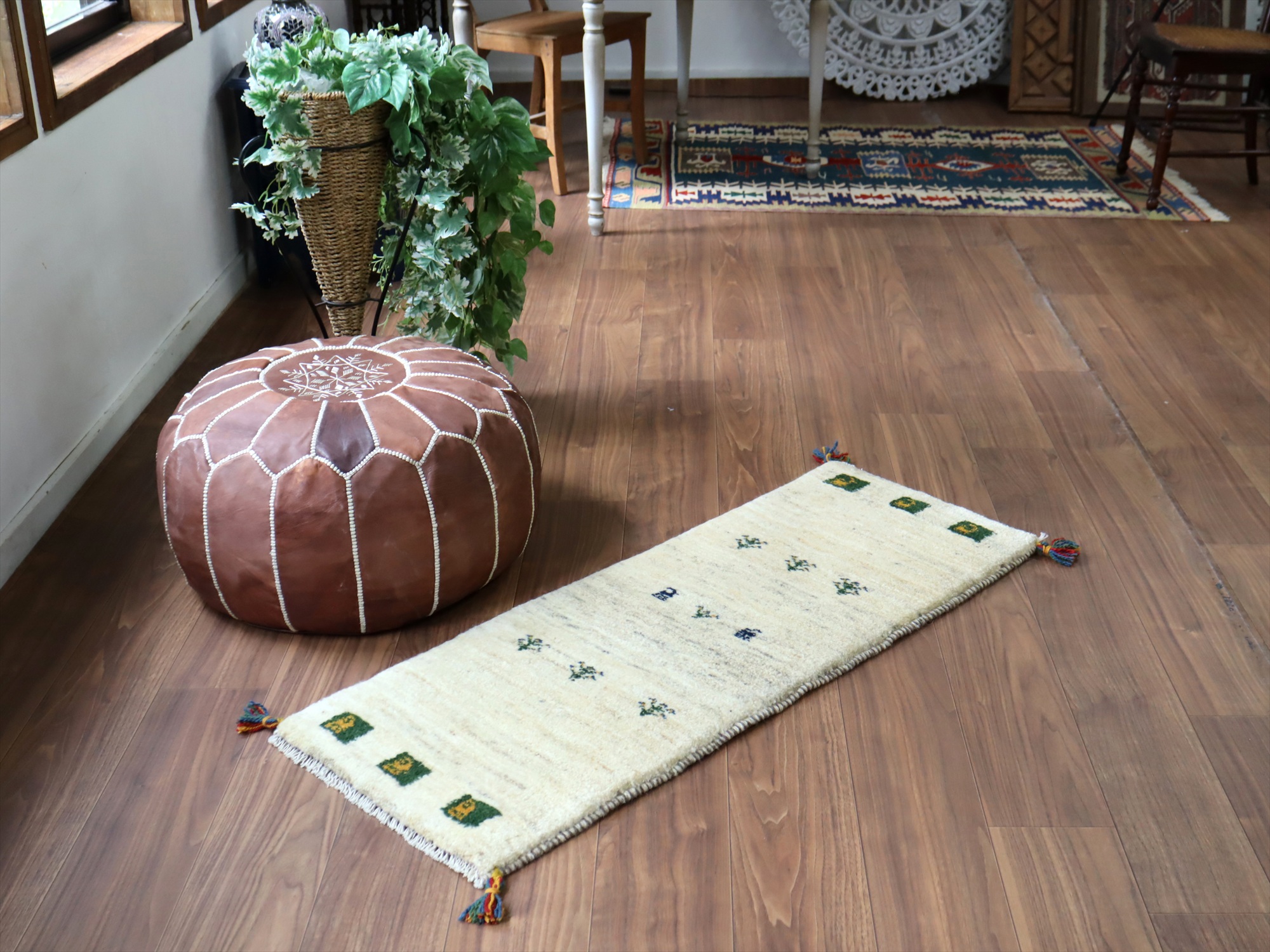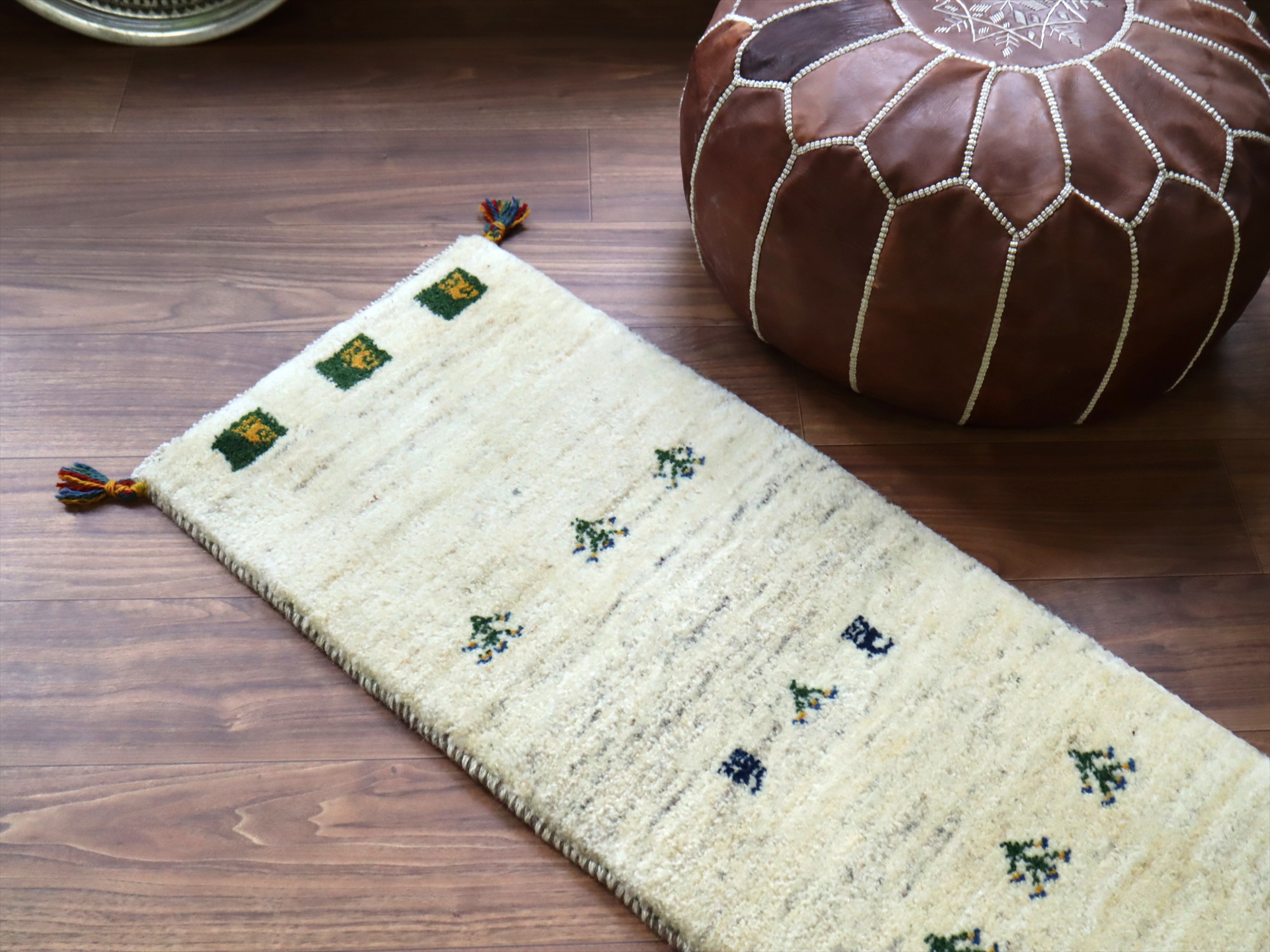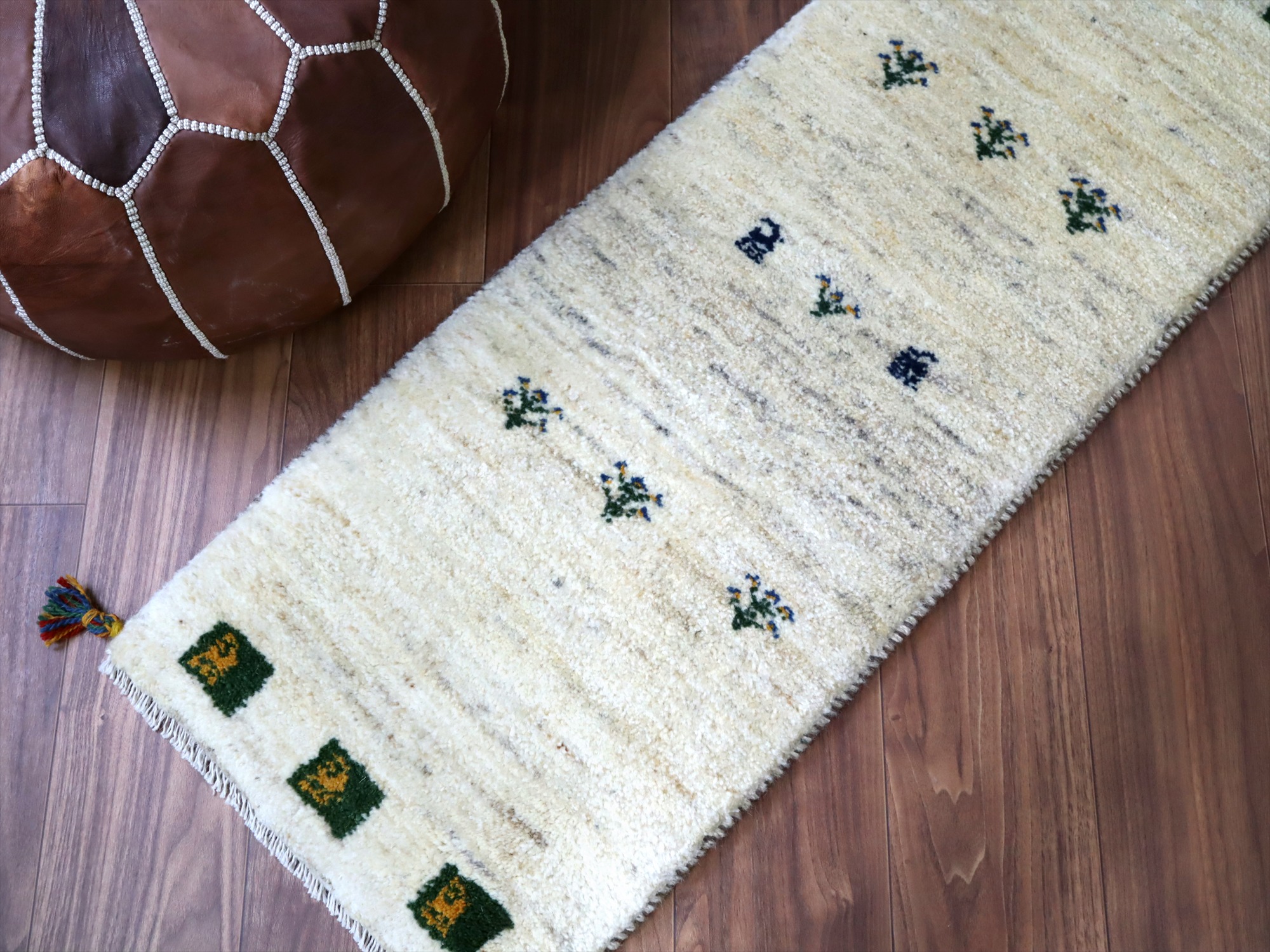 ギャッベ イラン 手織り ミニランナー 115x43cm ナチュラル羊毛 アイボリー 生命の木と動物