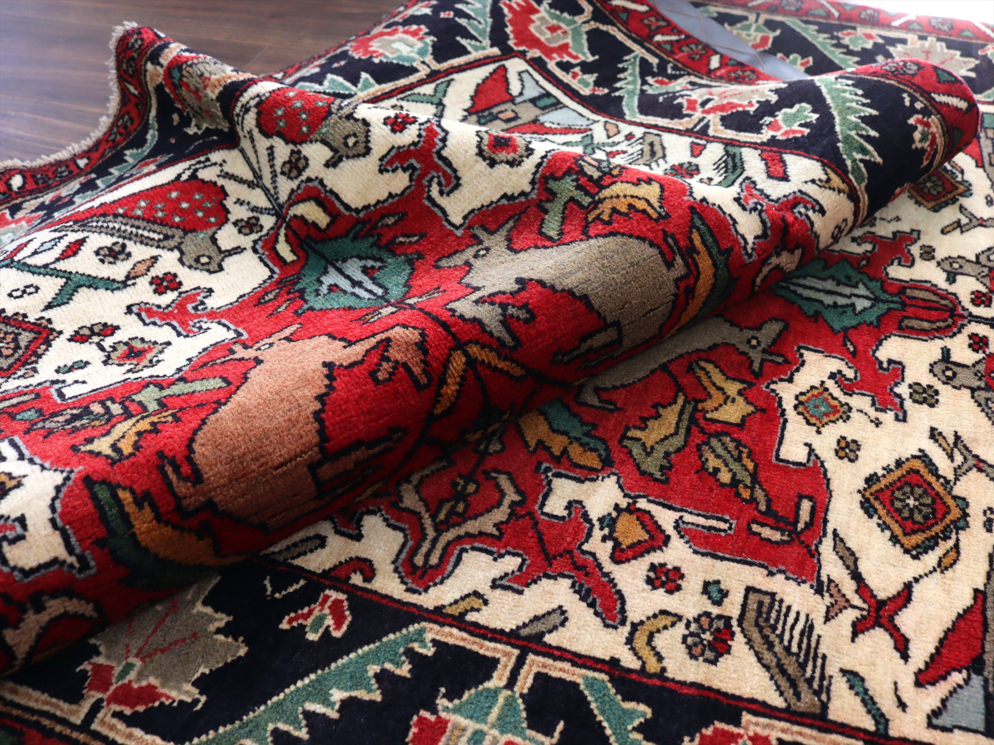 | センターはアイボリーベースに動物が織られた花形のメダリオン、額縁部分にはネイビーに花が連なるように織られたデザイン。鳥もデザインに馴染むように織られているようです。 |