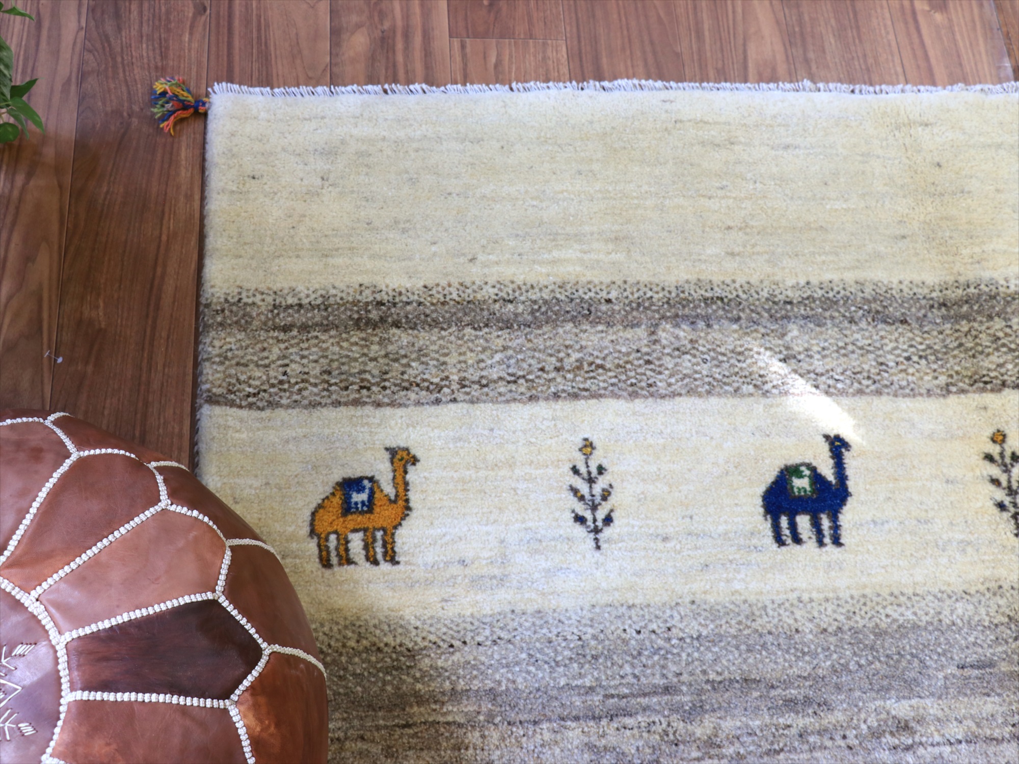 | 染めていない天然の羊毛の色をいかして織られたアイボリーとグレーのギャッベです。中央には木の葉のような生命の木と小さな動物たち、上下には鞍をのせたラクダのキャラバンが織り込まれています。 羊毛の色は、自然な濃淡が出ていて、ナチュラルなやさしい雰囲気です。パイル(毛足)の方向によって、明るく白っぽく見える側と逆に濃いベージュに見える側があります。 |