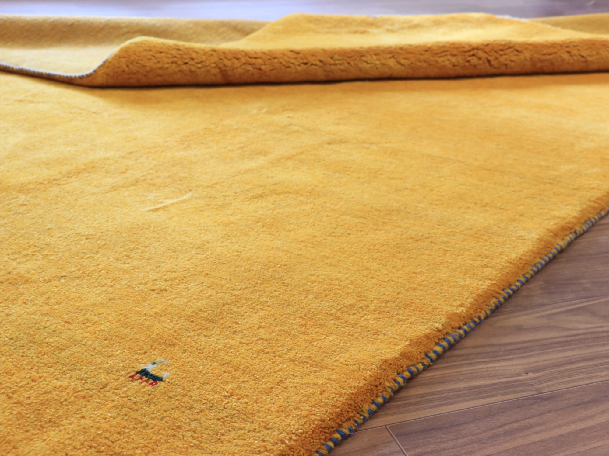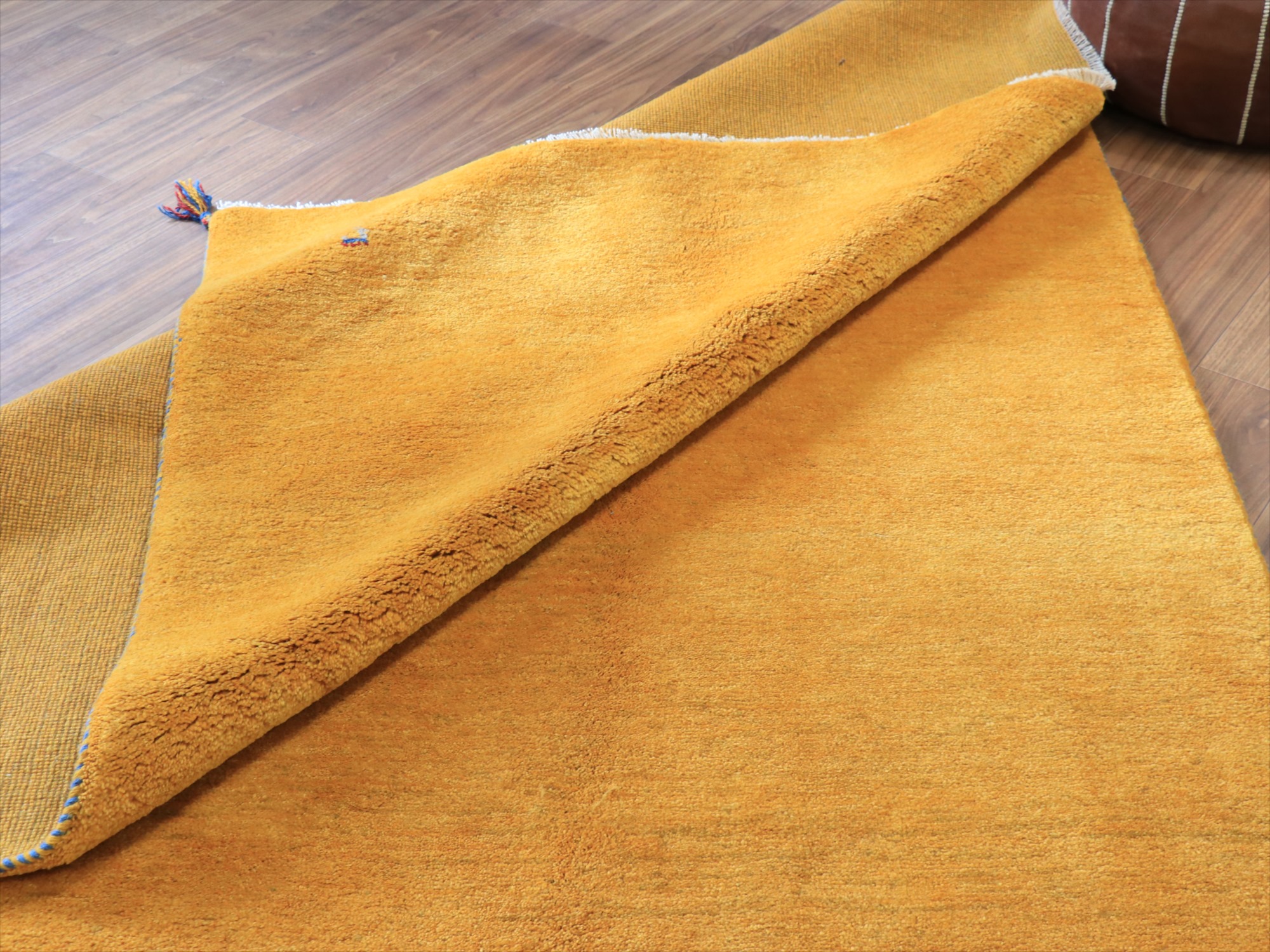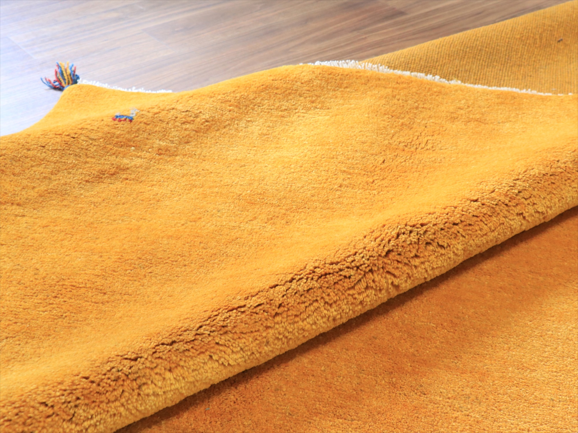 | 毛足が長く、パイルを含めたギャッベ全体の厚みは2.2-2.3cm程度。ボリューム感たっぷりのふかふかギャッベです。 手で紡いだ毛糸を、天然の染料で染め上げ、丁寧に織り込まれた伝統的なギャッベです。イエロー系の染めは、ウコン(ターメリック)、ジャシール、ザクロの皮、クチナシなどが使われます。きれいな黄色のギャッベにするために大切なのは、染める前の毛糸の選別作業。グレーやブラウンが多く混ざっているウールを染めると、マダラ模様のある黄色になってしまうので、明るいアイボリー部分だけをより分けて黄色に染めてゆくのです。 |