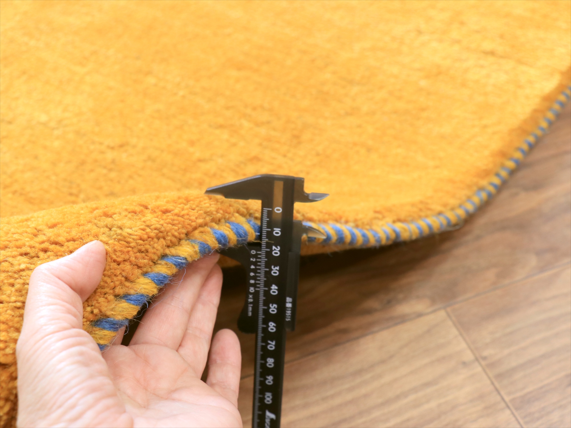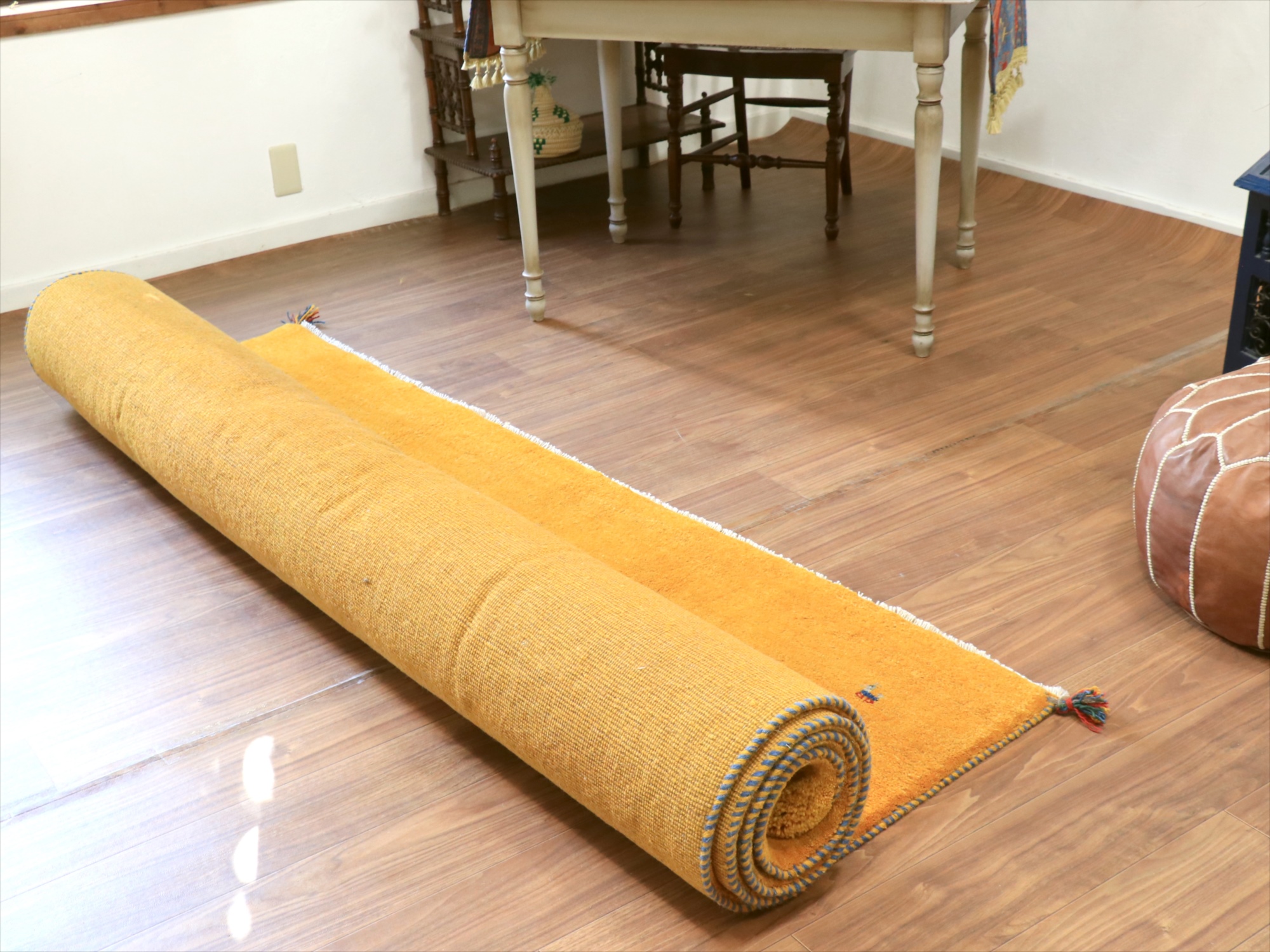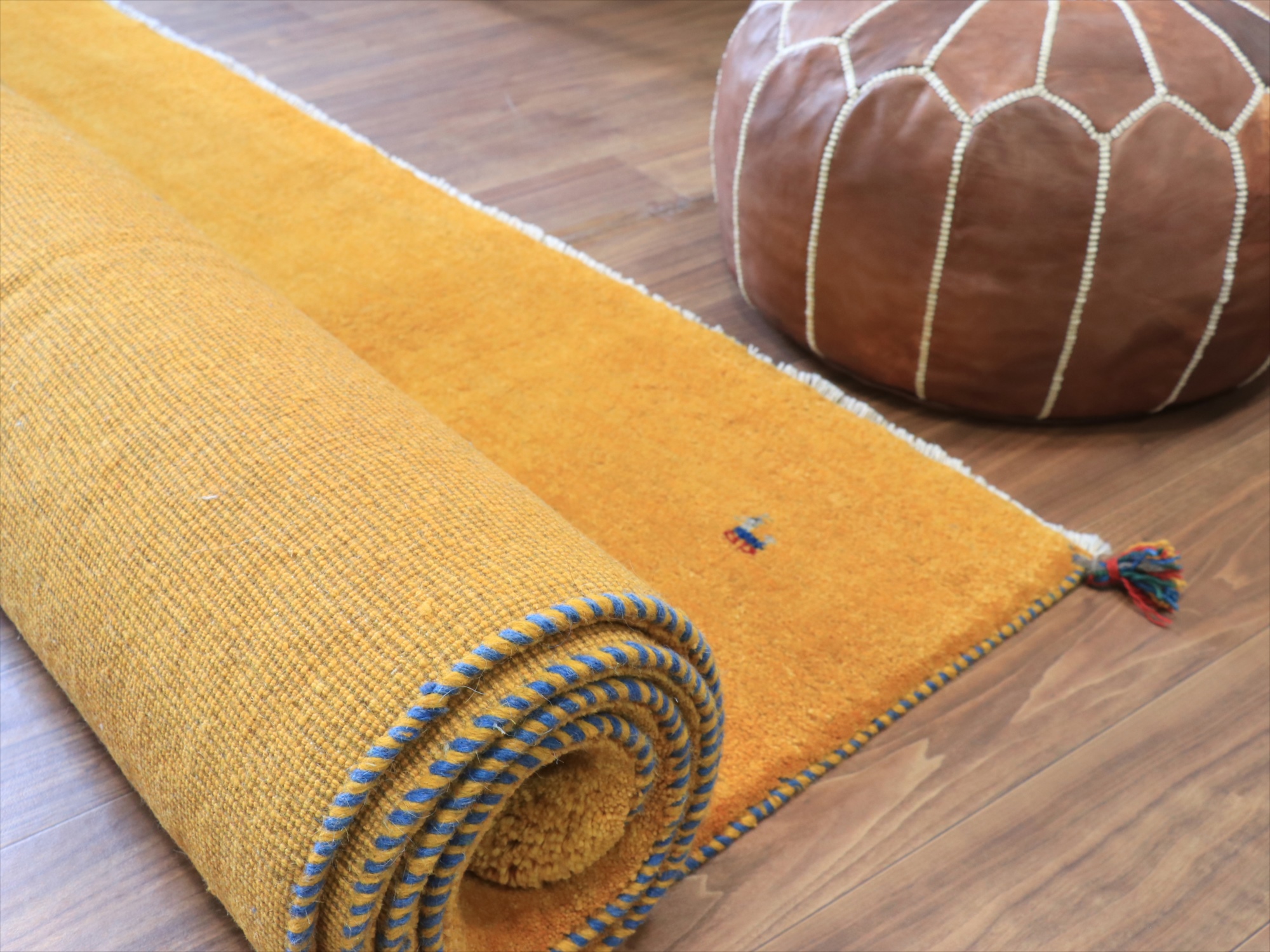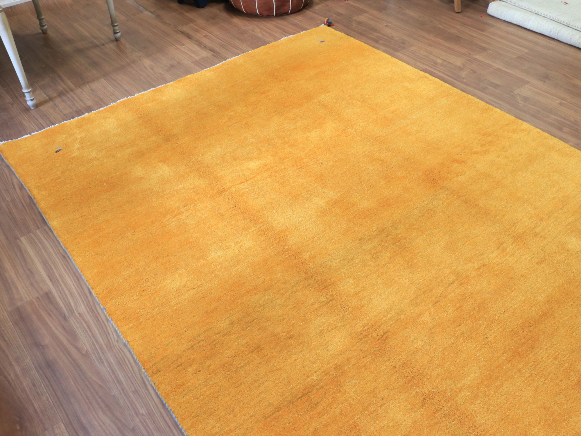 | 毛足が長く、パイルを含めたギャッベ全体の厚みは2.2-2.3cm程度。ボリューム感たっぷりのふかふかギャッベです。 手で紡いだ毛糸を、天然の染料で染め上げ、丁寧に織り込まれた伝統的なギャッベです。イエロー系の染めは、ウコン(ターメリック)、ジャシール、ザクロの皮、クチナシなどが使われます。きれいな黄色のギャッベにするために大切なのは、染める前の毛糸の選別作業。グレーやブラウンが多く混ざっているウールを染めると、マダラ模様のある黄色になってしまうので、明るいアイボリー部分だけをより分けて黄色に染めてゆくのです。 |