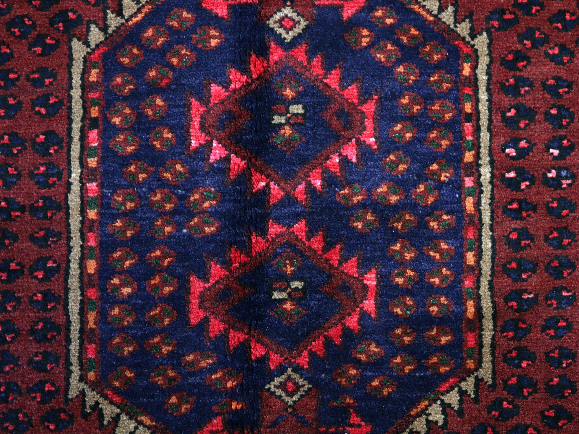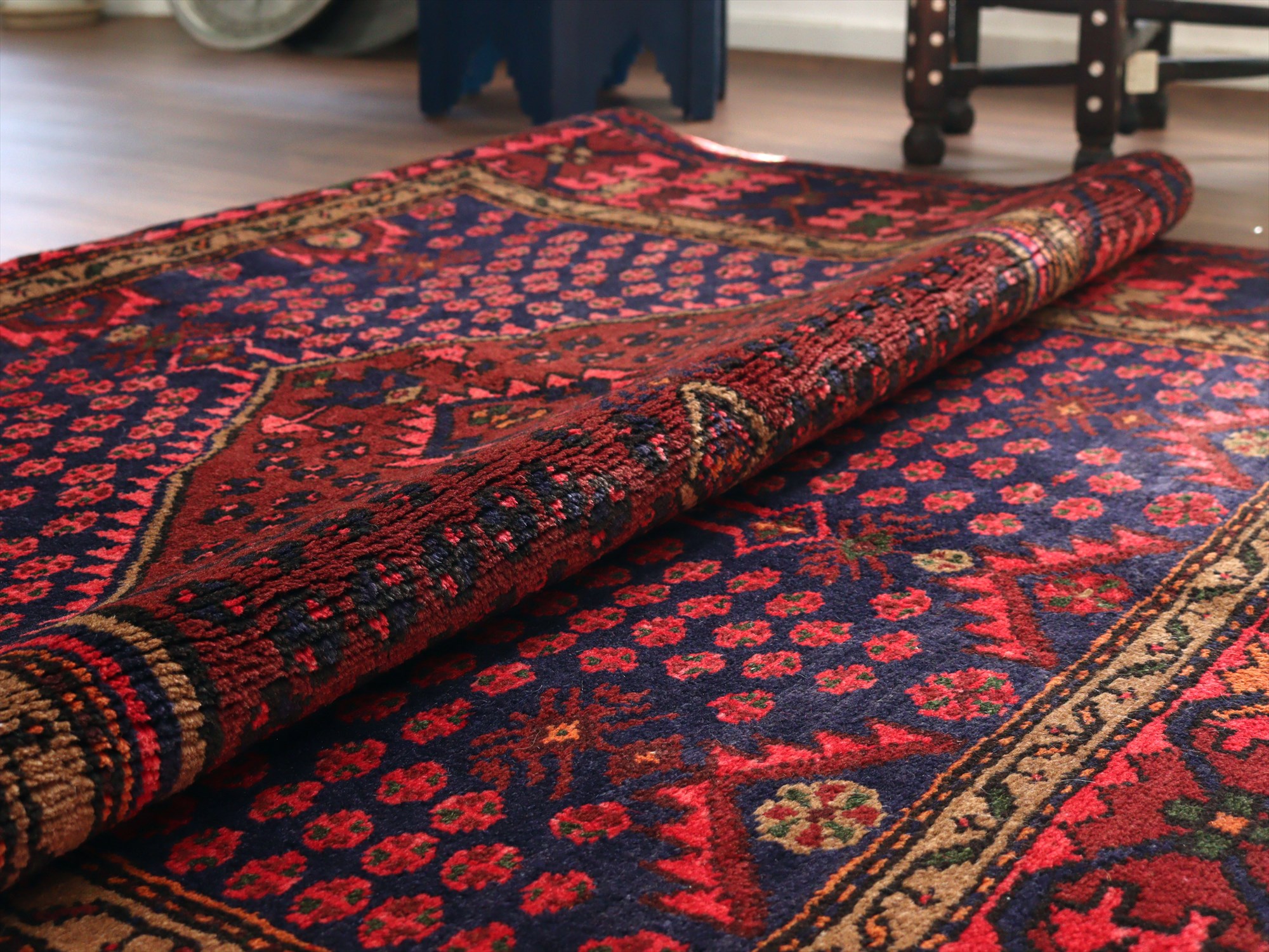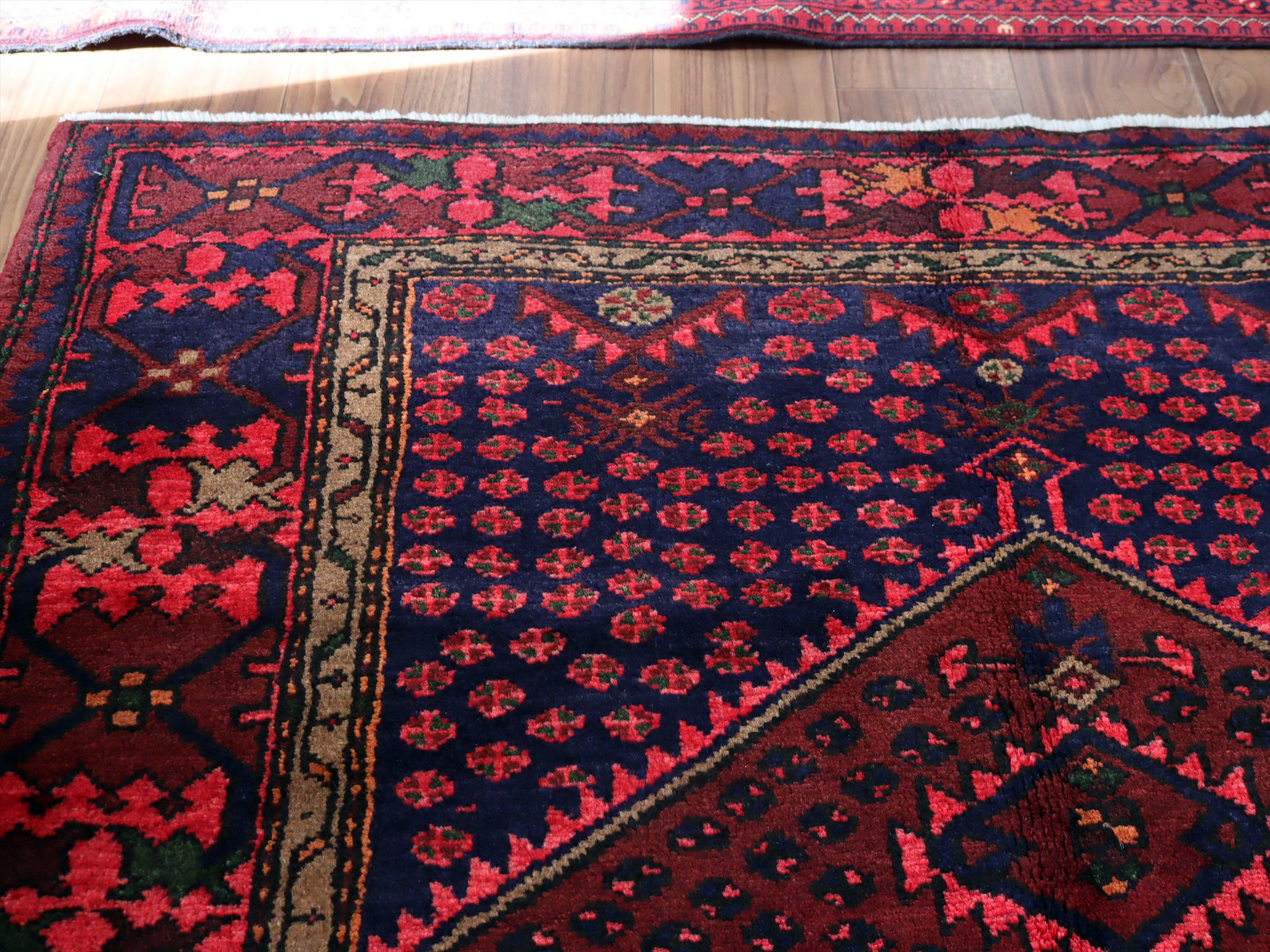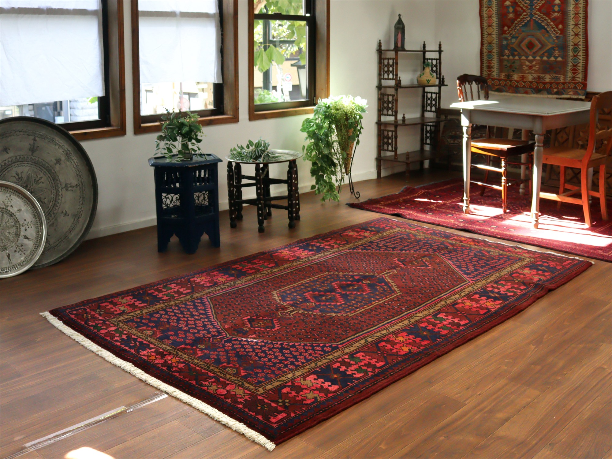 | イランの首都テヘランから西へ300kmほど離れたハマダン地方ハルシンで織られたカーペットです。曲線で描かれた花模様の華やかなペルシャじゅうたんと異なり、直線的な幾何学モチーフで構成された落ち着いたイメージ。トーンの異なる赤とコバルトブルーはこの地方の伝統的な色使い。トライバルラグのあたたかみのある雰囲気が楽しめる一枚です。 |