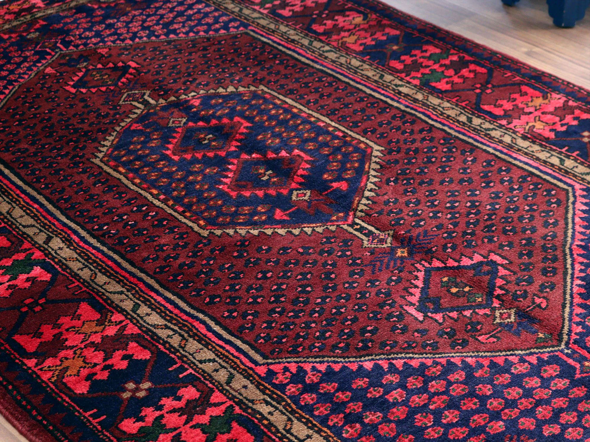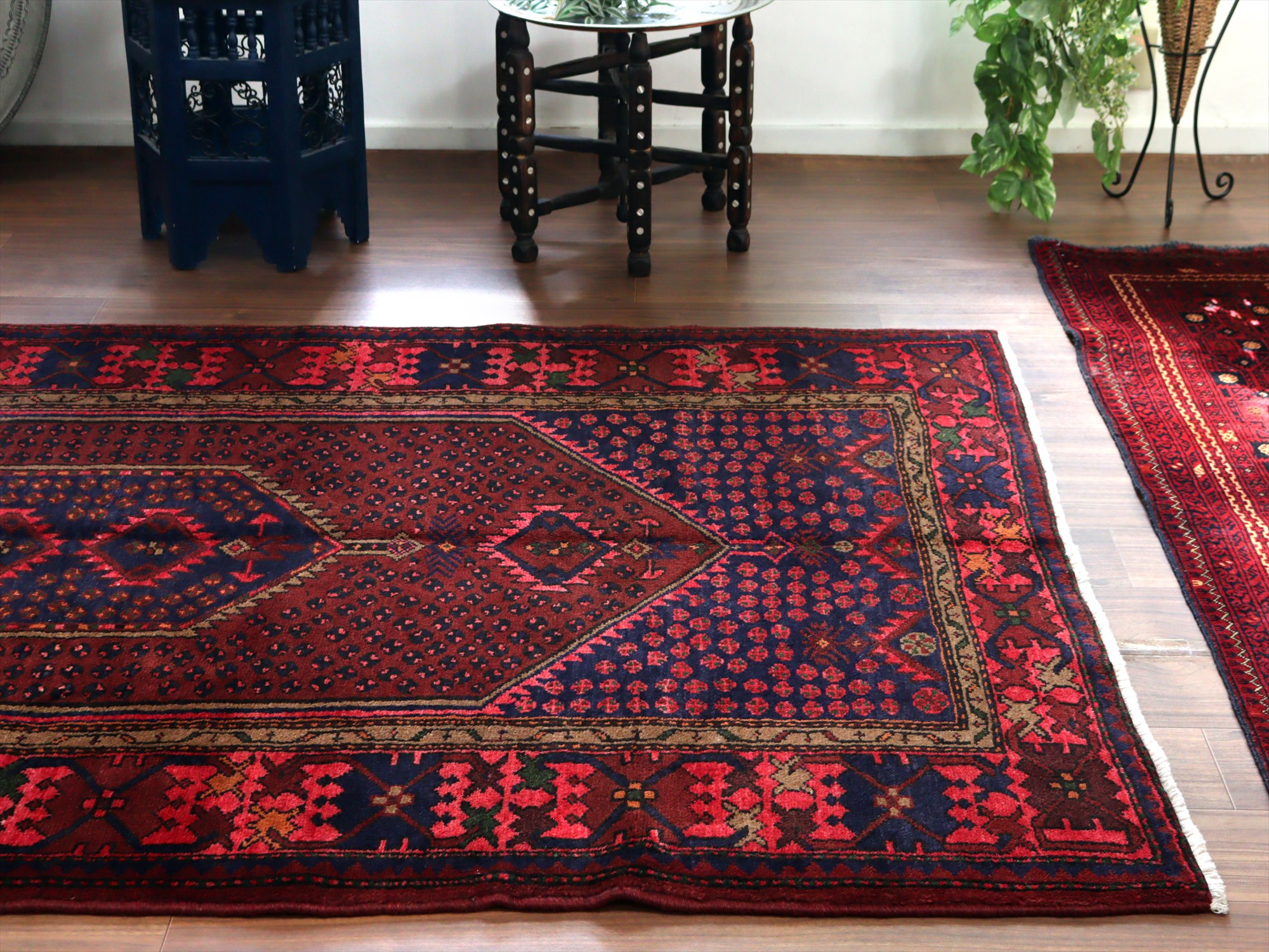 イランの手織り絨毯 ハマダン229×145cm 六角メダリオン レッド&ネイビー