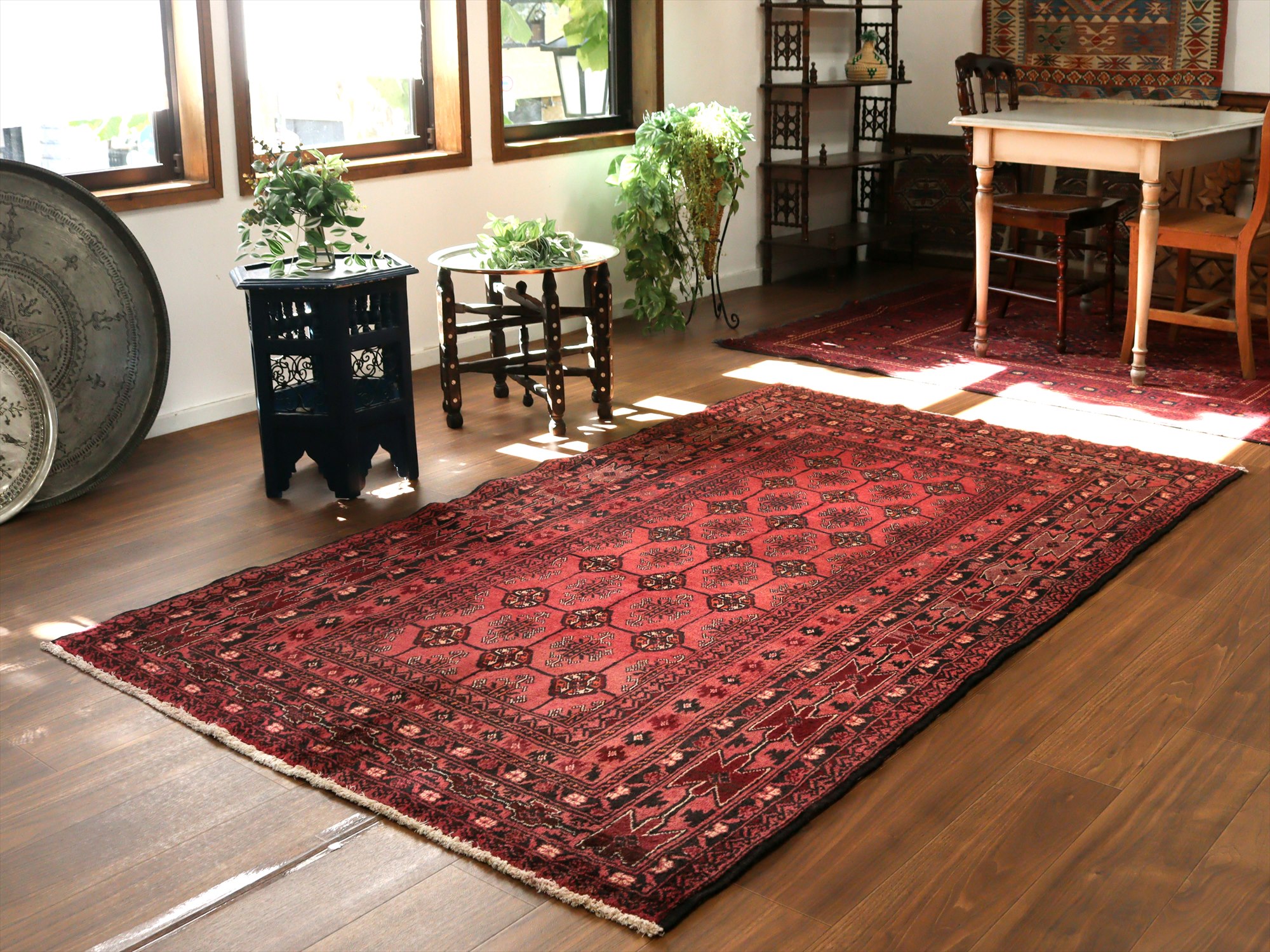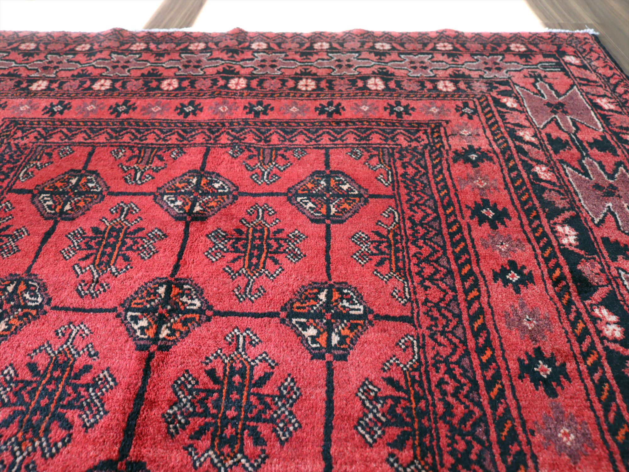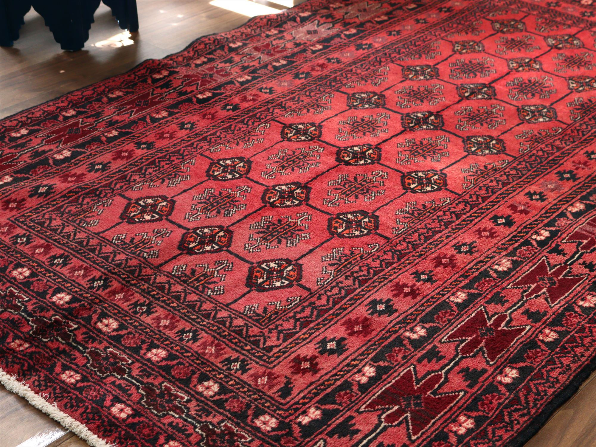 | イラン東部からアフガン・パキスタンなどに住むバルーチ族のカーペット。赤地にギュルのモチーフが入ったバルーチの典型的なデザインです。 |