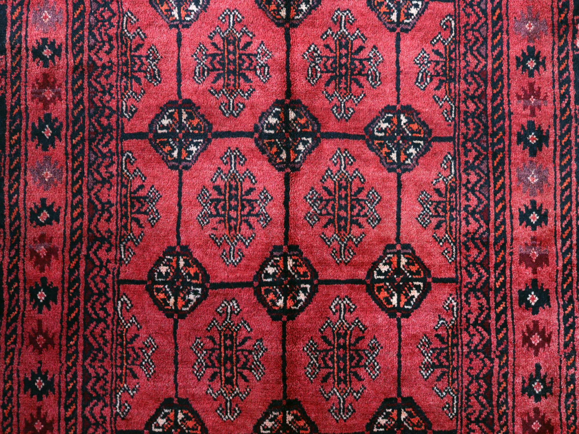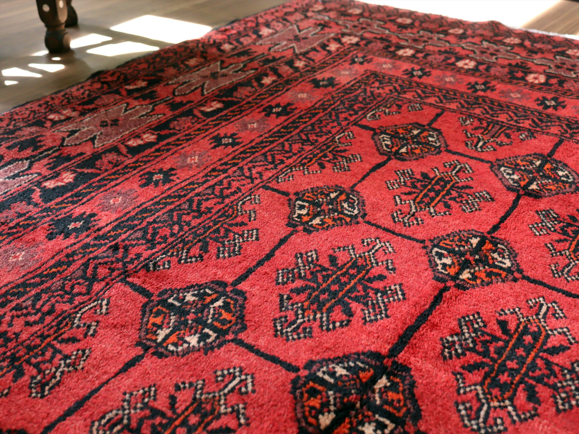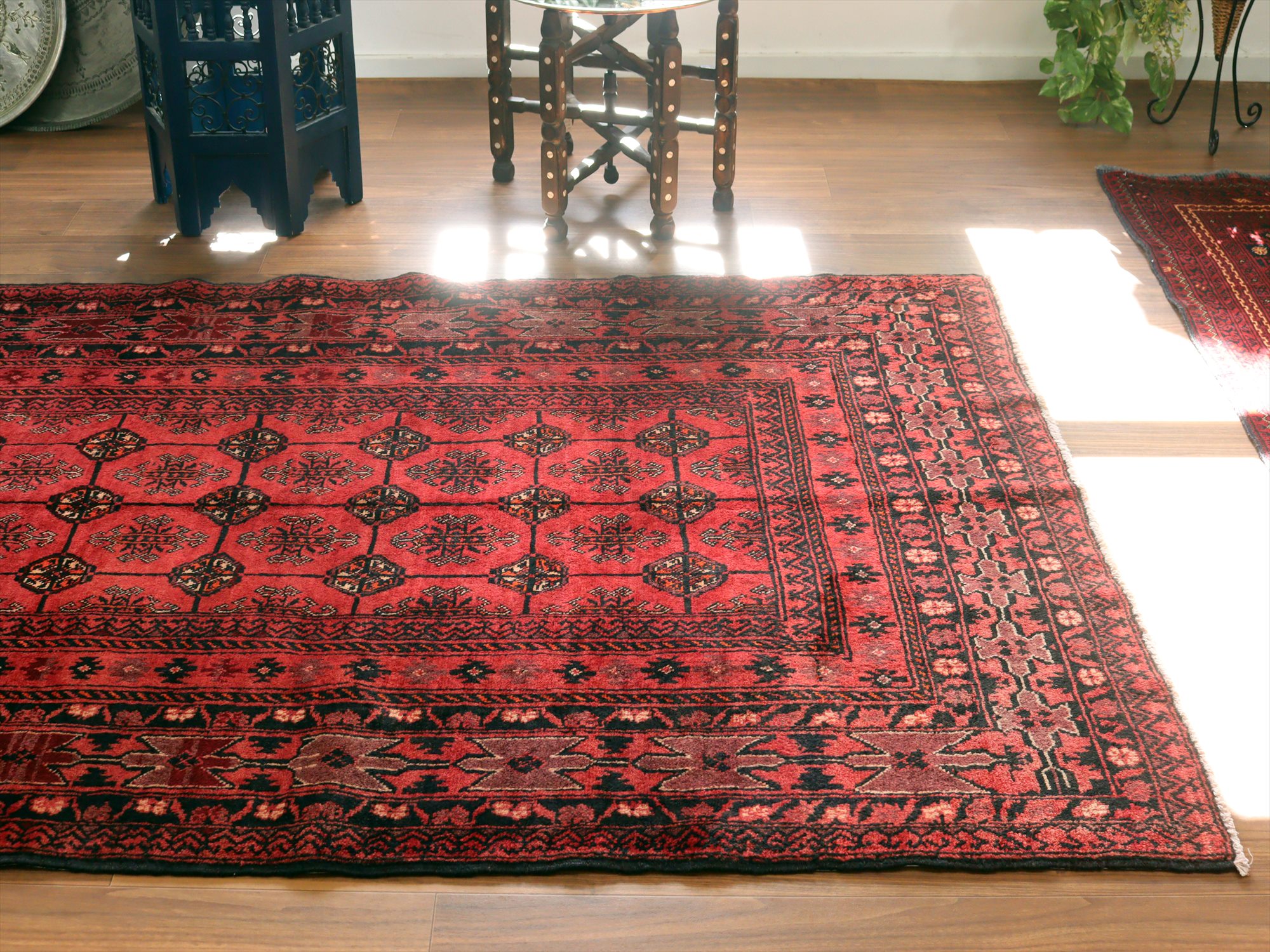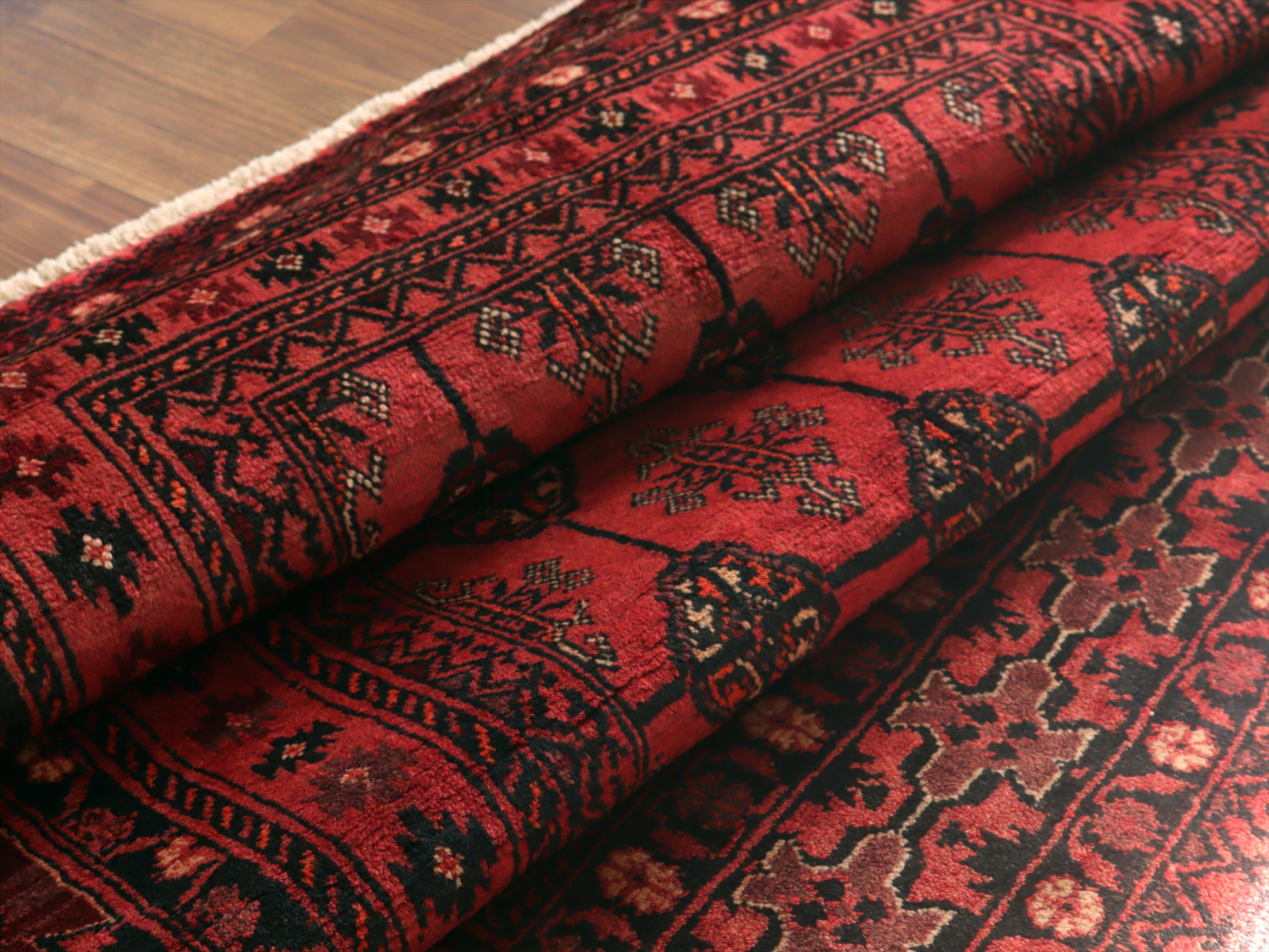 | イラン東部からアフガン・パキスタンなどに住むバルーチ族のカーペット。赤地にギュルのモチーフが入ったバルーチの典型的なデザインです。 |