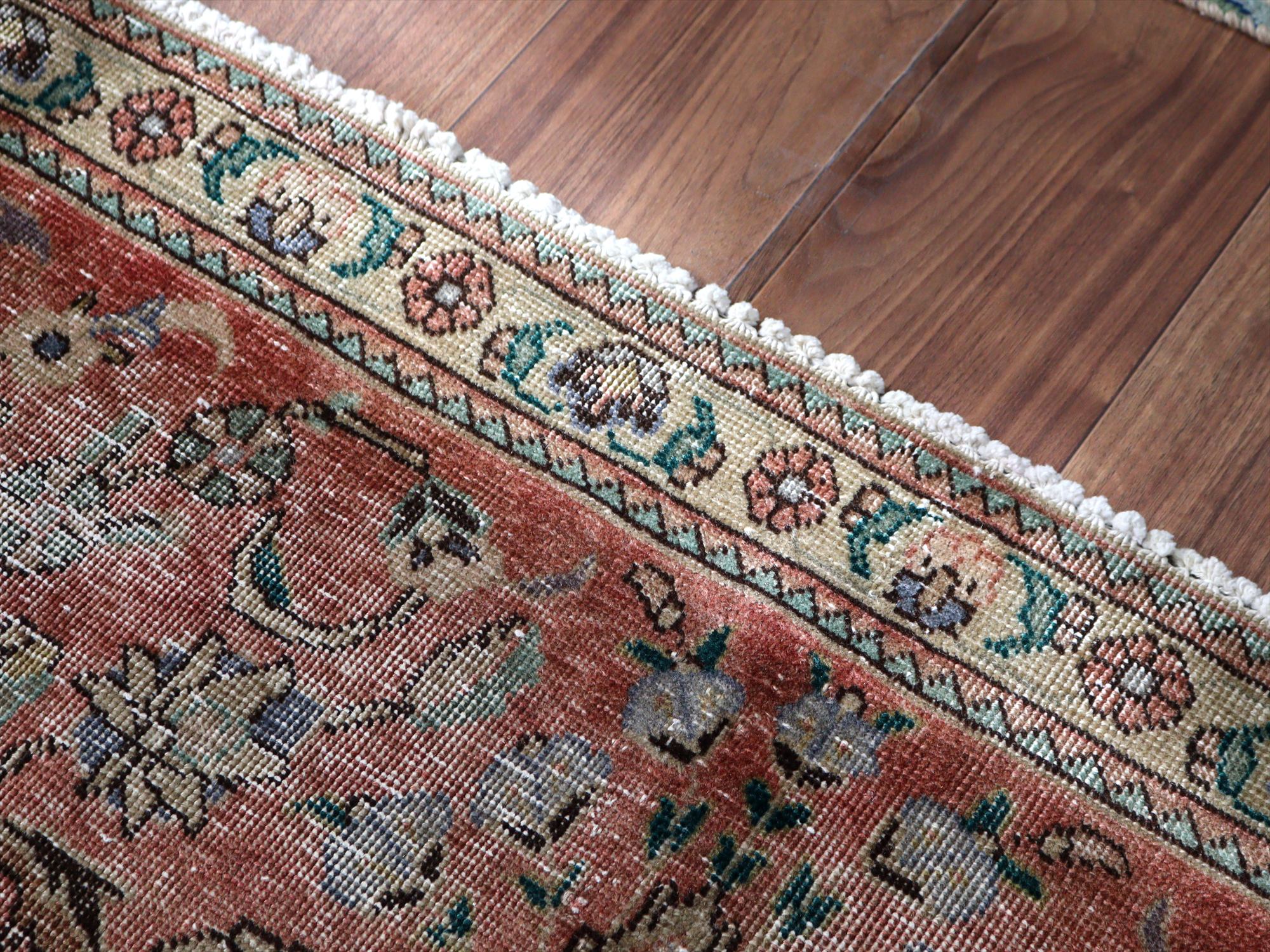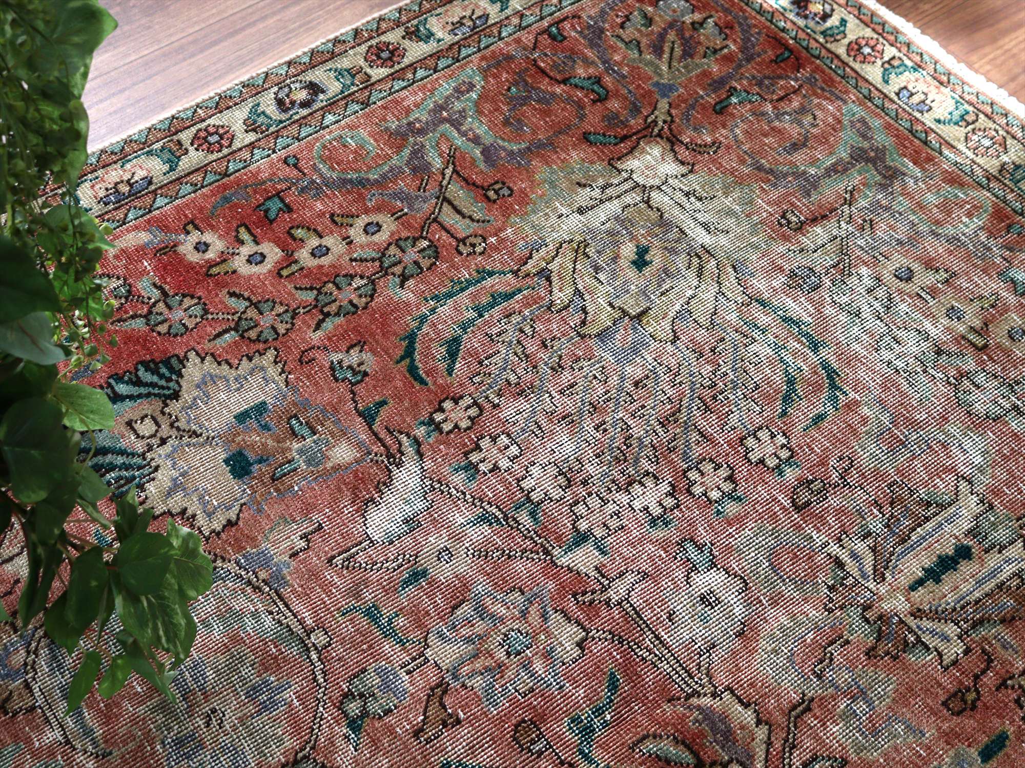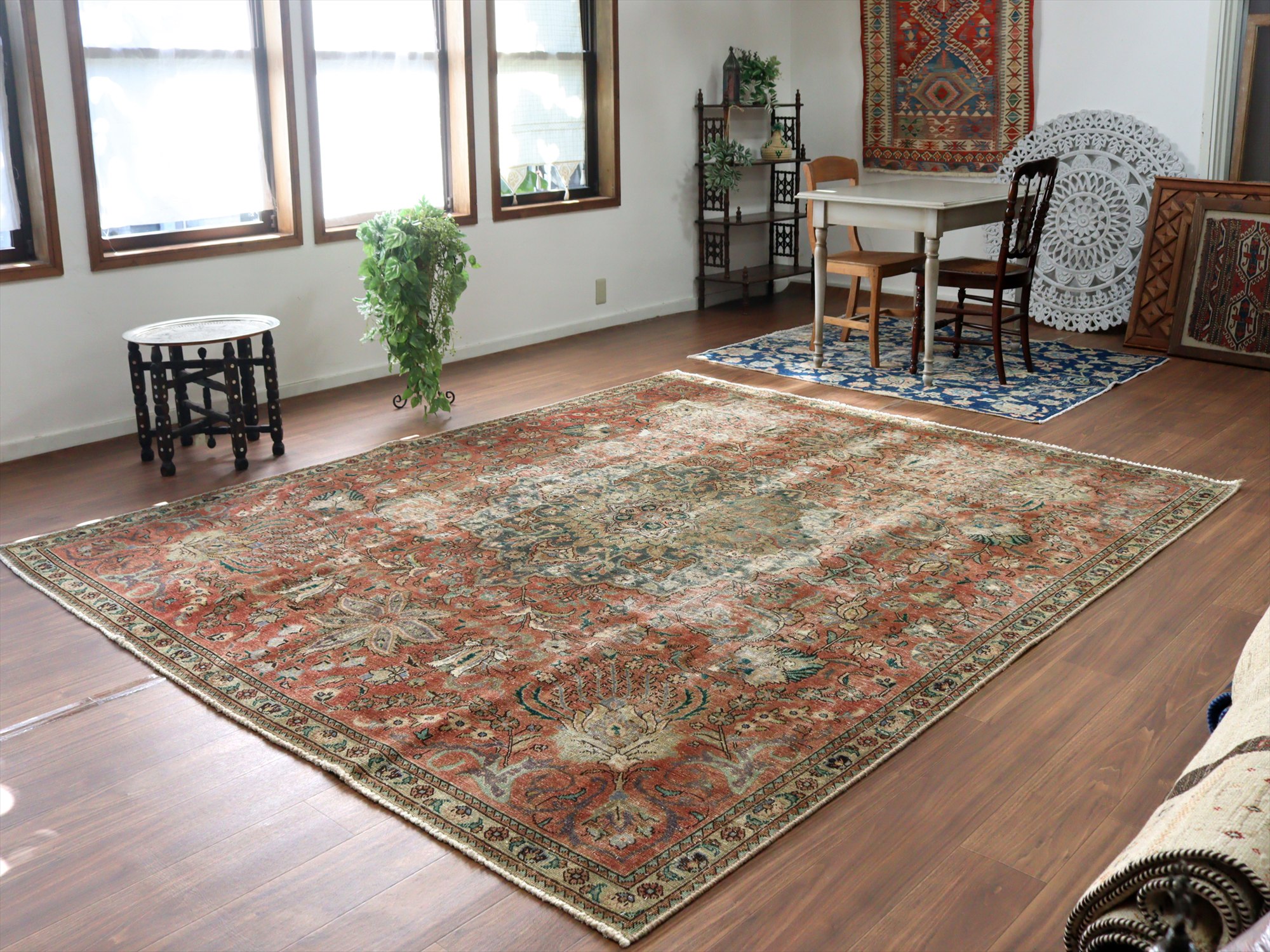 | ダメージが多く、使われなくなった古い手織りカーペットを、洗った上でブリーチをかけたユーズドラグです。全体的に色褪せた雰囲気がよく出ていて、しっとりと落ち着いた印象に仕上がっています。オリジナルの絨毯は、イラン北西部、タブリーズ地方のもので、大きなメダリオン柄です。 |