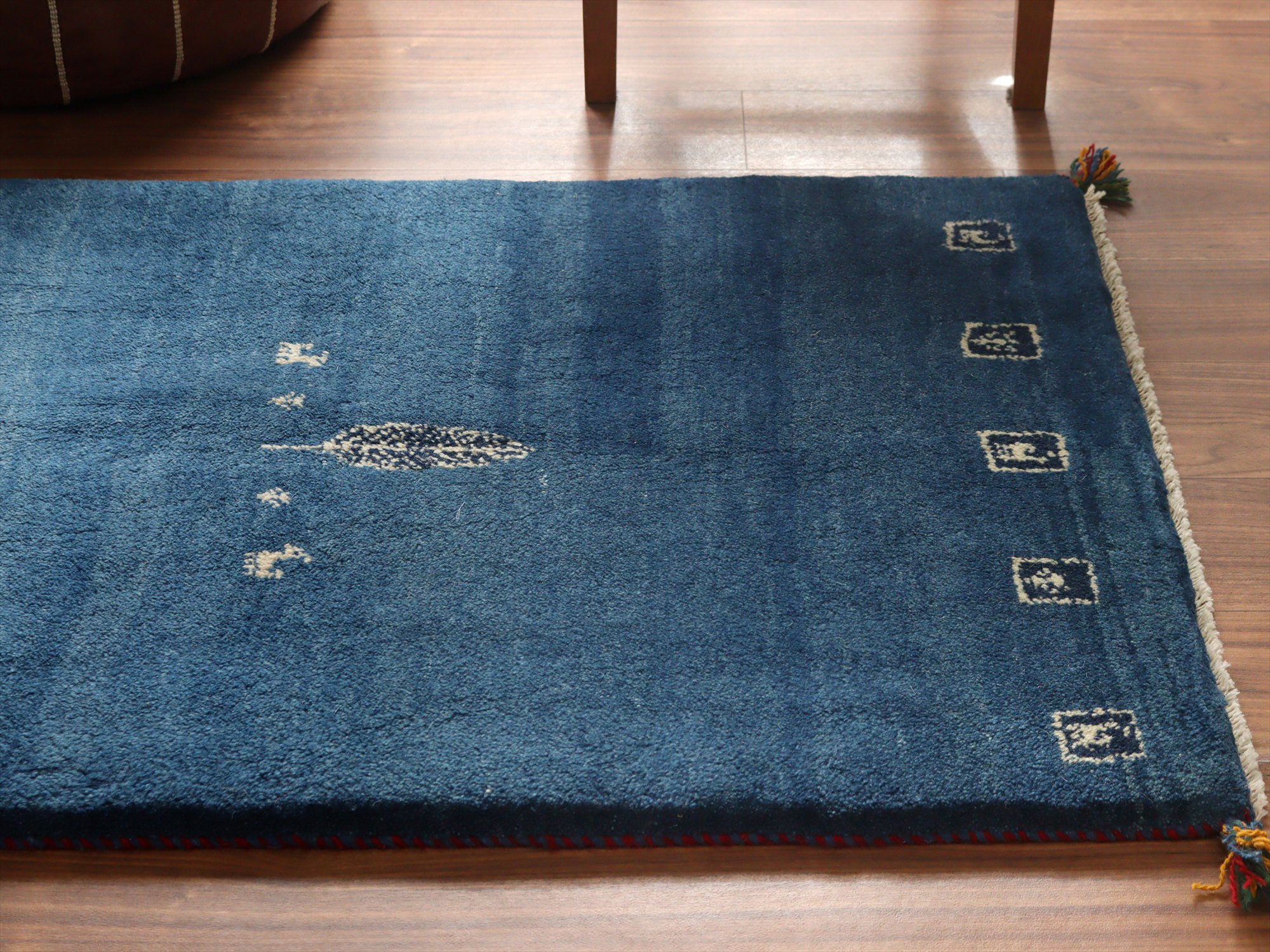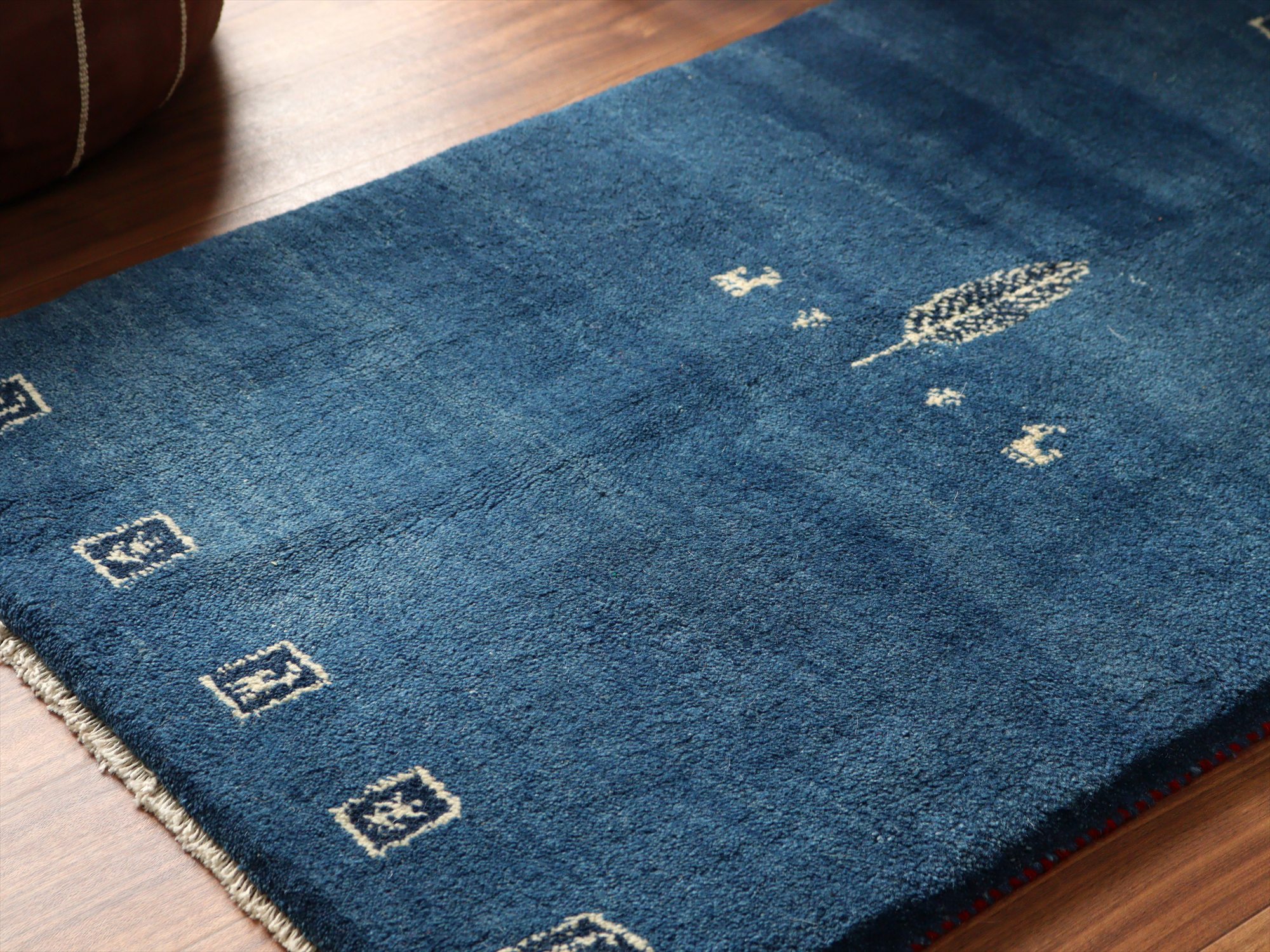 - イランの手織りラグ ギャッベ 118x80cm 動物と植物 ブルー
