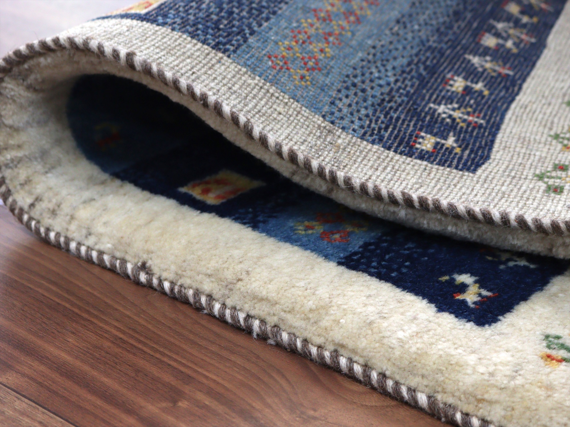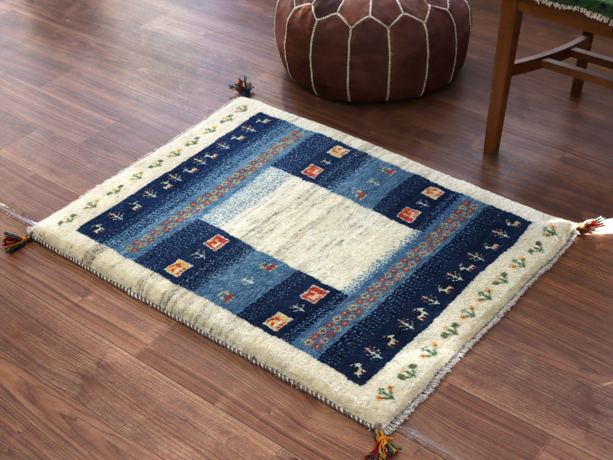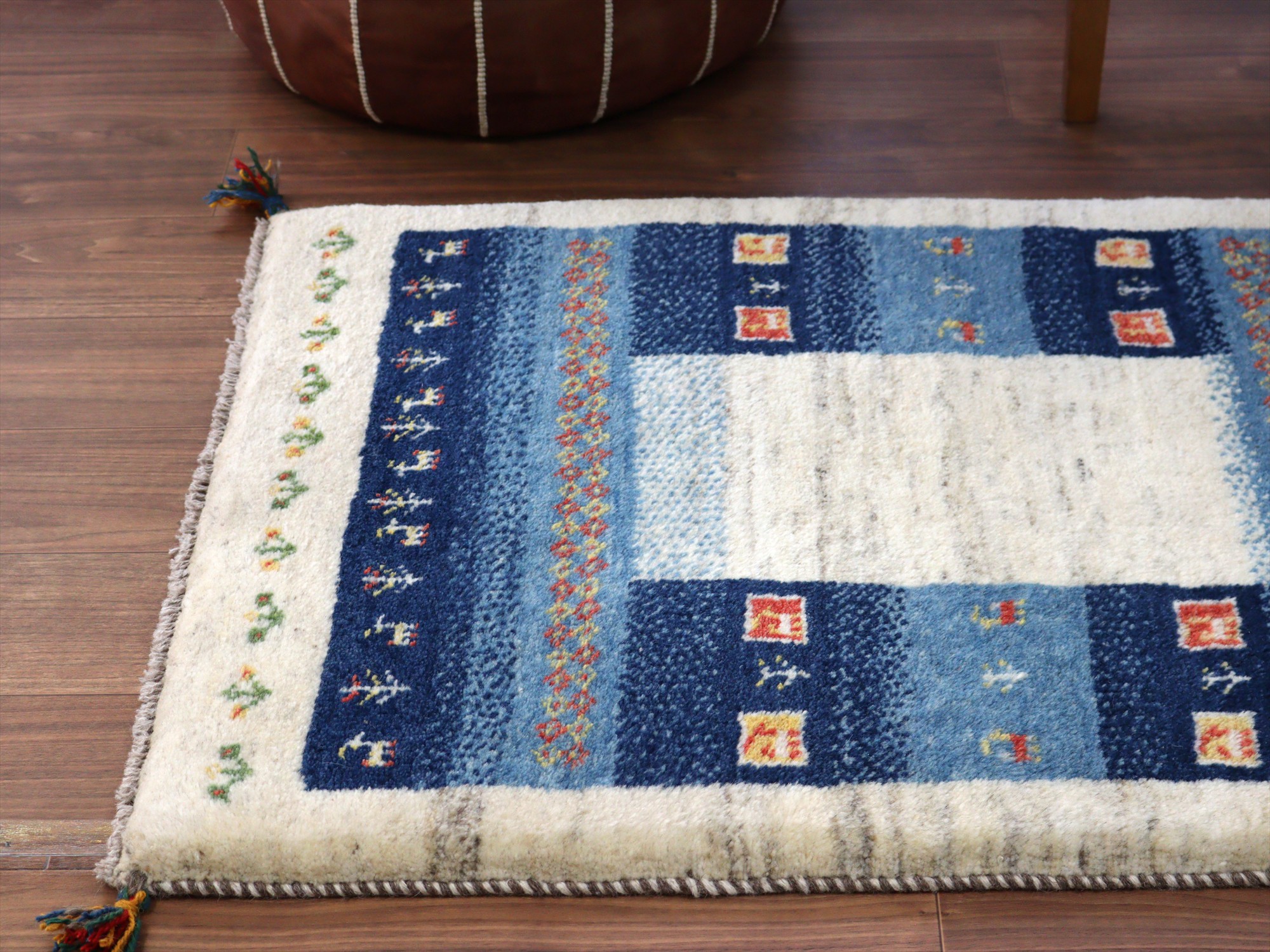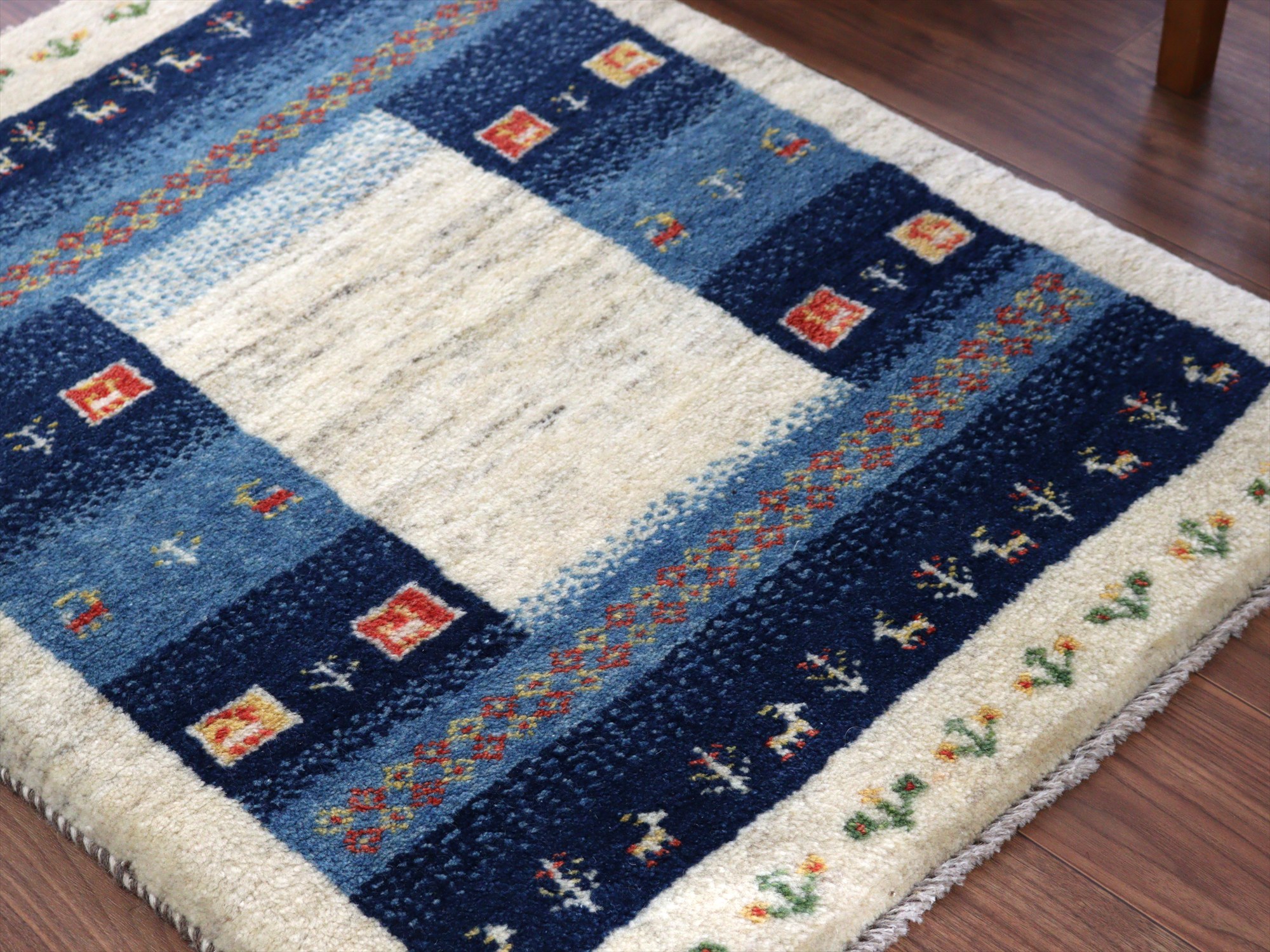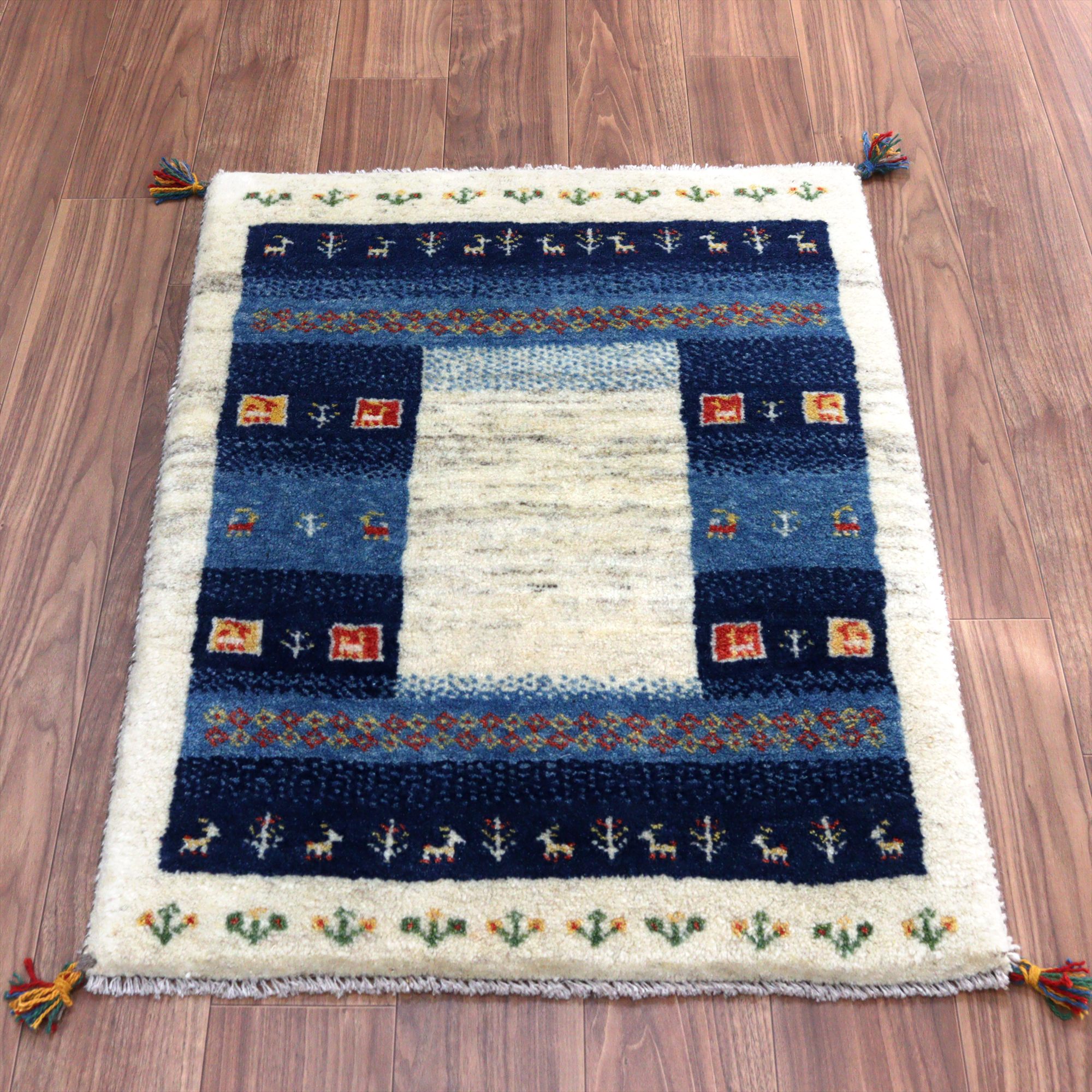 | ナチュラルアイボリーとネイビーを基調としたギャッベ。ブルーとネイビーのベースには、イエローやレッドの色糸で、小花や動物などが織られていてよく映えています。 |