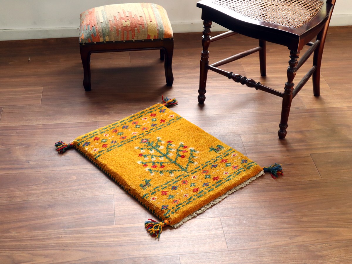 Key:ギャッベ,ギャベ,一点もの 現品販売 ラグ,ウール製,イラン,手織り,じゅうたん,絨毯,座布団, イエロー オレンジ 黄色 草木染, ガラタバザール Gabbeh, Handmade, Hand knotted, Tribal rug, Iran carpet, Wool, Natural Dye,