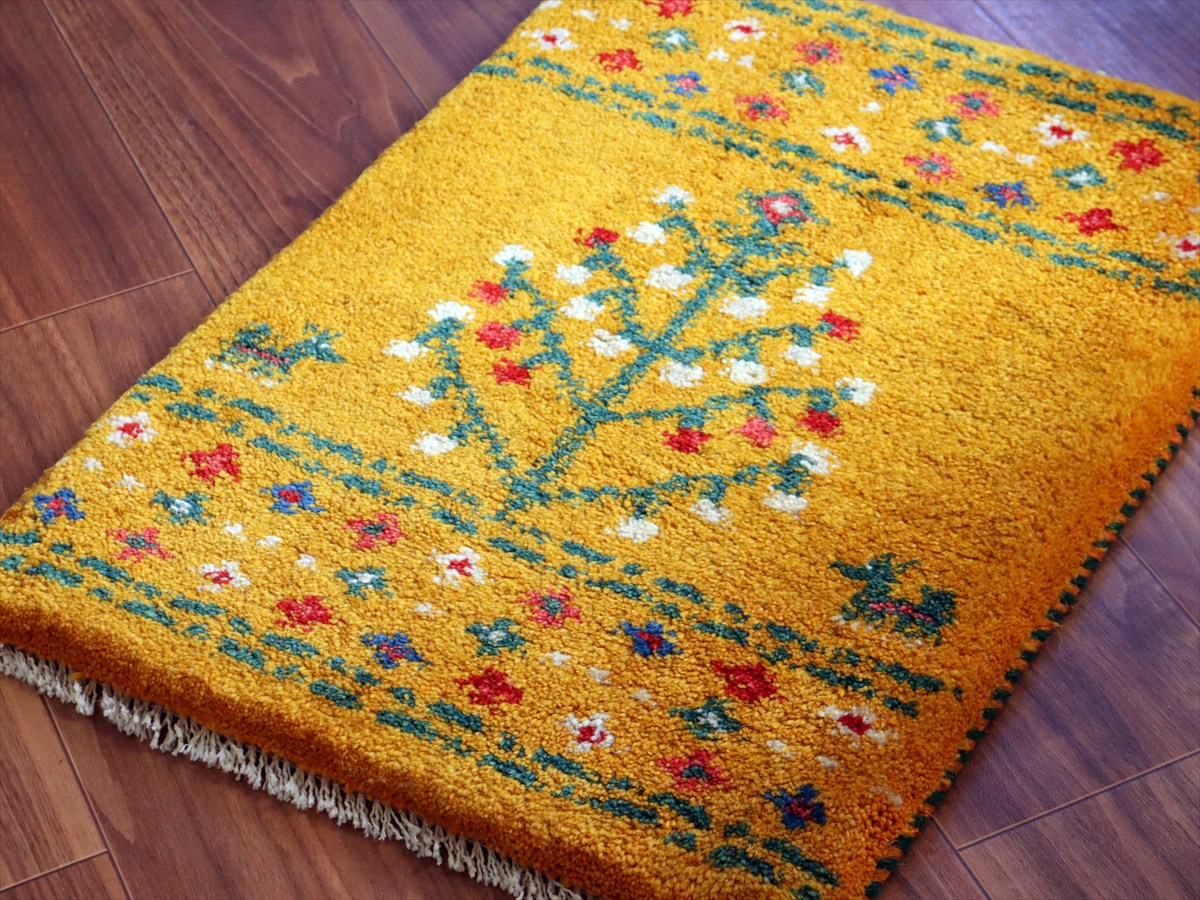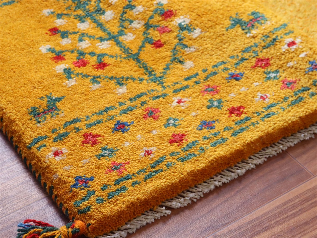 - ギャッベ ミニギャベ イラン手織り 59×44cm イエローオレンジ 生命の樹とフラワーと動物