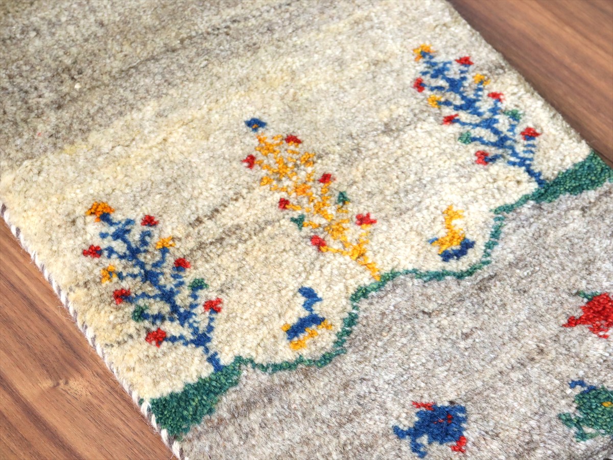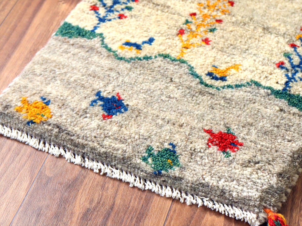 | 天然の羊毛の色をそのまま使ったアイボリーのギャッベ。カラフルな生命の樹と動物が織られています。グレー箇所に魚が織られています。 |