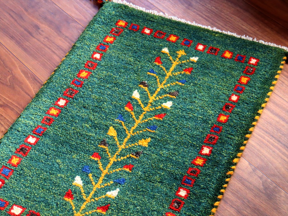 ギャッベ ミニギャベ イラン手織り 58×40cm グリーン 連なる生命とカラフルタイル