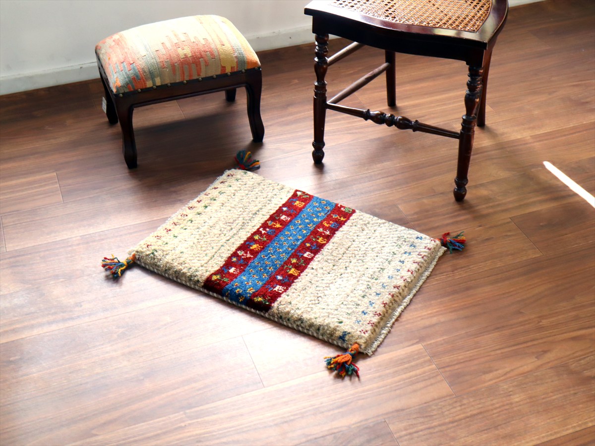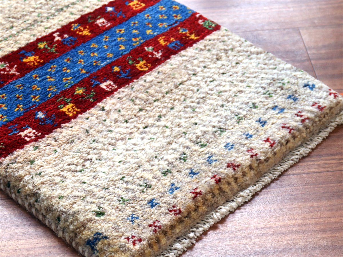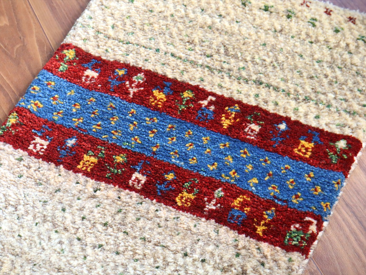 - ギャッベ ミニギャベ イラン手織り 60×41cm ナチュラルアイボリー カラフルな動物と生命の樹