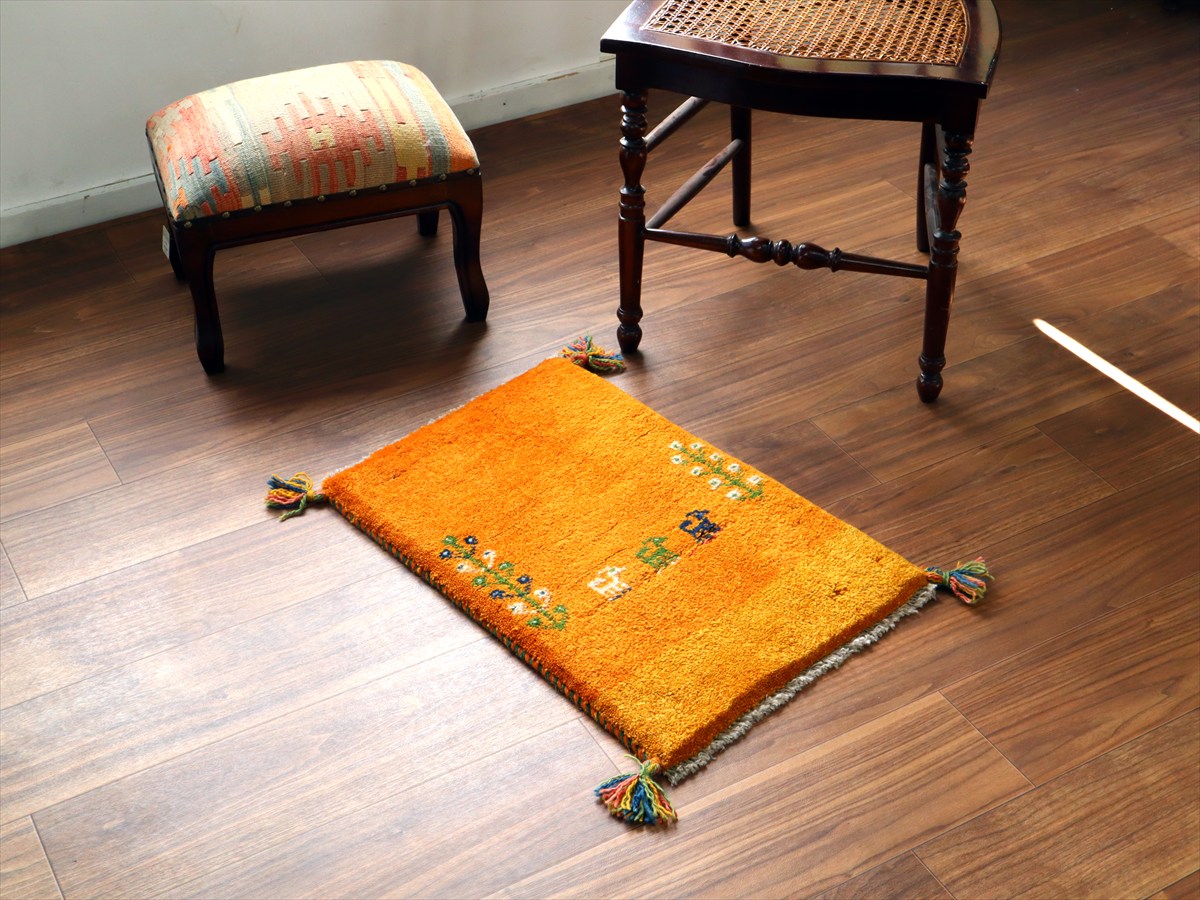- ギャッベ ミニギャベ イラン手織り 60×41cm イエローオレンジ 動物と生命の樹