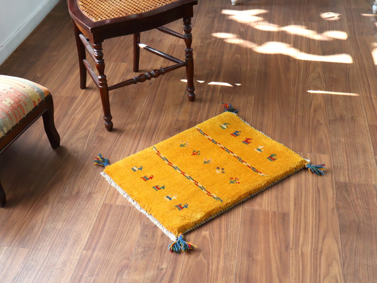 Key:ギャッベ,ギャベ,一点もの 現品販売 ラグ,ウール製,イラン,手織り,じゅうたん,絨毯,座布団, イエロー オレンジ 黄色 草木染, ガラタバザール Gabbeh, Handmade, Hand knotted, Tribal rug, Iran carpet, Wool, Natural Dye,