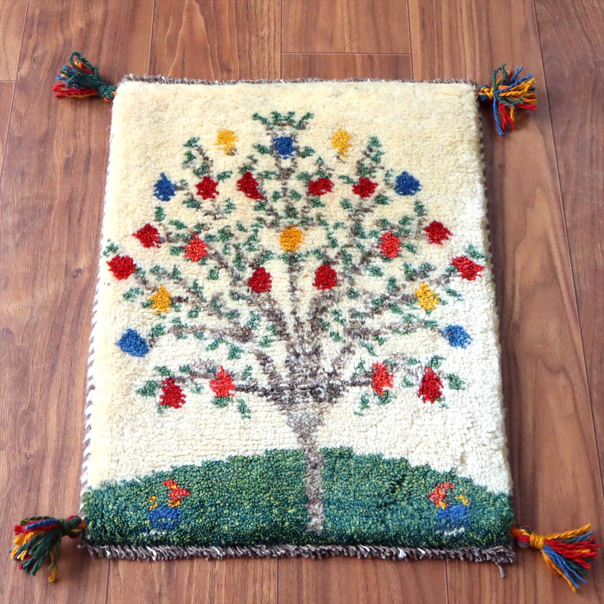 - ギャッベ ミニギャベ イラン手織り 53×41cm ナチュラルアイボリー 生命の樹とザクロと動物