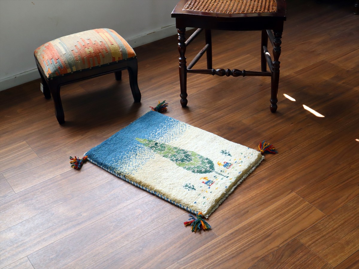 ギャッベ ミニギャベ イラン手織り 57×40cm ナチュラルアイボリー 糸杉と動物