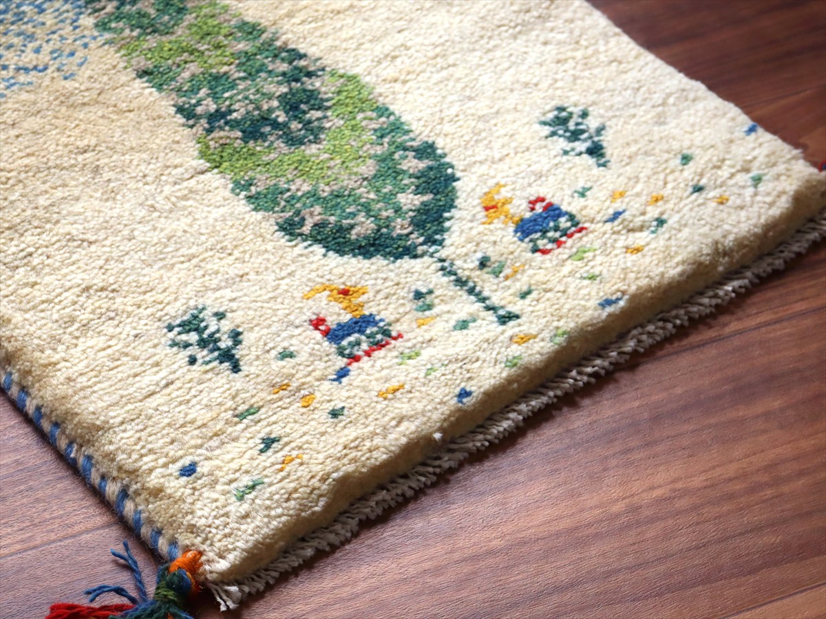 - ギャッベ ミニギャベ イラン手織り 57×40cm ナチュラルアイボリー 糸杉と動物