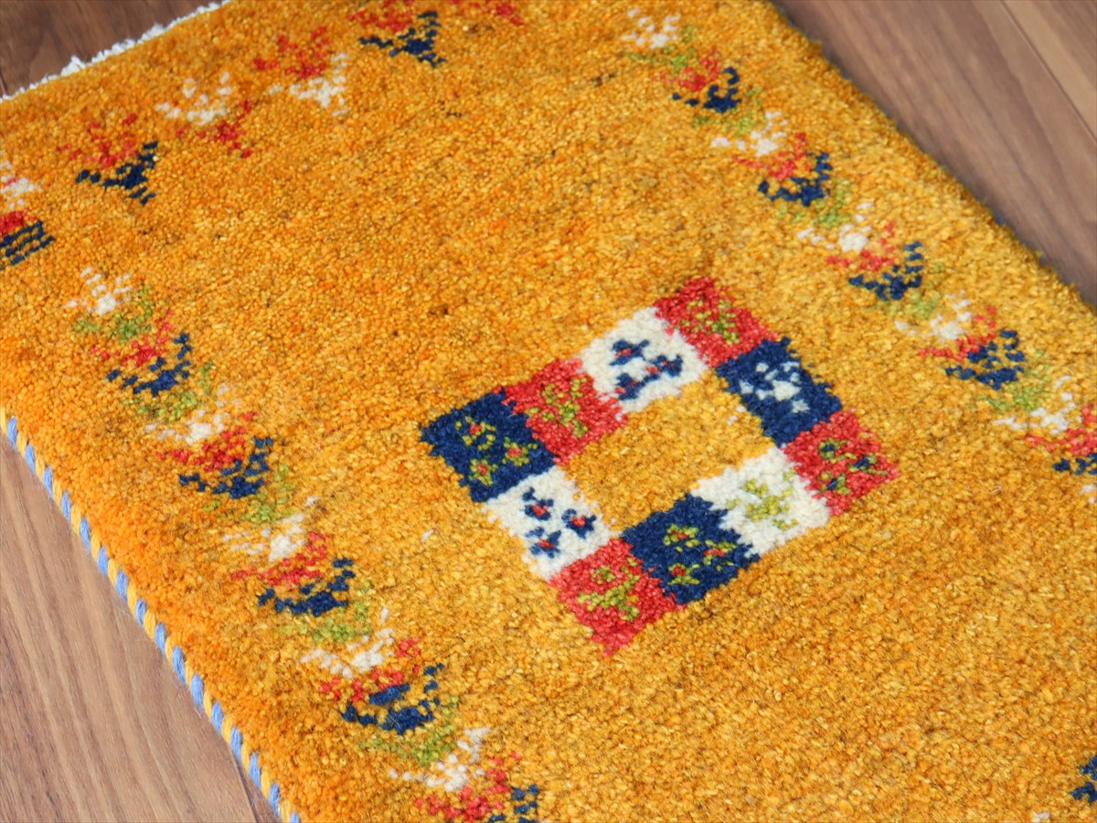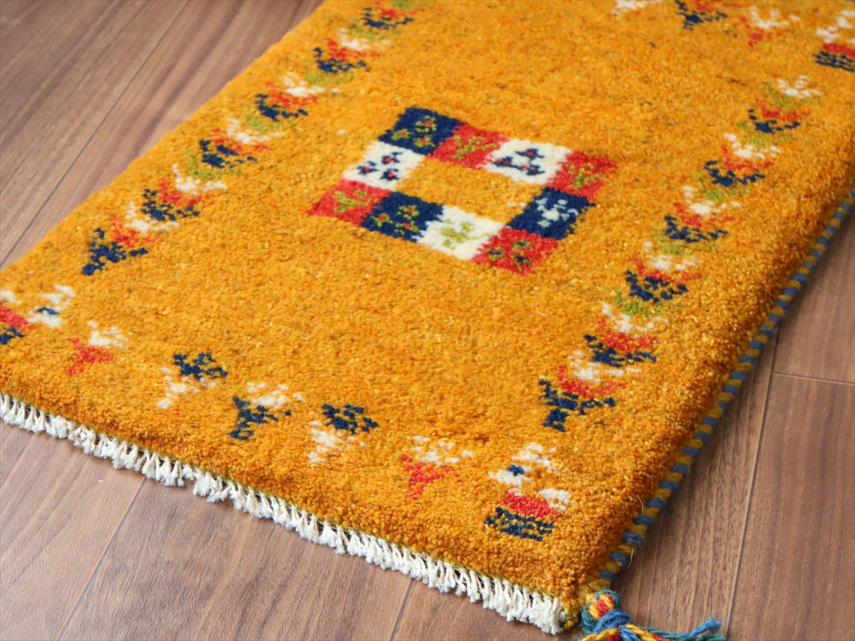 Key:ギャッベ,ギャベ,一点もの 現品販売 ラグ,ウール製,イラン,手織り,じゅうたん,絨毯,座布団, イエロー オレンジ 黄色 草木染, ガラタバザール Gabbeh, Handmade, Hand knotted, Tribal rug, Iran carpet, Wool, Natural Dye,