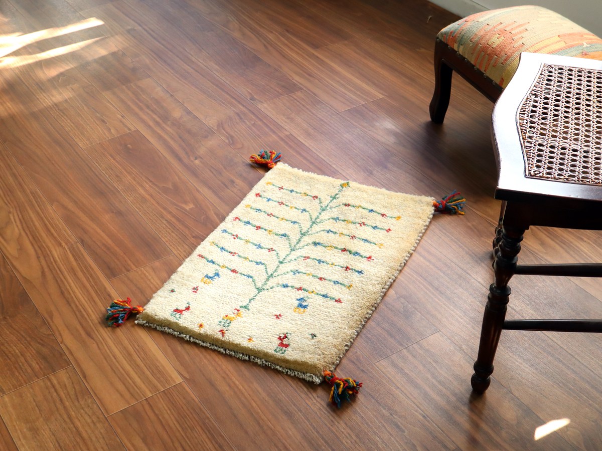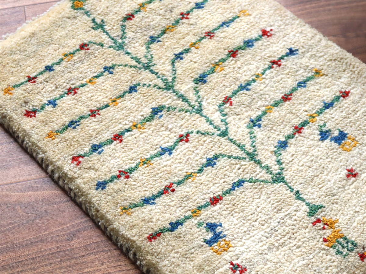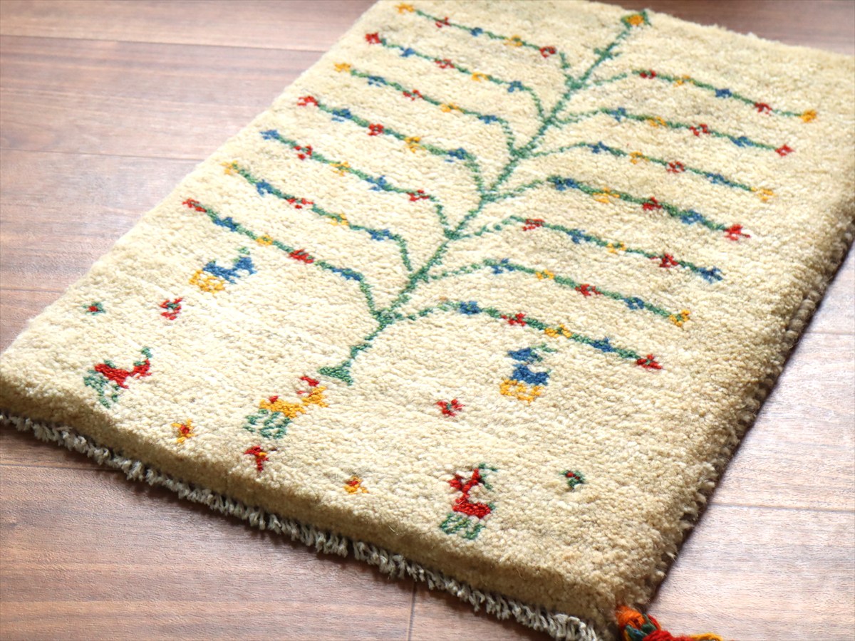 ギャッベ ミニギャベ イラン手織り 57×41cm ナチュラルアイボリー カラフルな生命の樹と動物