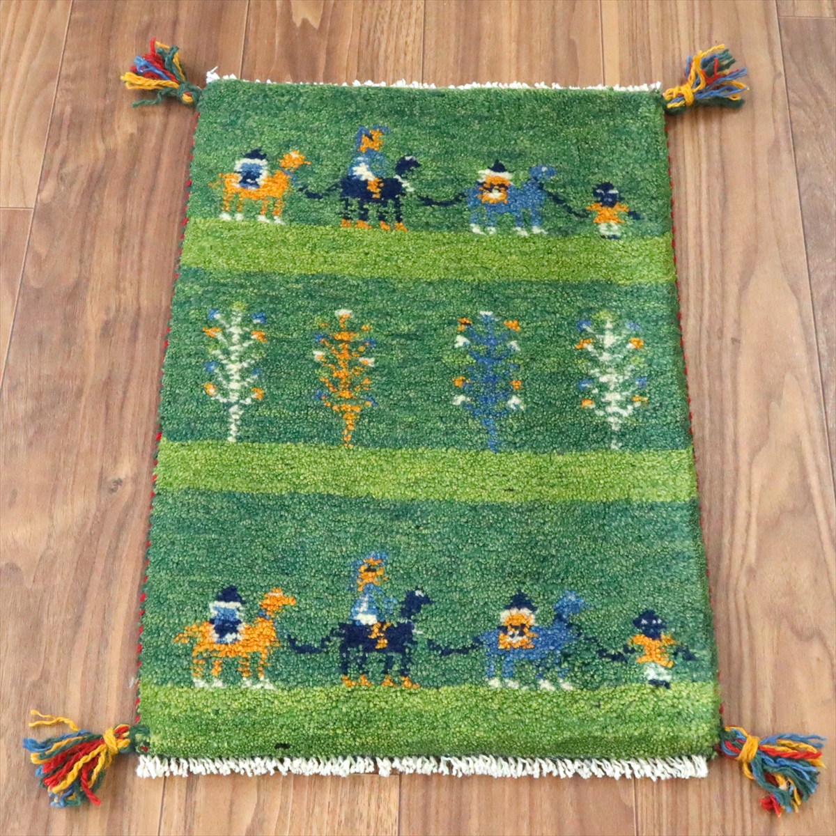 - ギャッベ ミニギャベ イラン手織り 59×39cm グリーン ラクダのキャラバンと生命の樹