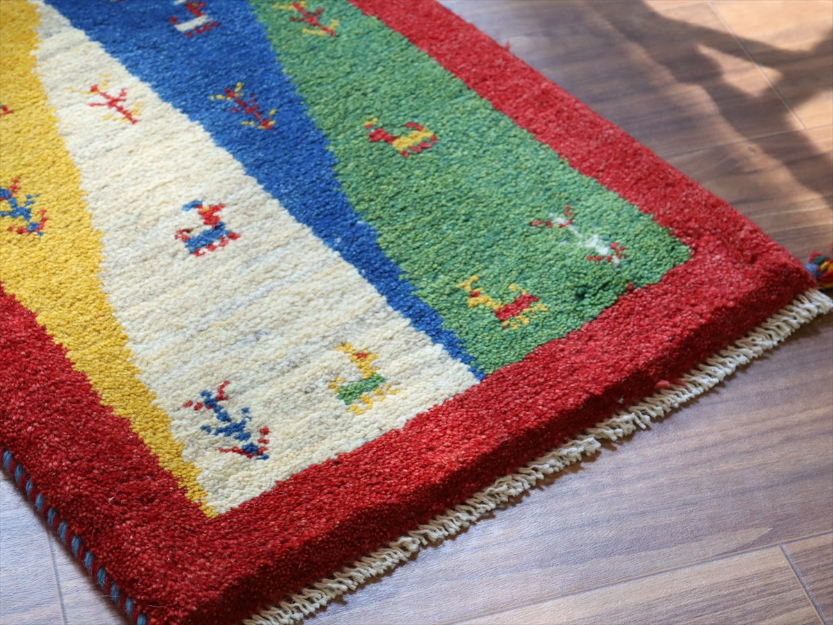 | レッド、イエロー、ナチュラルアイボリー、ブルー、グリーンと草木染めの見本のようなカラーをベースに、移り変わる季節を感じられる風景のギャッベ。 |