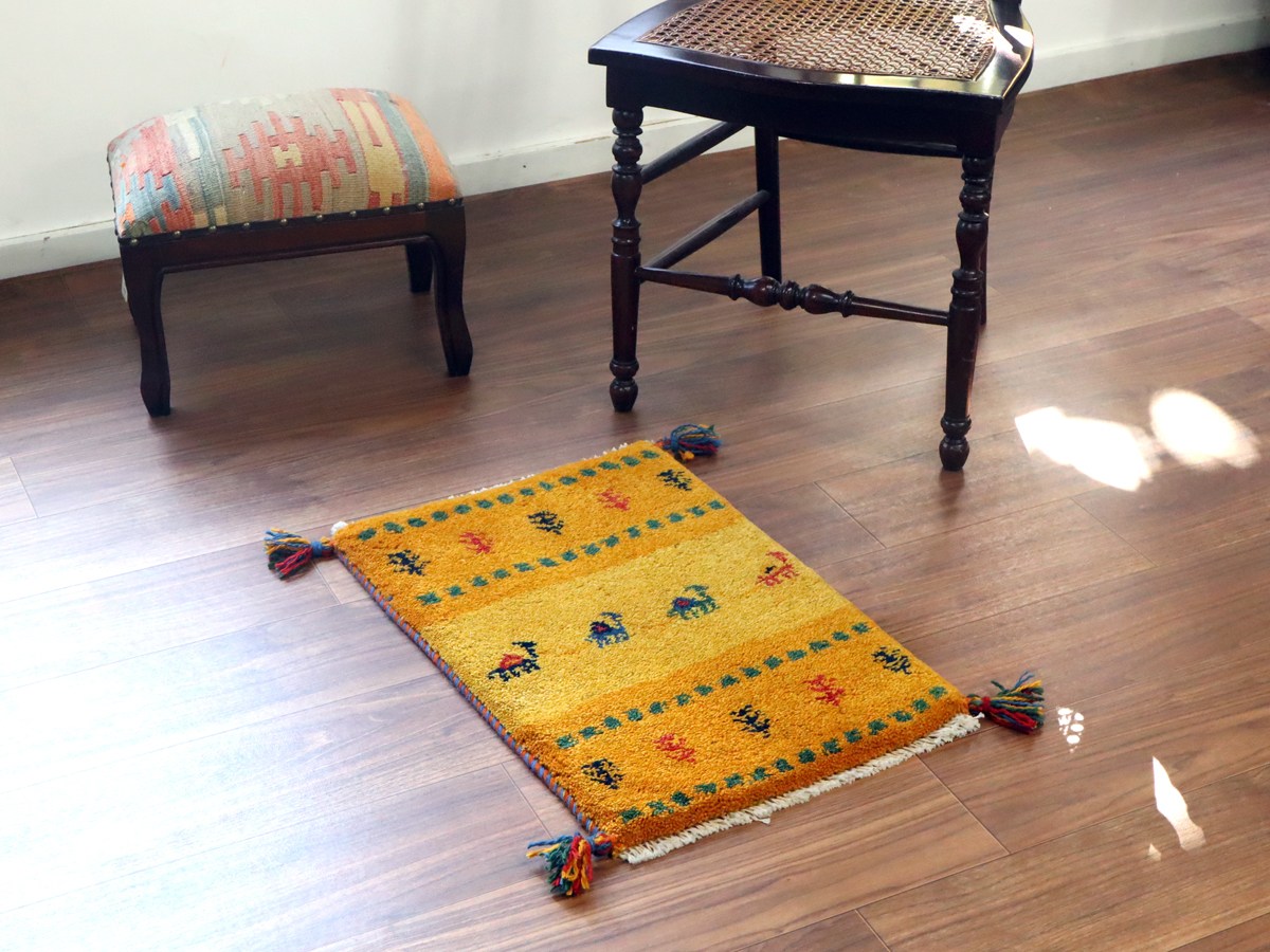 Key:ギャッベ,ギャベ,一点もの 現品販売 ラグ,ウール製,イラン,手織り,じゅうたん,絨毯,座布団, イエロー オレンジ 黄色 草木染, ガラタバザール Gabbeh, Handmade, Hand knotted, Tribal rug, Iran carpet, Wool, Natural Dye,