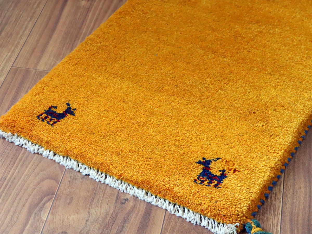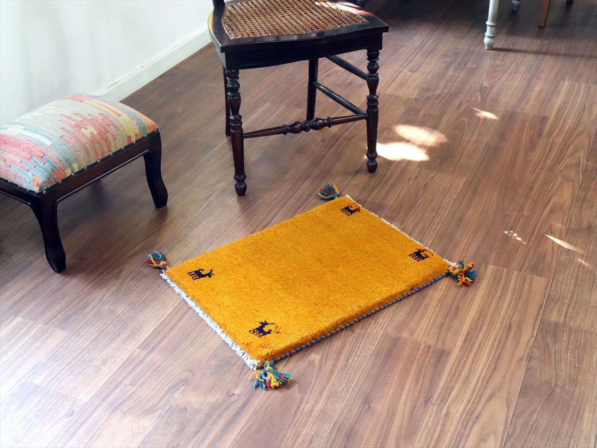ギャッベ ミニギャベ イラン手織り 56×41cm イエロー 四隅に動物