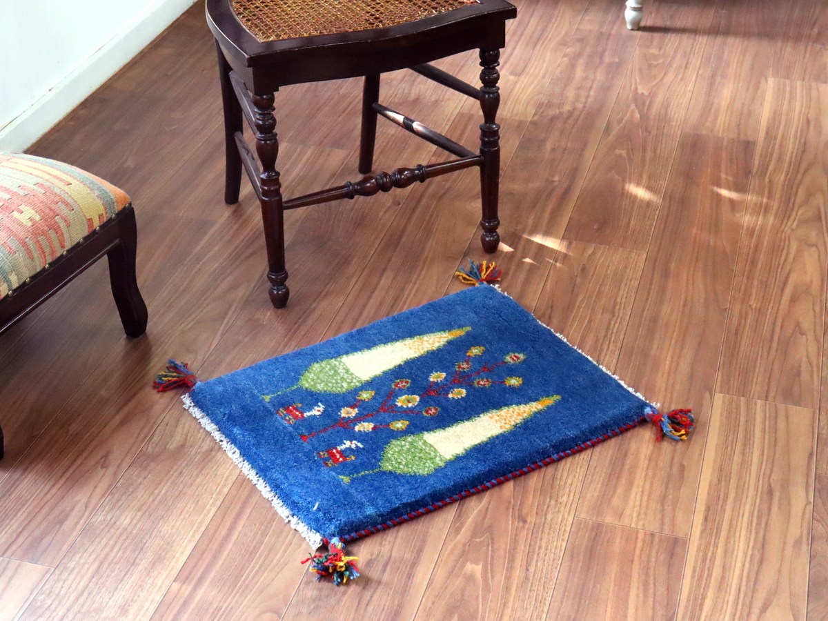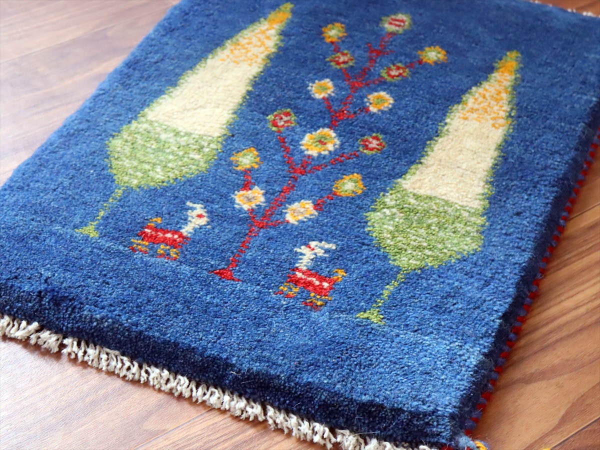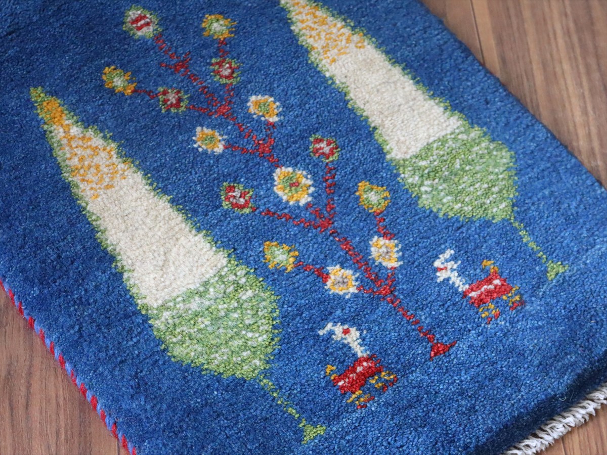 ギャッベ ミニギャベ イラン手織り 55×42cm ブルー 糸杉と生命の樹と動物