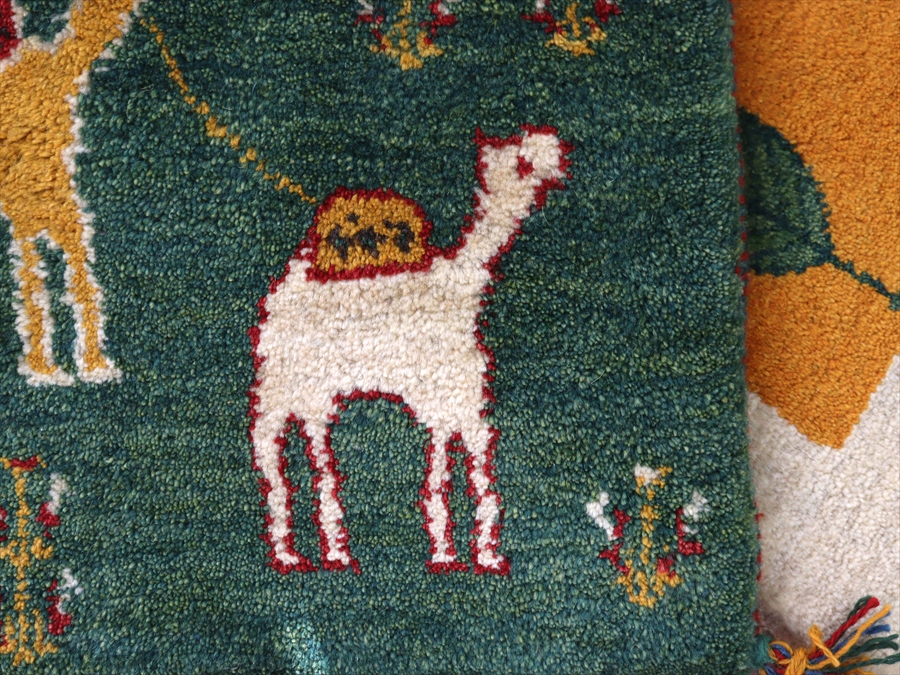 ギャッベ イラン産手織り 座布団サイズ 40x47cm グリーン 2頭のラクダ