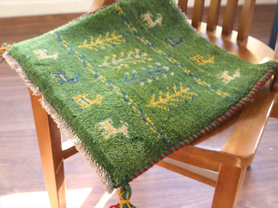 ギャッベ イラン産手織り 座布団サイズ 39x43cm 明るいグリーン