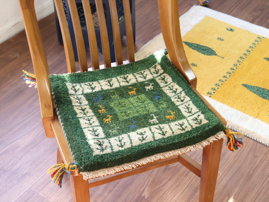 ギャッベ イラン産手織り 座布団サイズ 41x41cm グリーン タイルデザイン