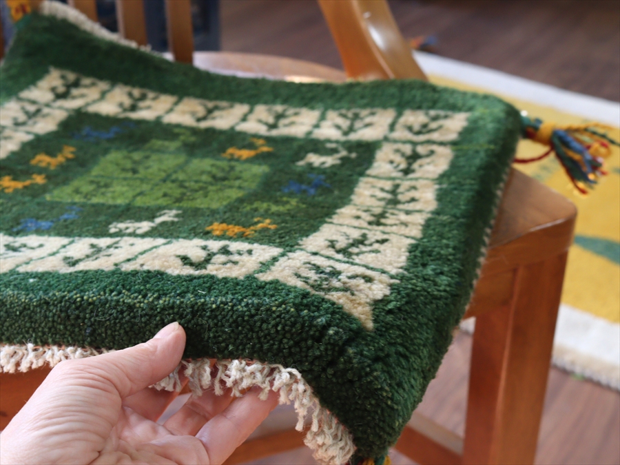 Key:イラン直輸入, GABBEH, ギャッベ, ギャベ, グリーン, 緑, 手織り, 手紡ぎ, ウール, 天然素材, ポンポン, 座布団, バザールギャッベ, ハンドメイド, 一点もの, 現品販売,ガラタバザール, 東京中野区