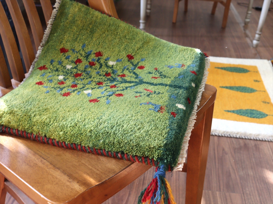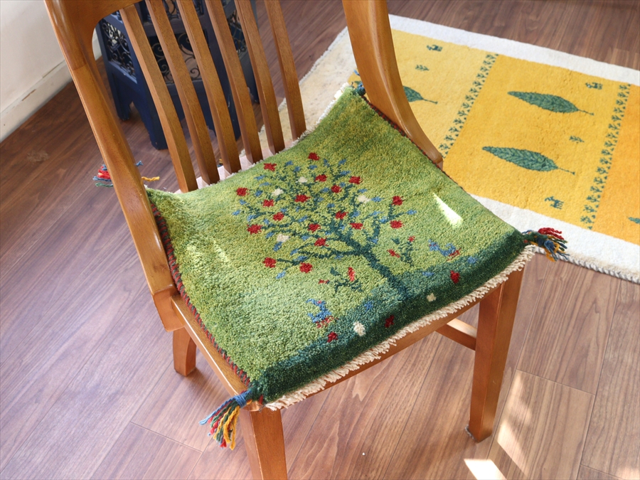 ギャッベ イラン産手織り 座布団サイズ 39x44cm グリーン ザクロの実をつけた生命の木
