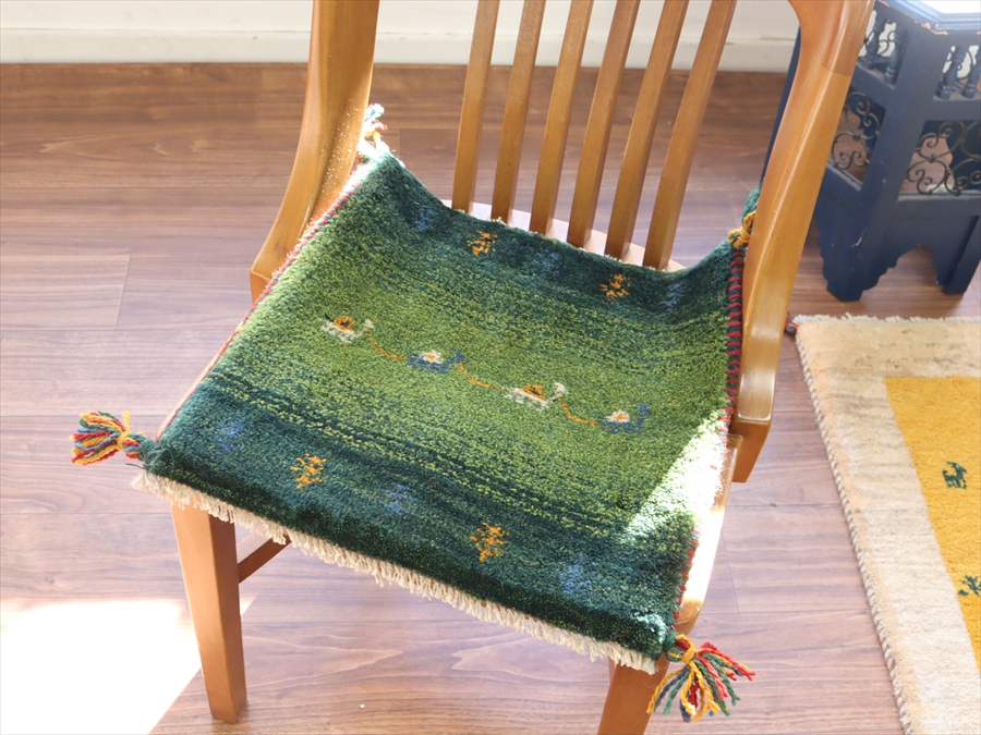 Key:イラン直輸入, GABBEH, ギャッベ, ギャベ, グリーン, 緑, 手織り, 手紡ぎ, ウール, 天然素材, ポンポン, 座布団, バザールギャッベ, ハンドメイド, 一点もの, 現品販売,ガラタバザール, 東京中野区