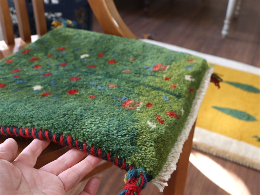 Key:イラン直輸入, GABBEH, ギャッベ, ギャベ, グリーン, 緑, 手織り, 手紡ぎ, ウール, 天然素材, ポンポン, 座布団, バザールギャッベ, ハンドメイド, 一点もの, 現品販売,ガラタバザール, 東京中野区