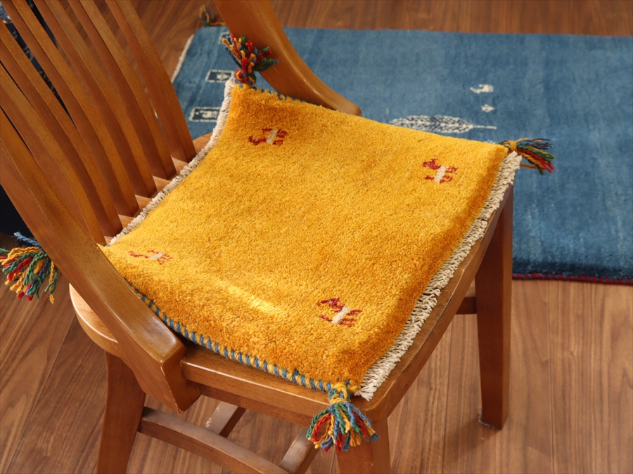 ギャッベ イラン産手織り 座布団サイズ 35x42cm イエローオレンジ シンプル 無地 動物モチーフ