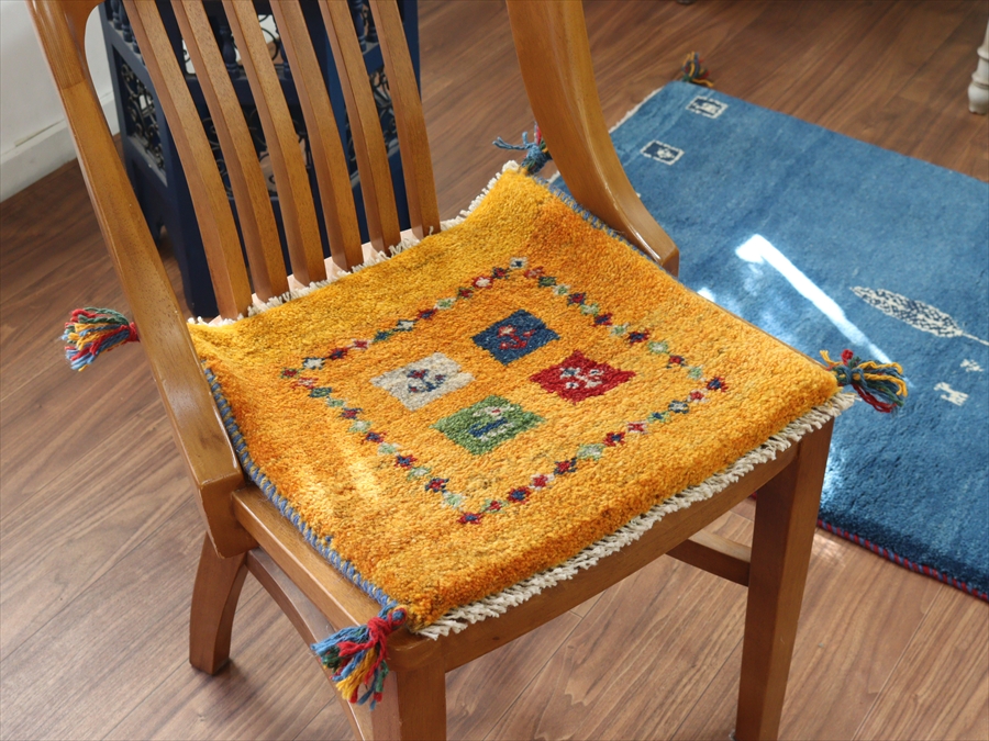 | 何枚も集めたくなる、40cm角の座布団サイズギャベ。四隅に大きなポンポンのついた、伝統的なスタイルでおられています。フローリングに並べて座布団がわりに使ったり、ベンチやダイニングチェアの座面など、使い方はいろいろ。壁にタペストリーのように飾るのもおすすめです。 |