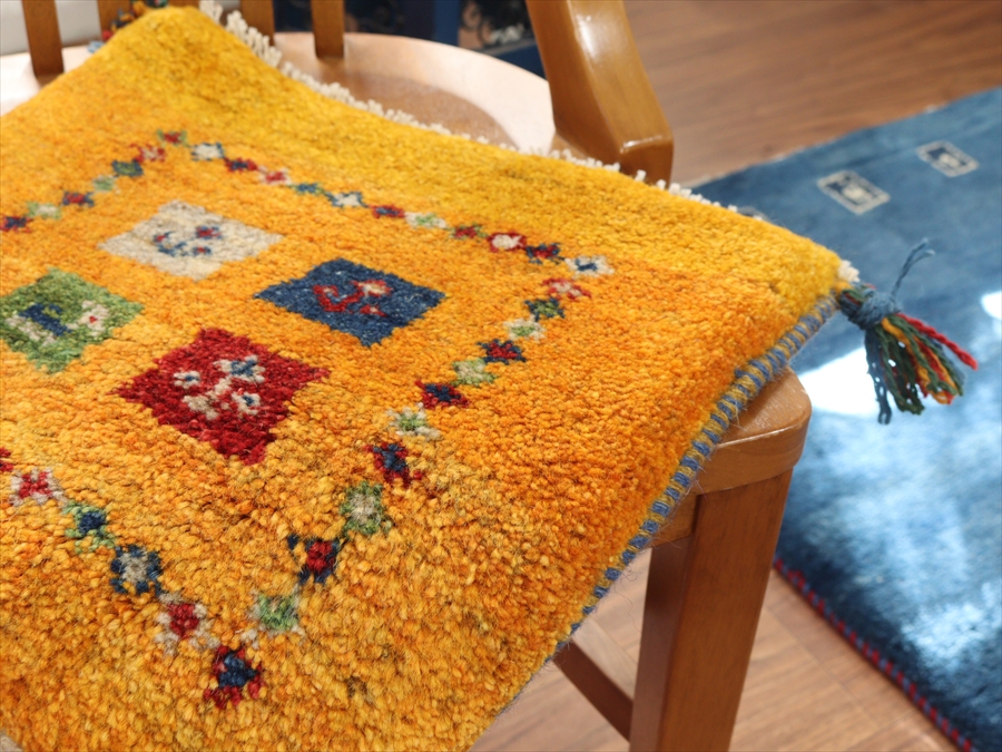 ギャッベ イラン産手織り 座布団サイズ 38x41cm イエローオレンジ カラフルなタイルモチーフ
